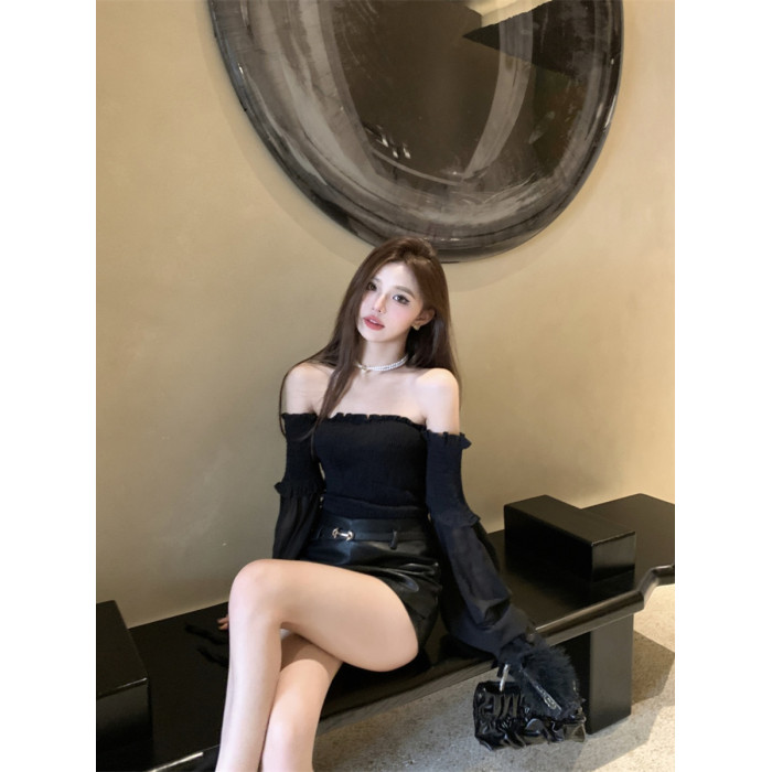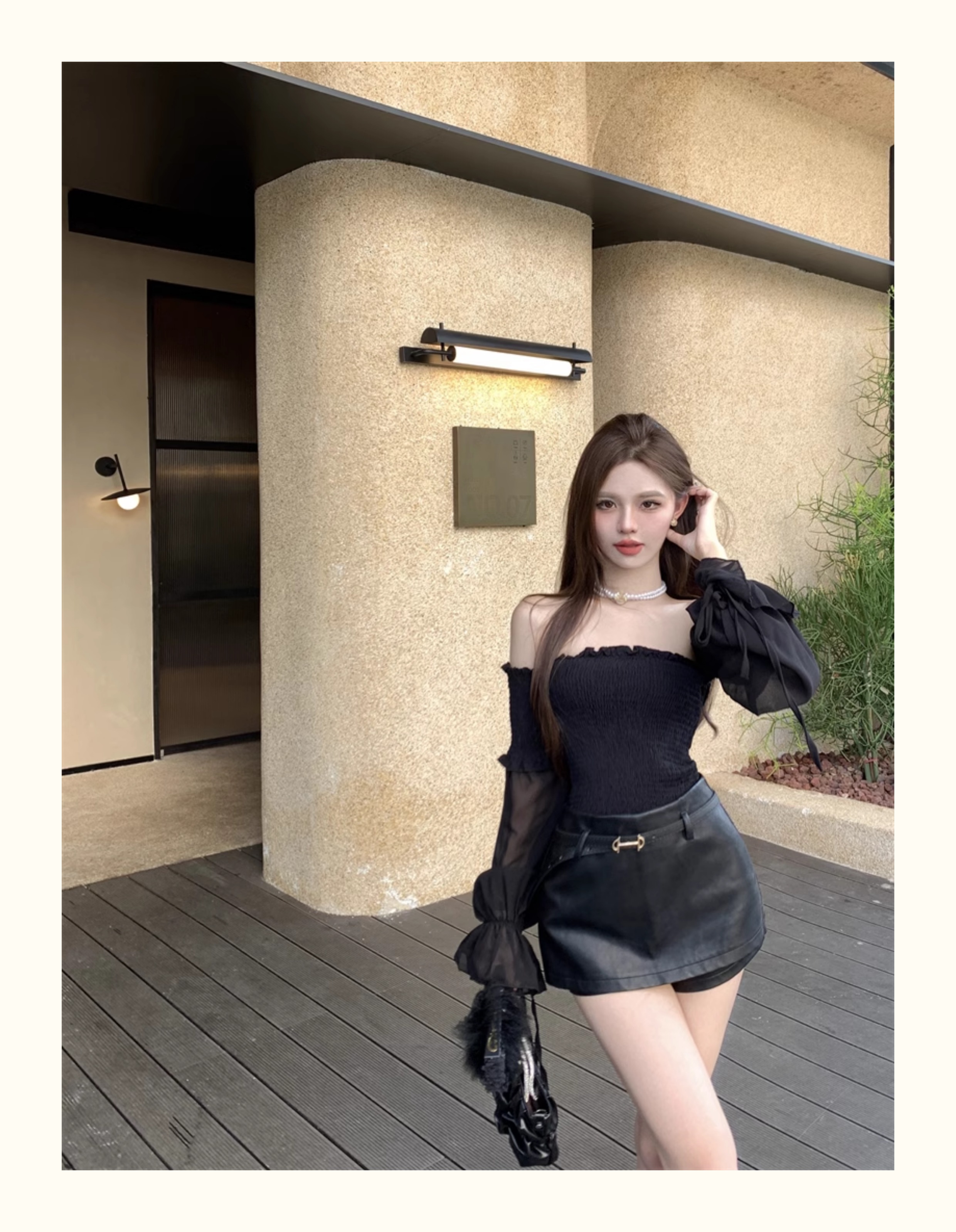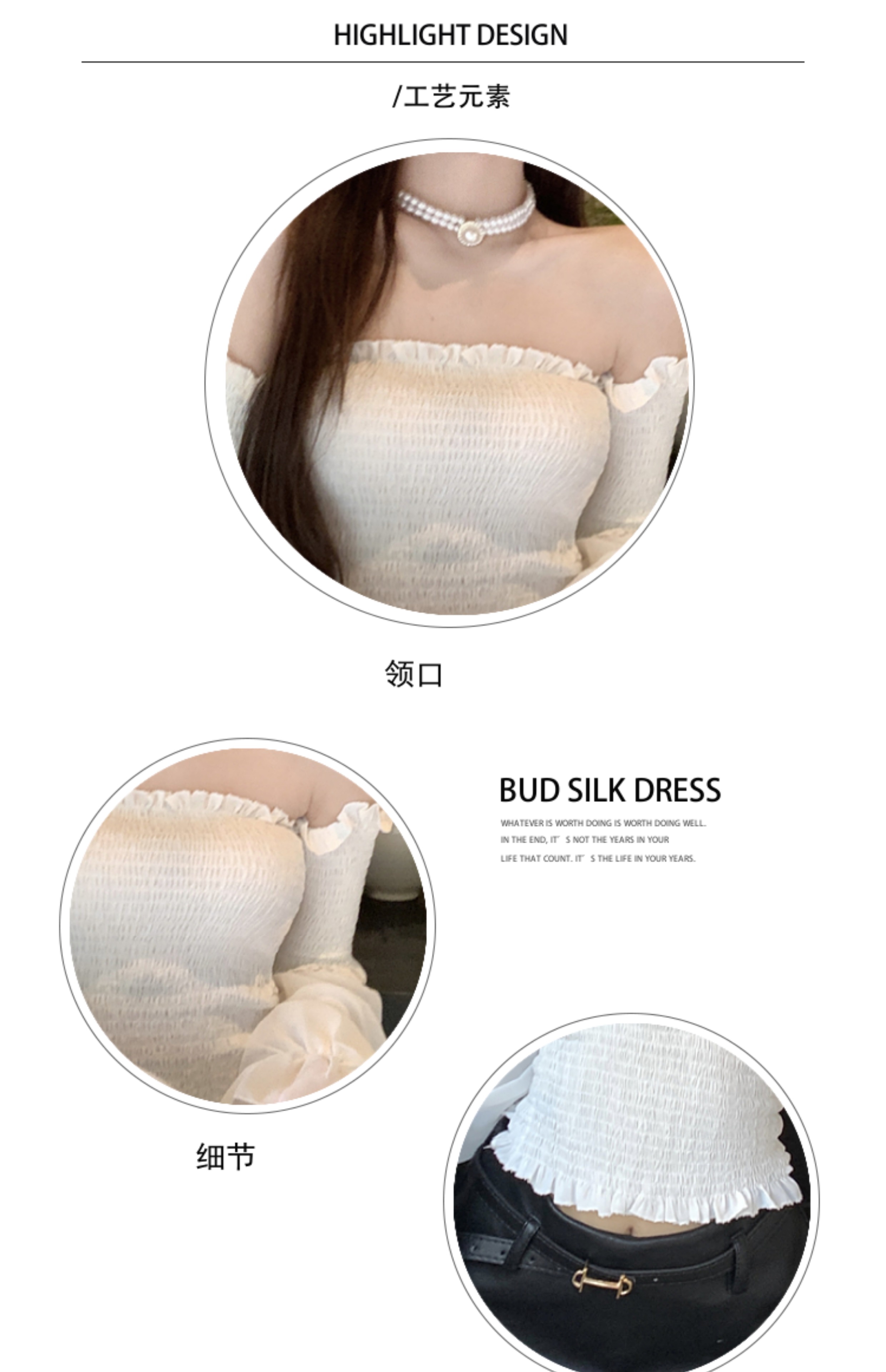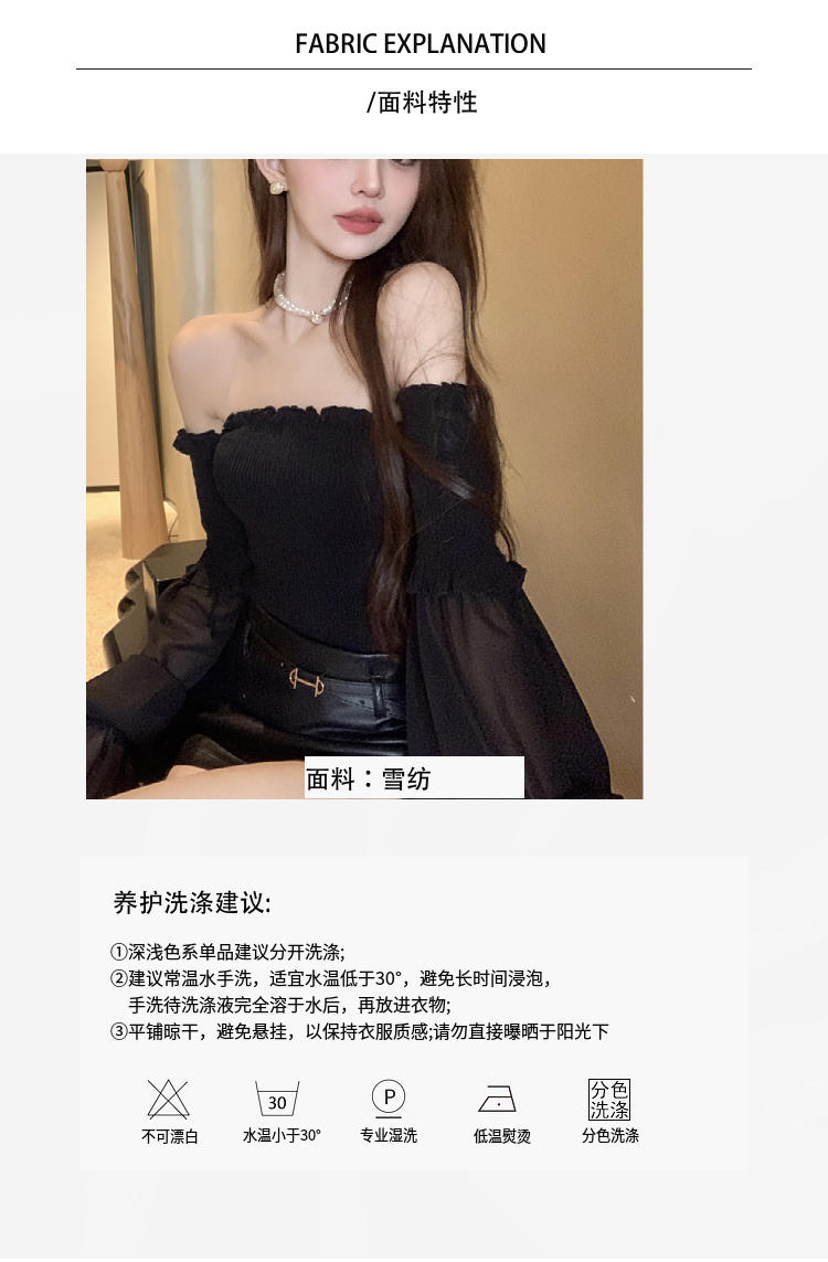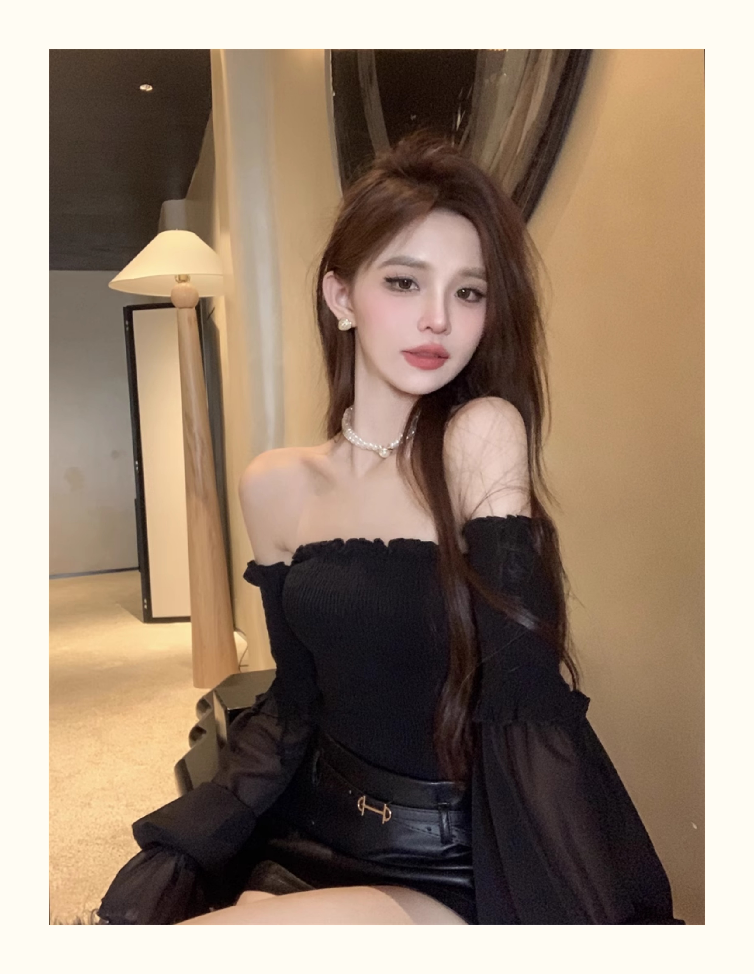 度假一字肩雪紡襯衫女夏設計感泡泡袖修身顯瘦抹胸絕美鎖骨上衣潮