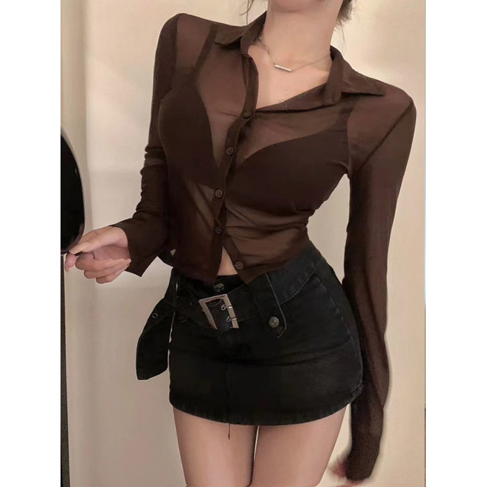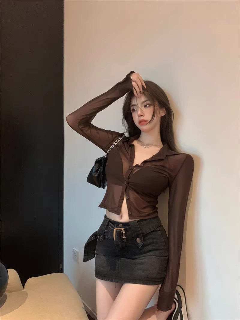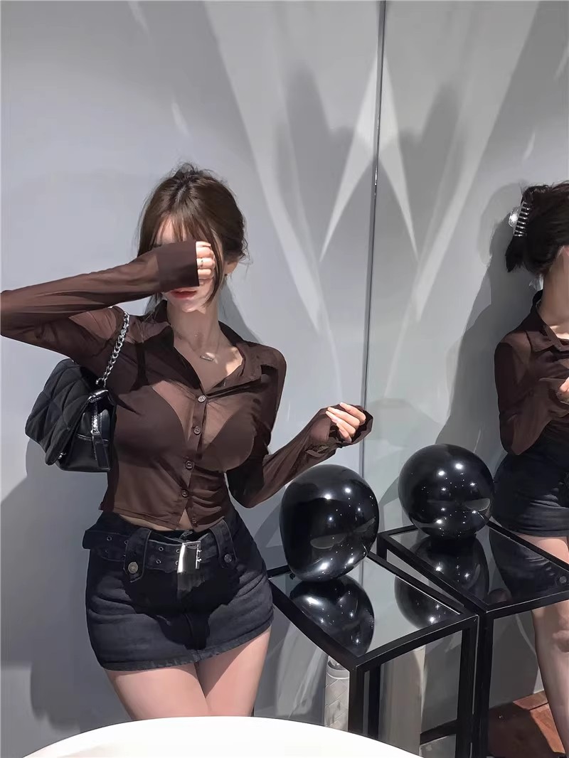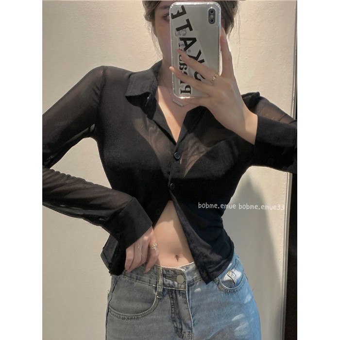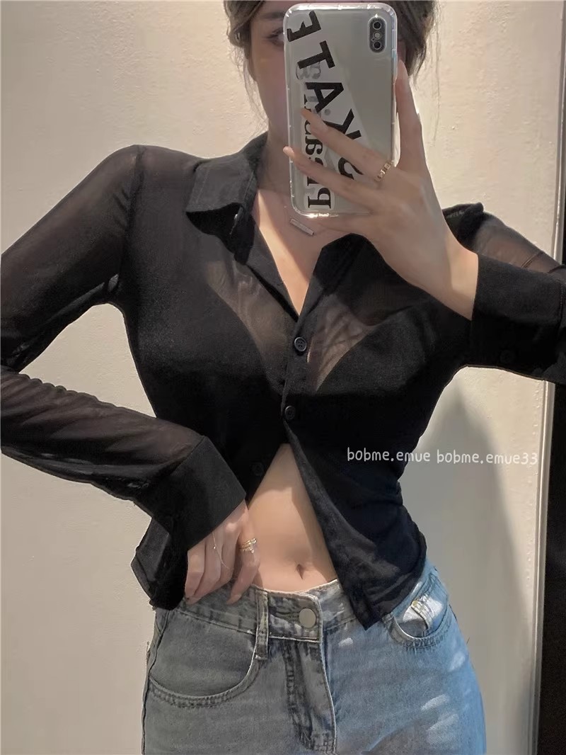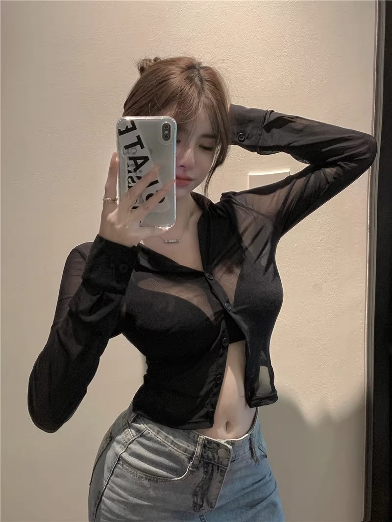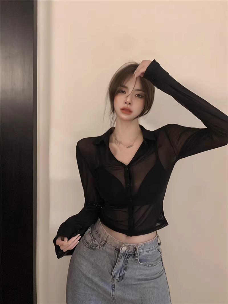 甜辣妹黑色防曬開衫女夏季薄款吊帶外搭罩衫修身長袖襯衫網紗上衣