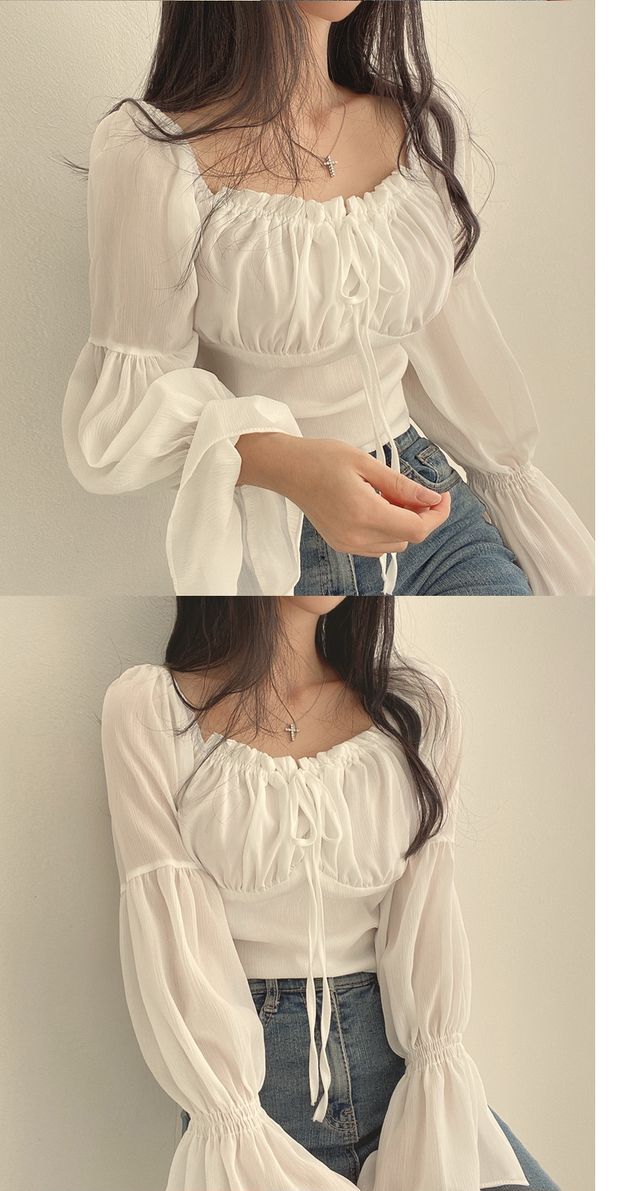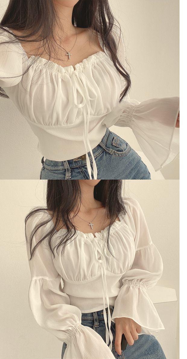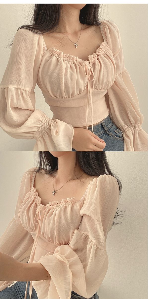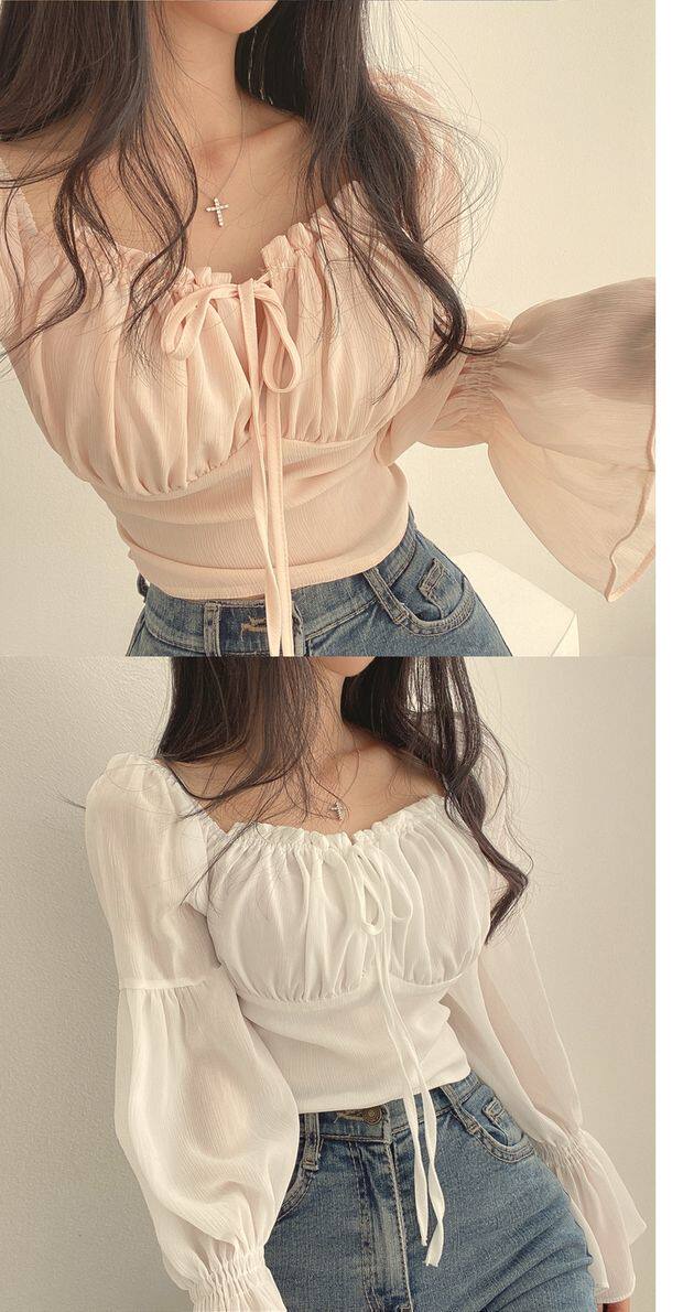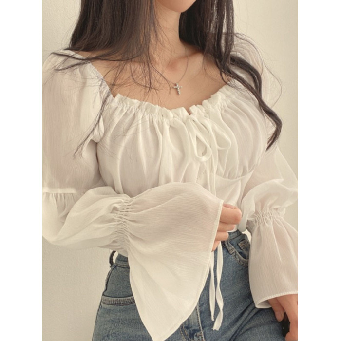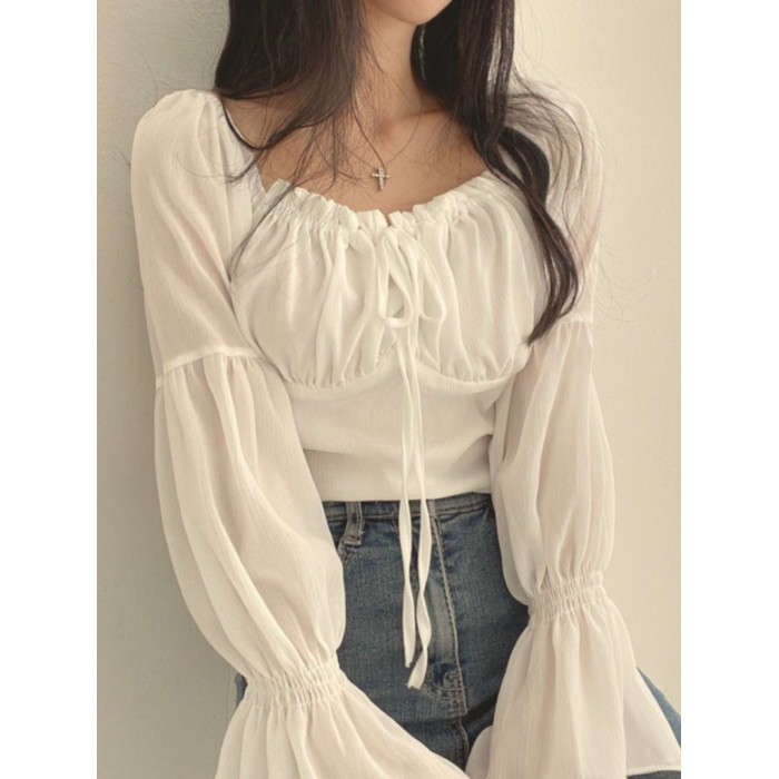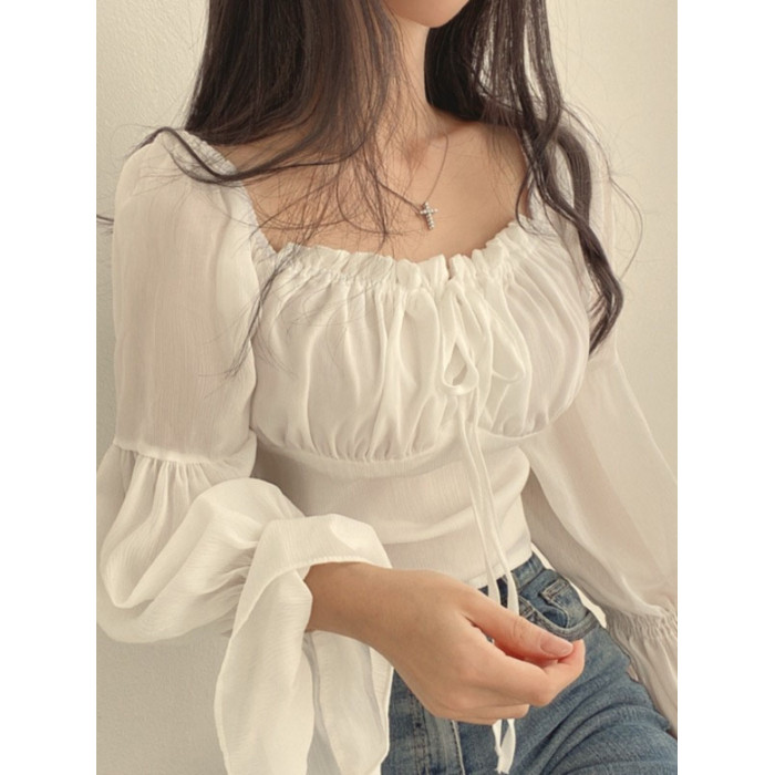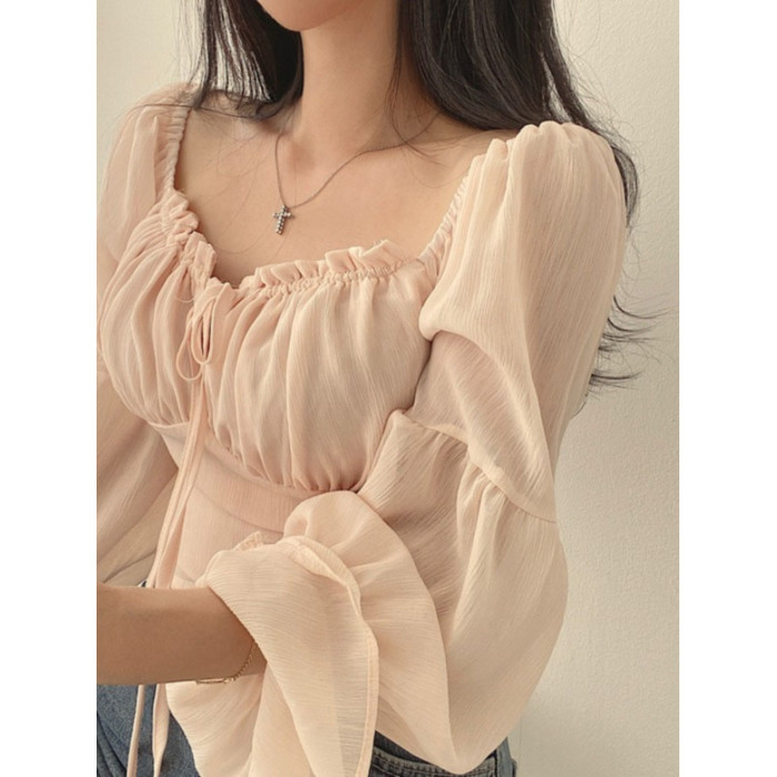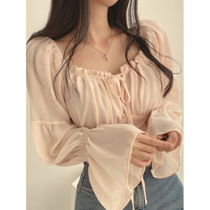 chic早春法式小衆木耳邊系帶方領收腰喇叭袖雪紡衫洋氣短款襯衫女