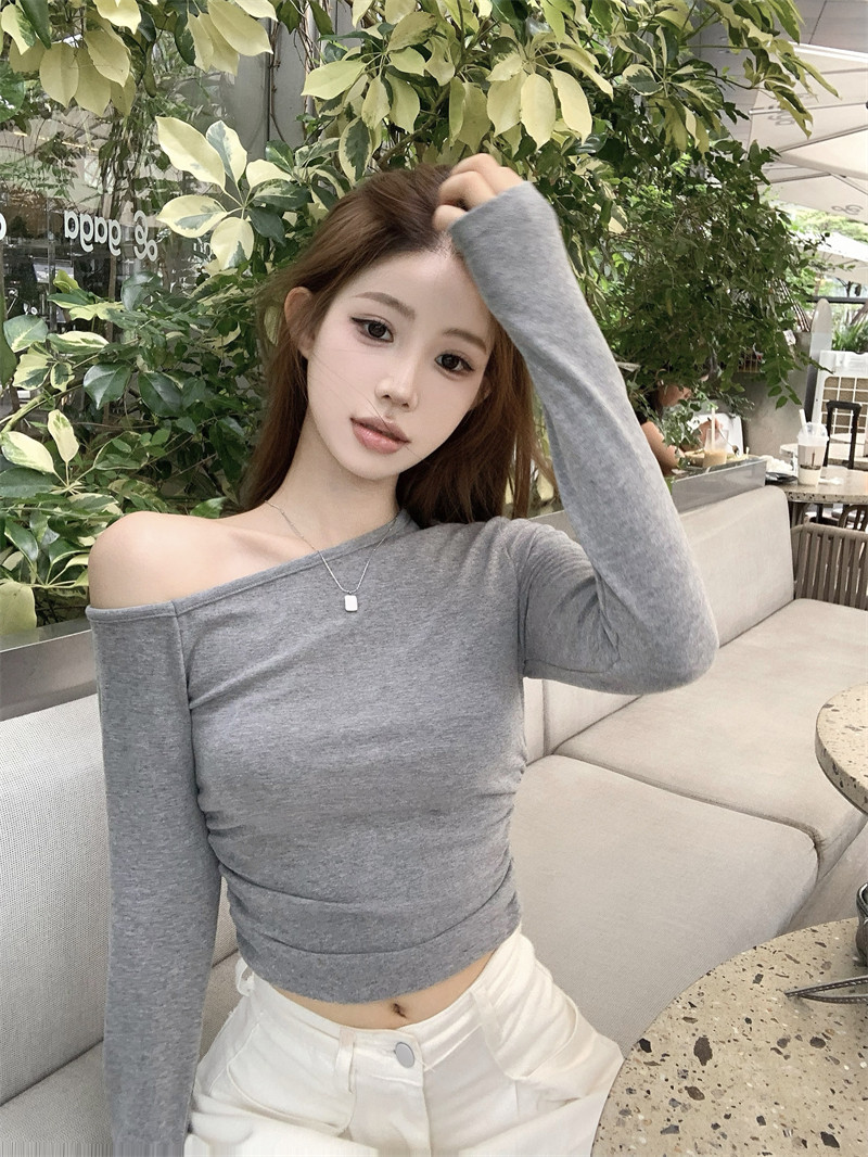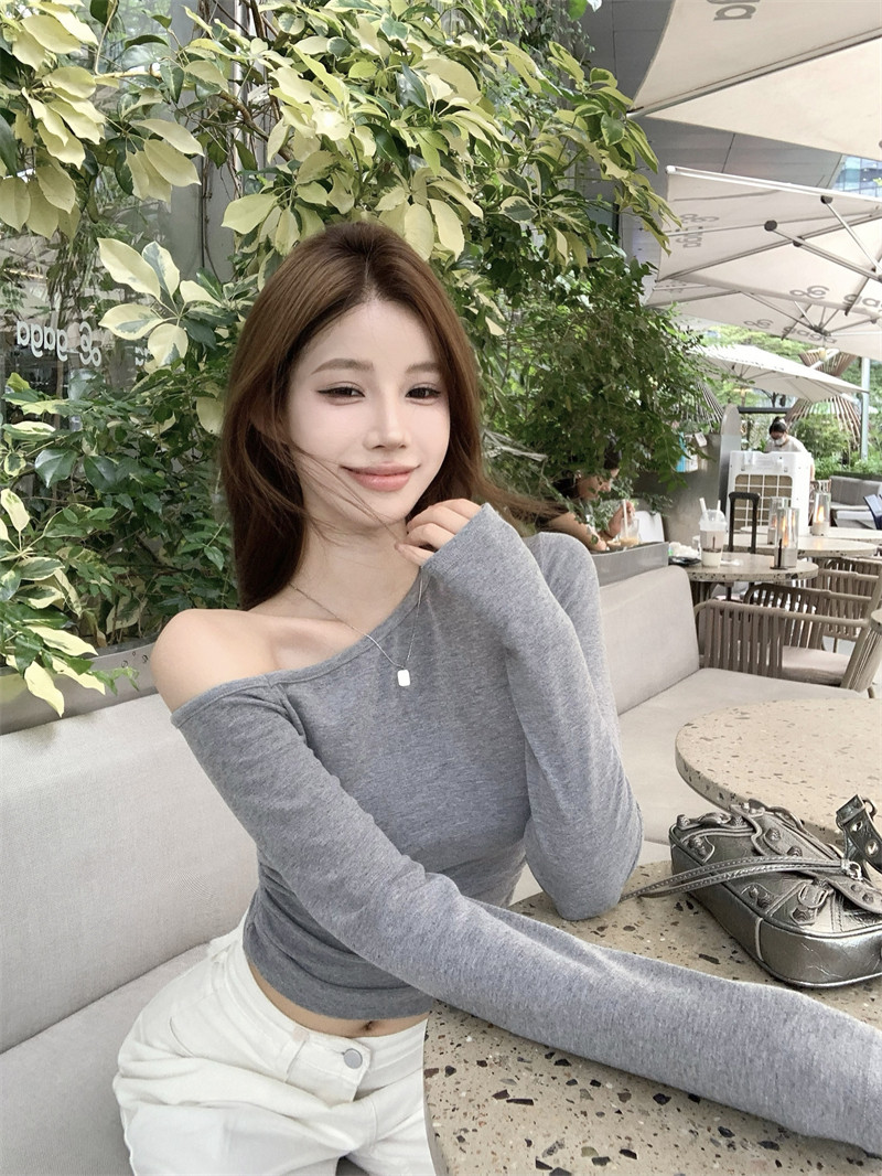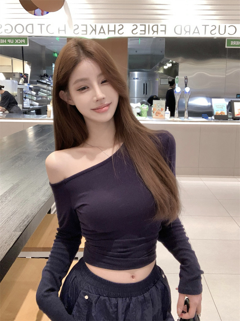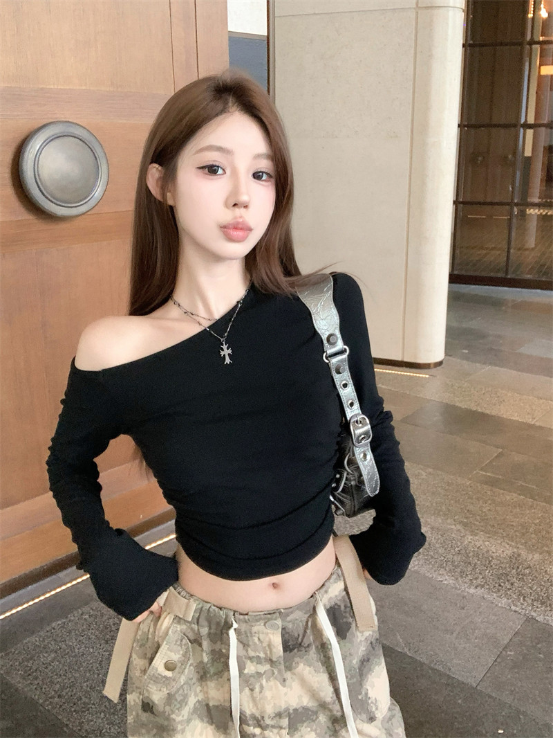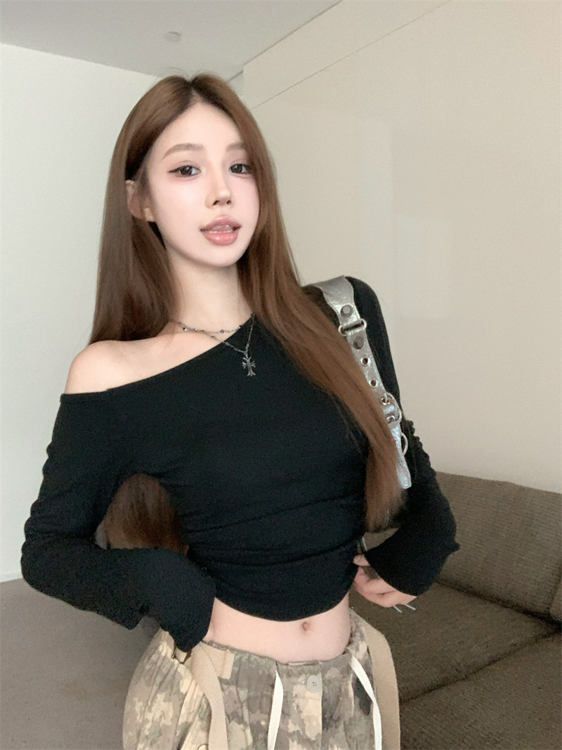 ins辣妹不規則斜肩長袖t恤女春季新款小個子修身性感顯瘦短款上衣
