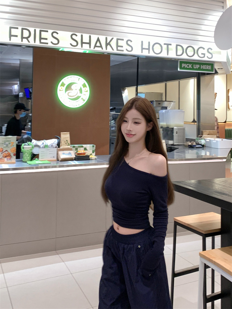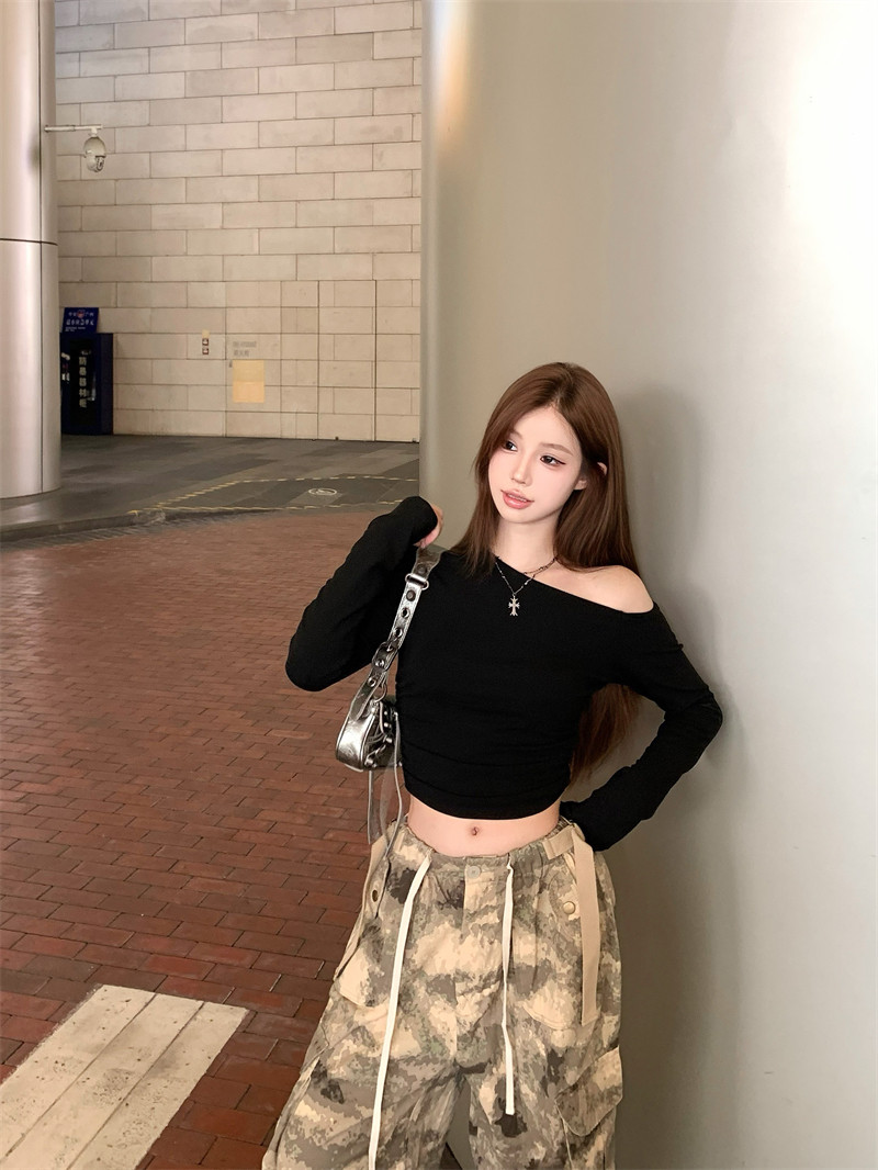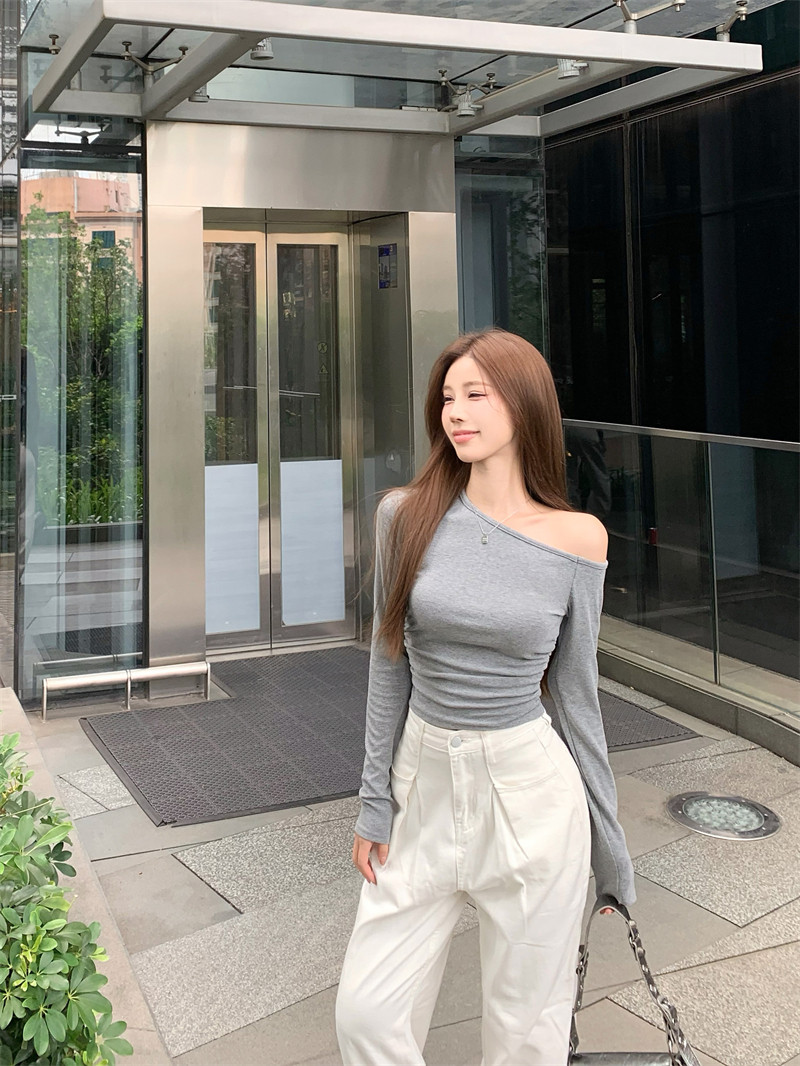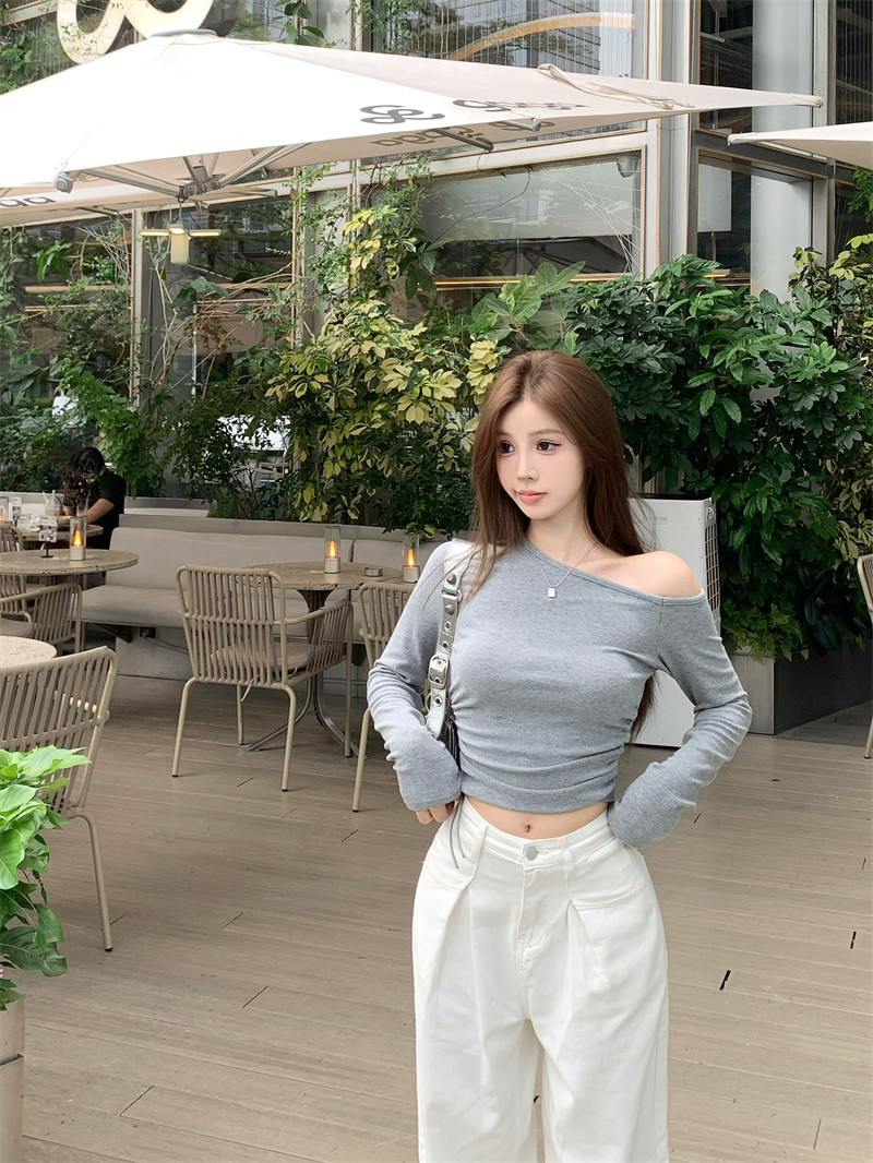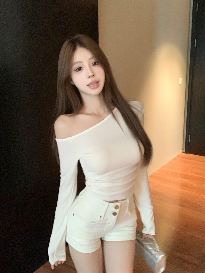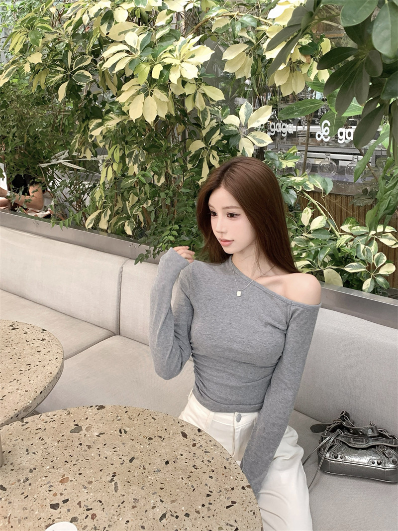 ins辣妹不規則斜肩長袖t恤女春季新款小個子修身性感顯瘦短款上衣