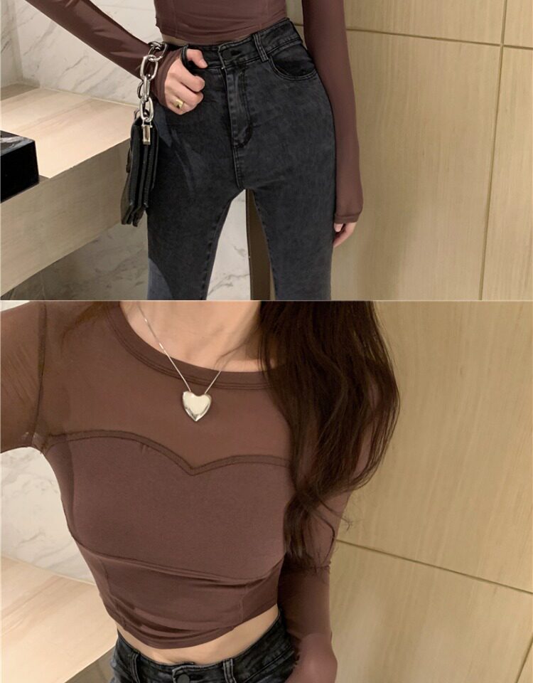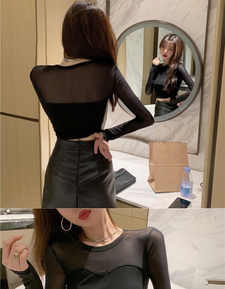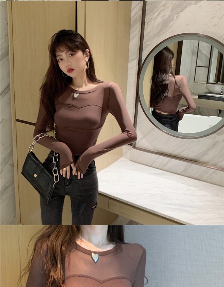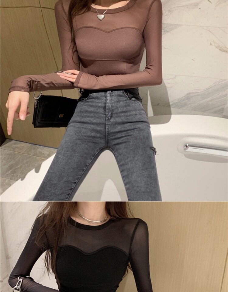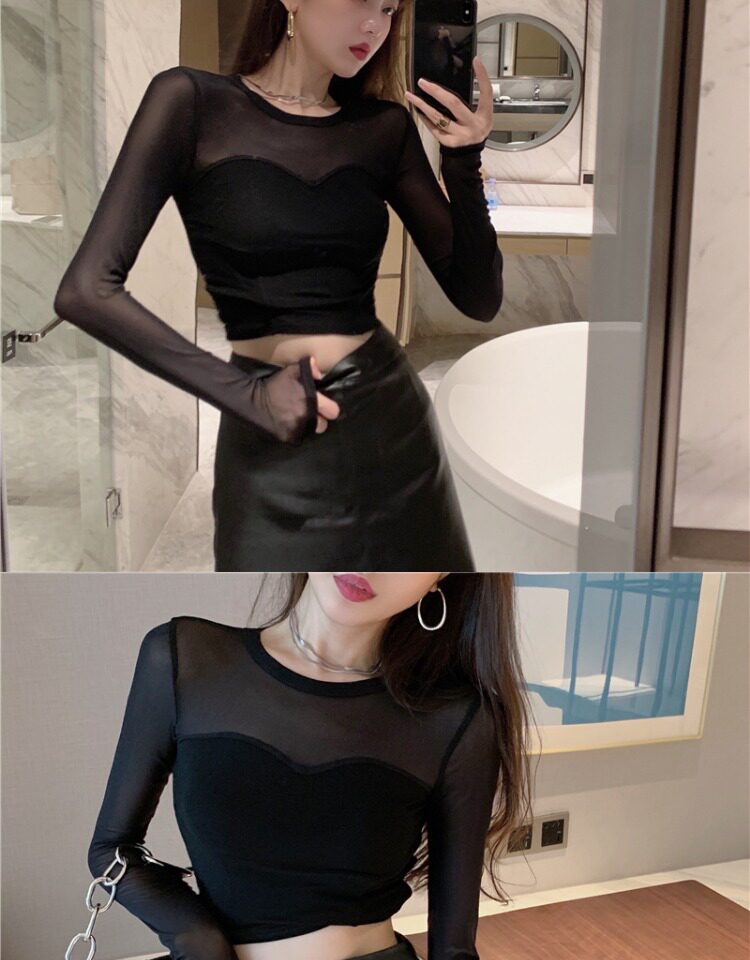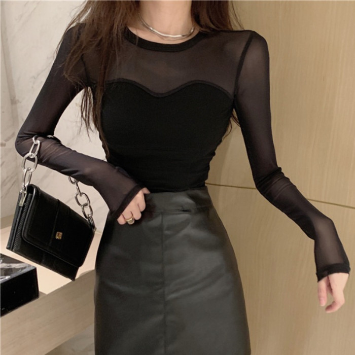 性感辣妹微透網紗拼接打底衫女外穿內搭秋季韓版修身長袖上衣t恤