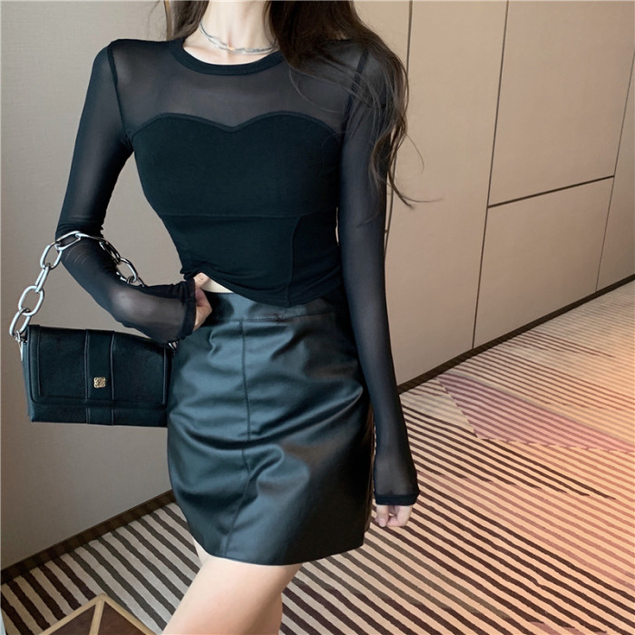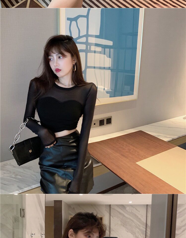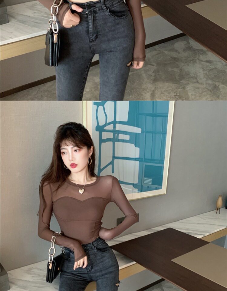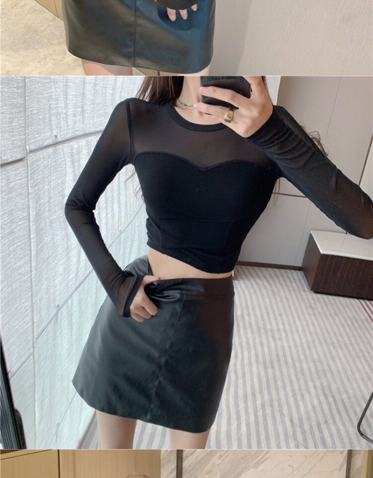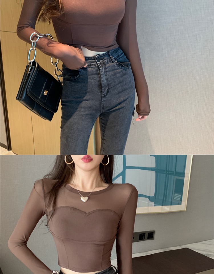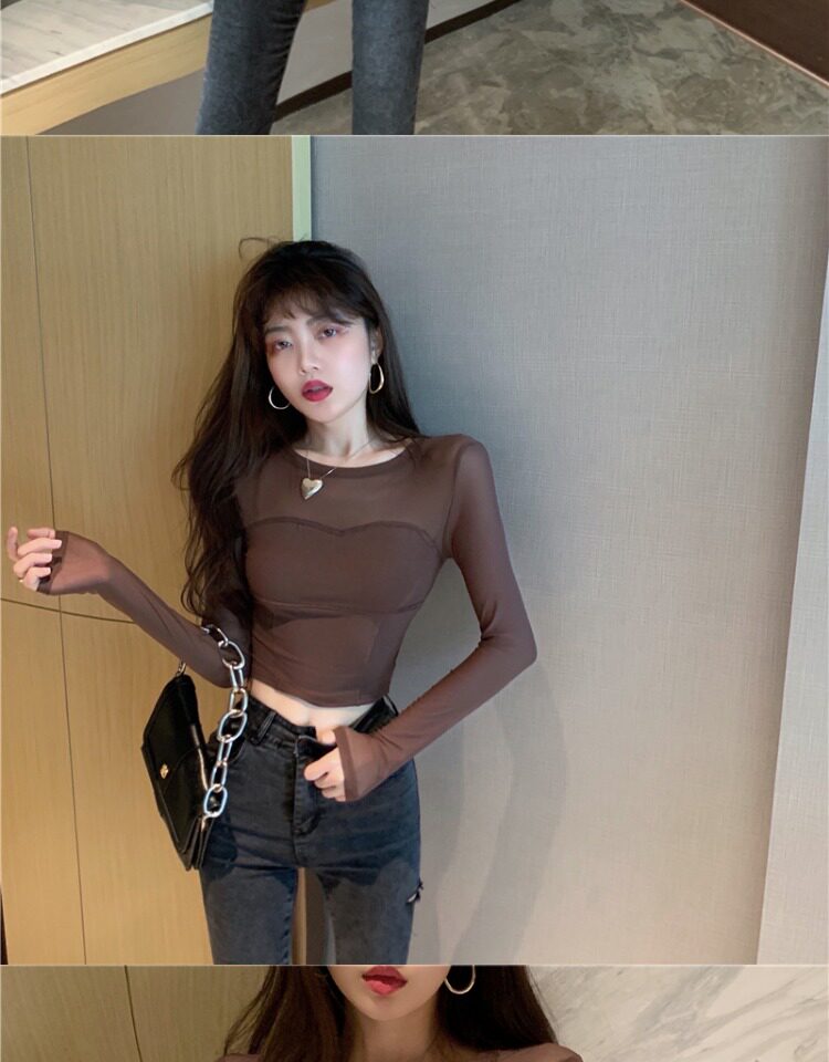 性感辣妹微透網紗拼接打底衫女外穿內搭秋季韓版修身長袖上衣t恤