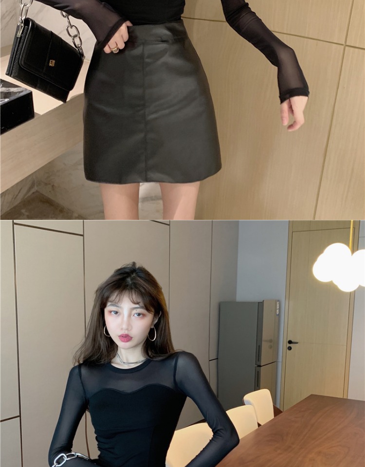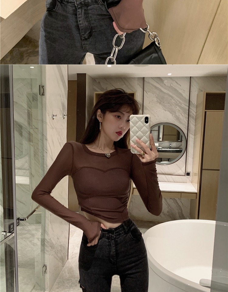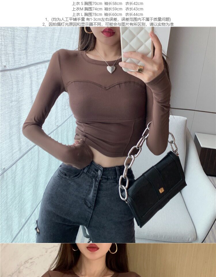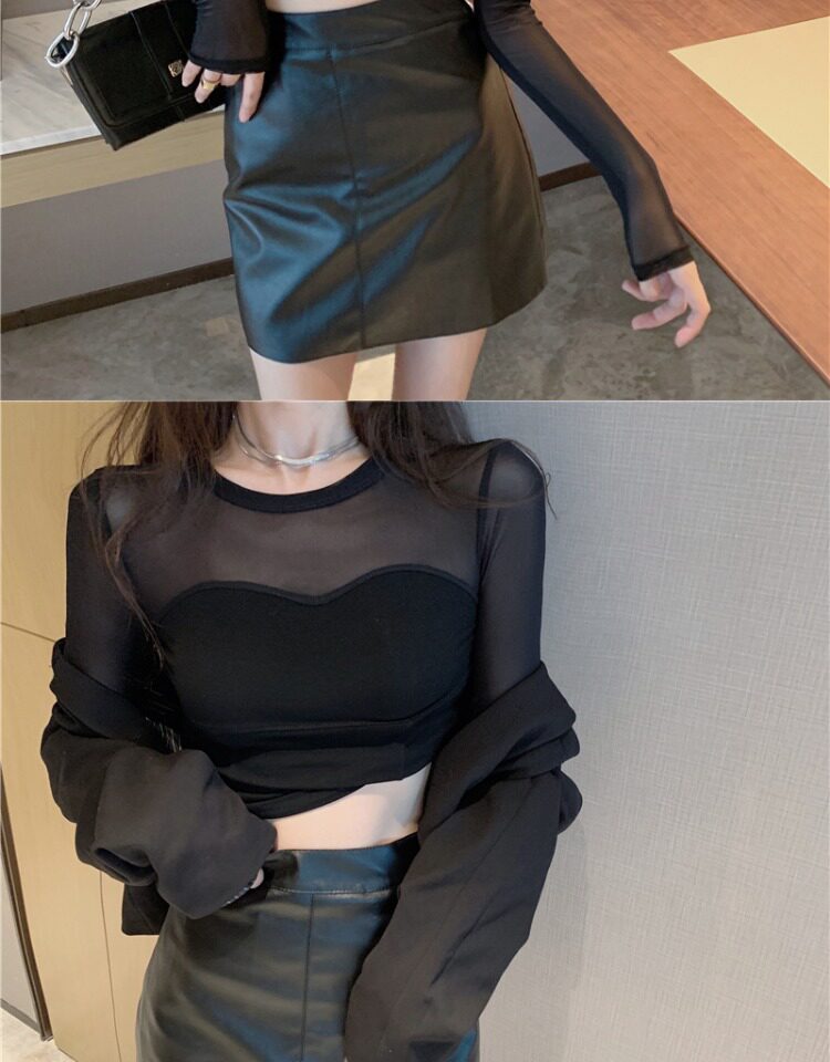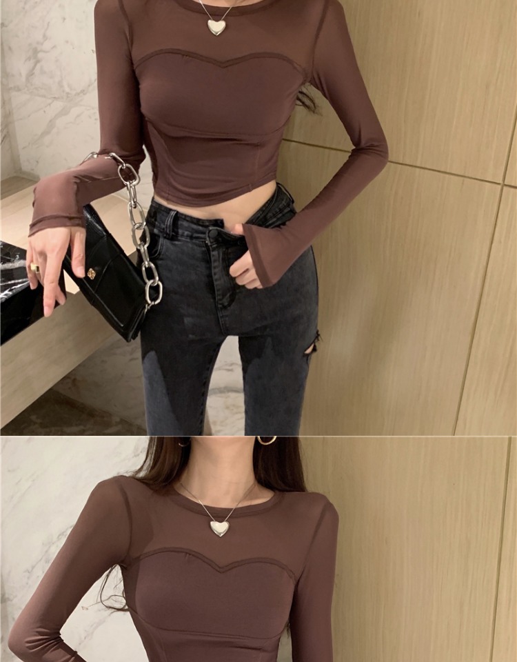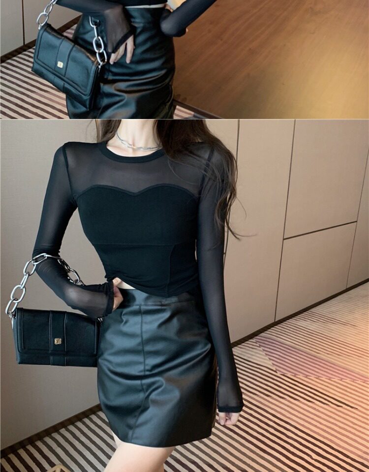 性感辣妹微透網紗拼接打底衫女外穿內搭秋季韓版修身長袖上衣t恤
