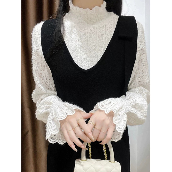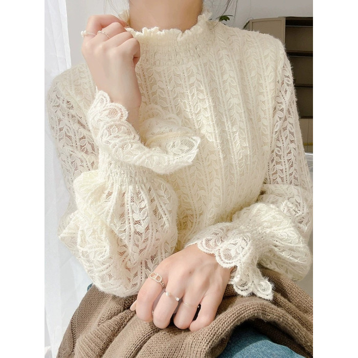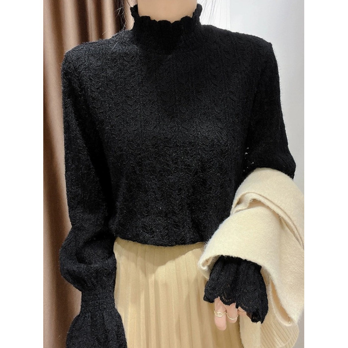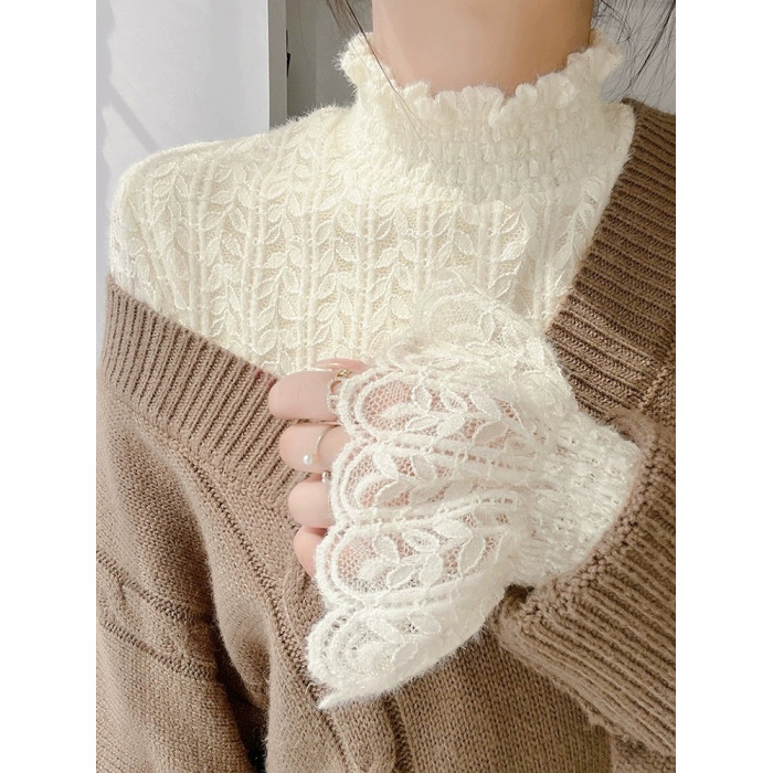 秋冬季半高領蕾絲衫t恤上衣女加絨長袖打底衫洋氣質高檔衣服小衫