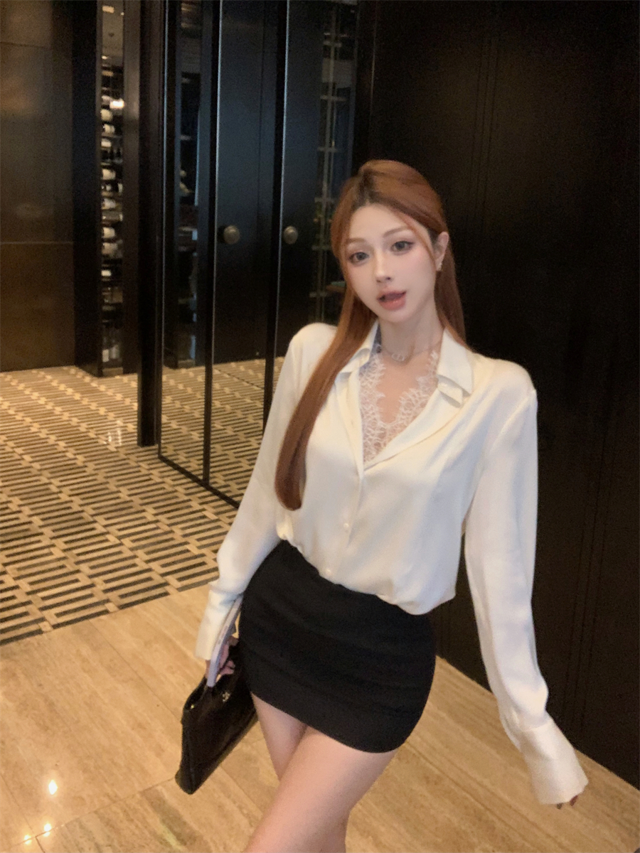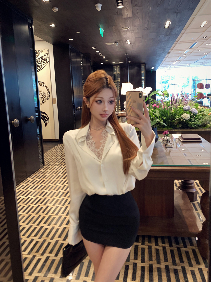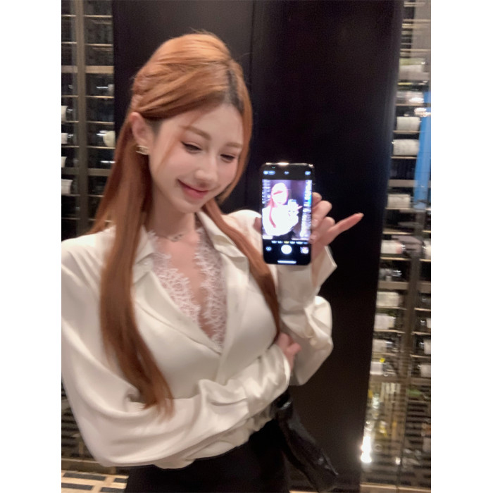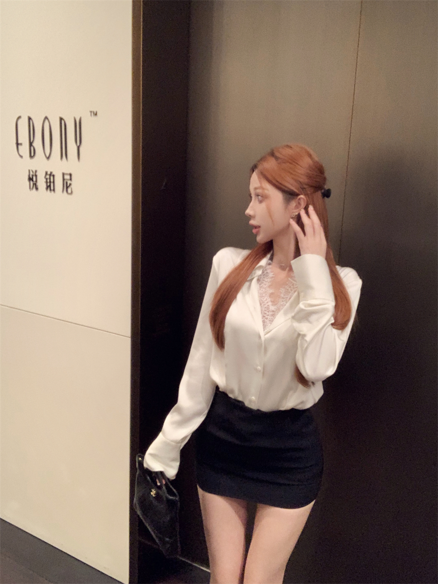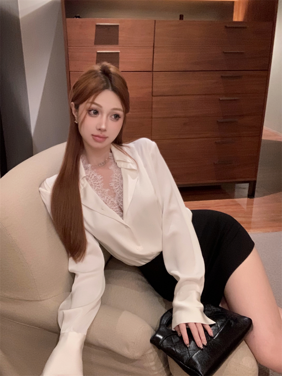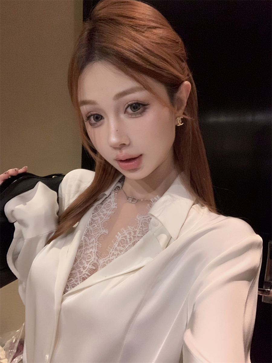 蕾絲假兩件白色襯衫女設計感小衆秋季獨特絕美上衣高級感緞面襯衣