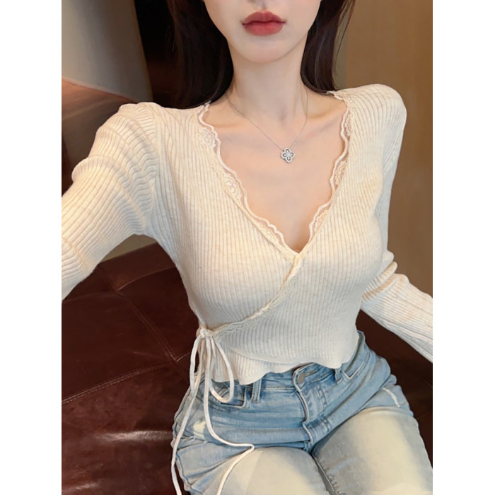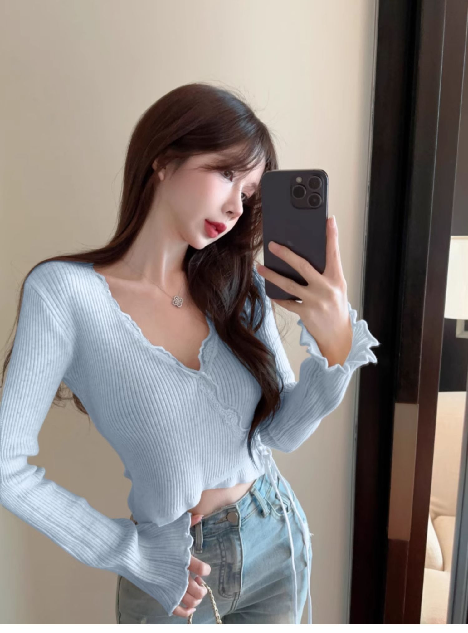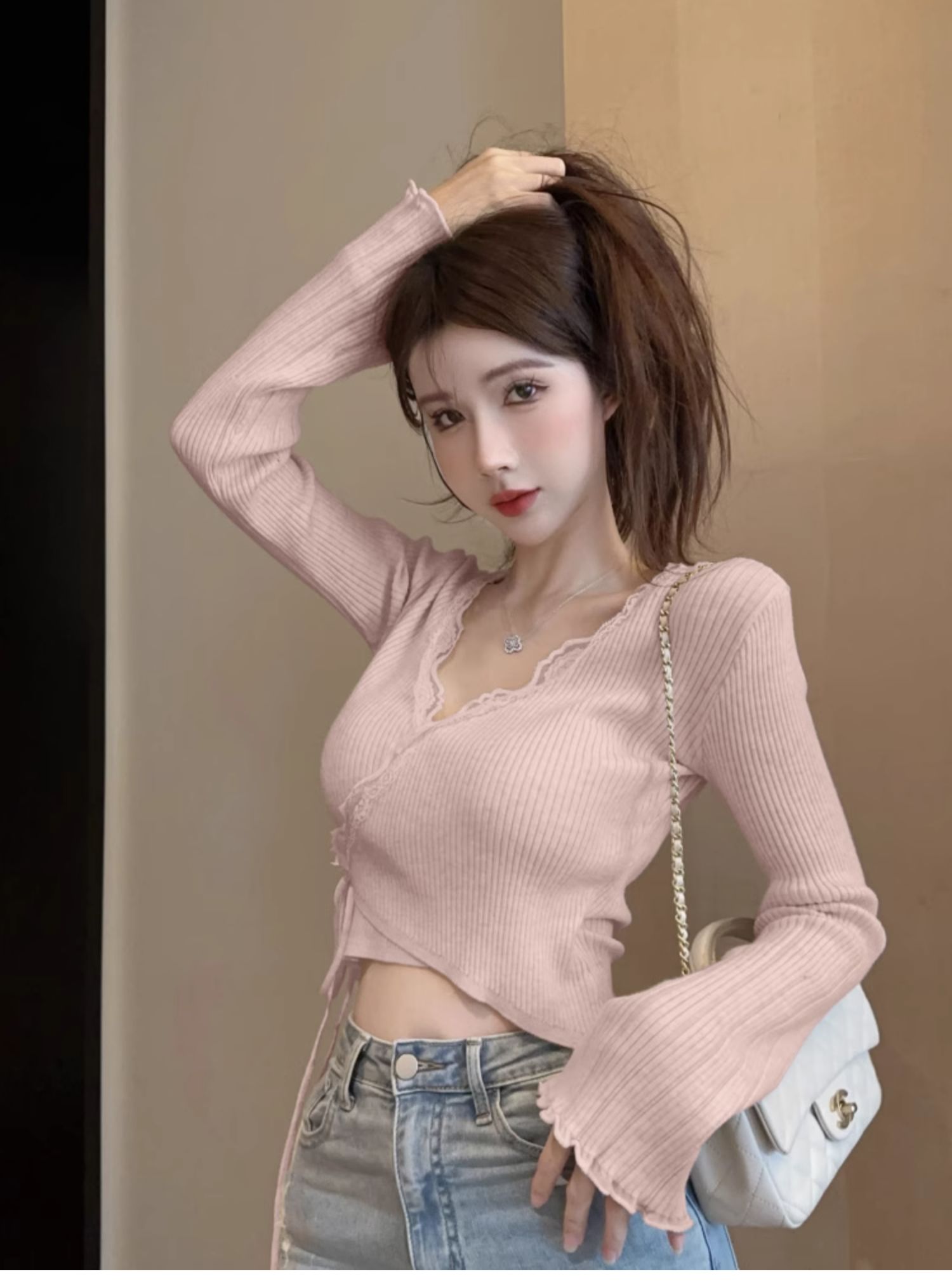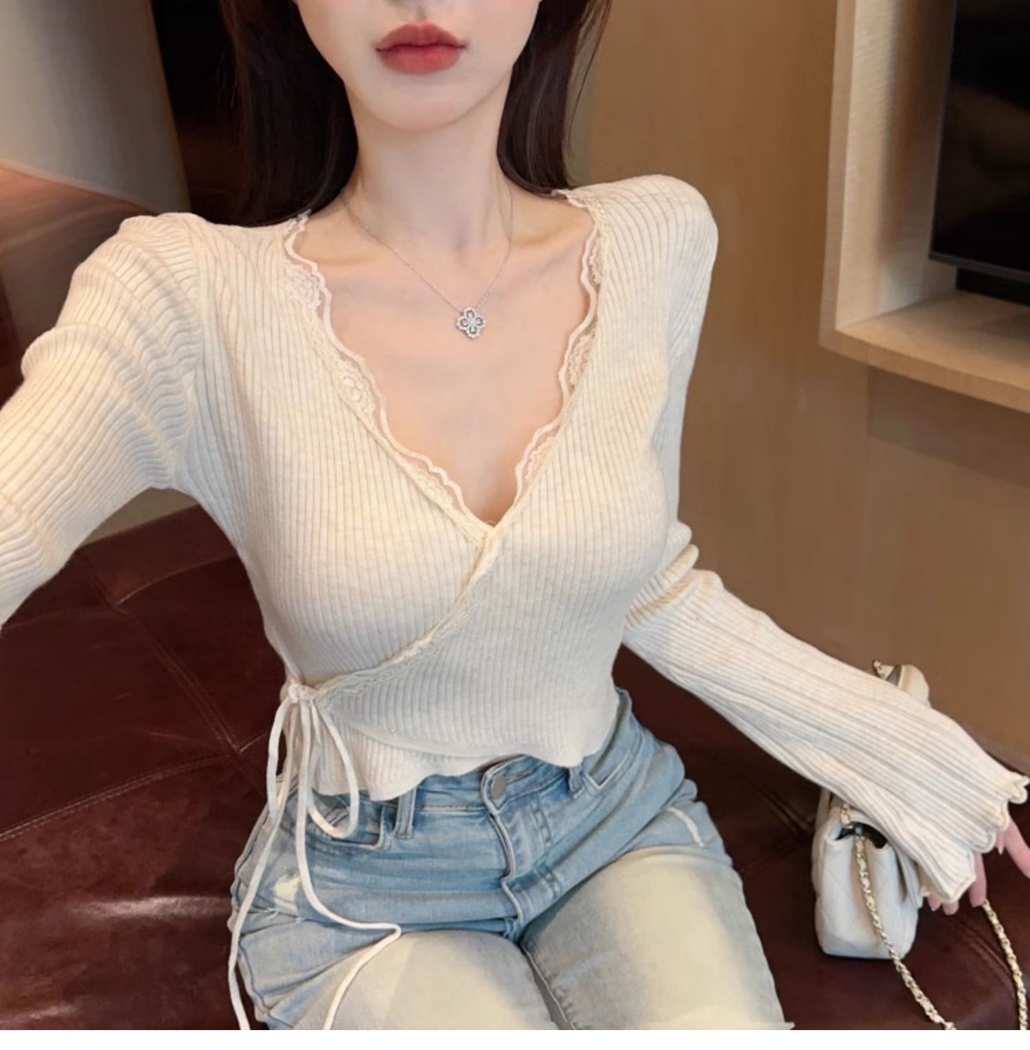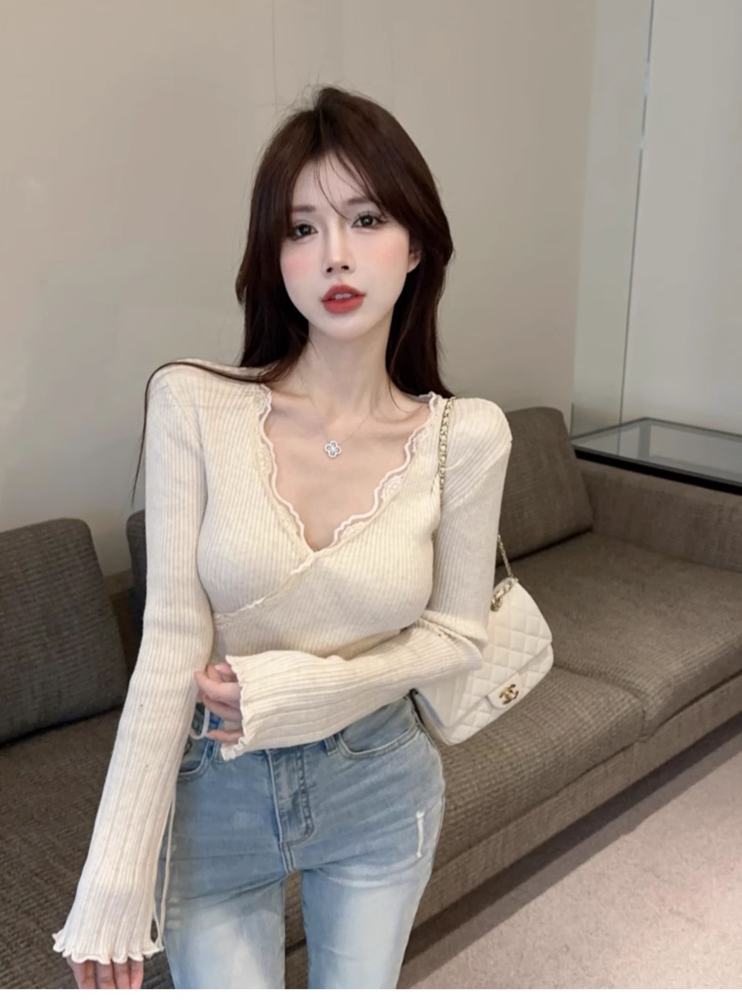 純欲辣妹性感v領短款小上衣女秋冬別致絕美顯身材蕾絲打底衫內搭