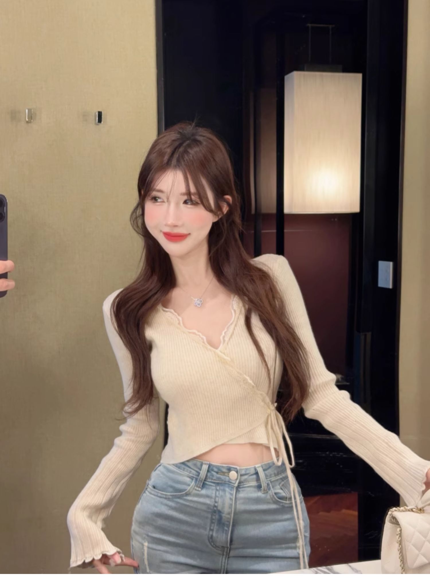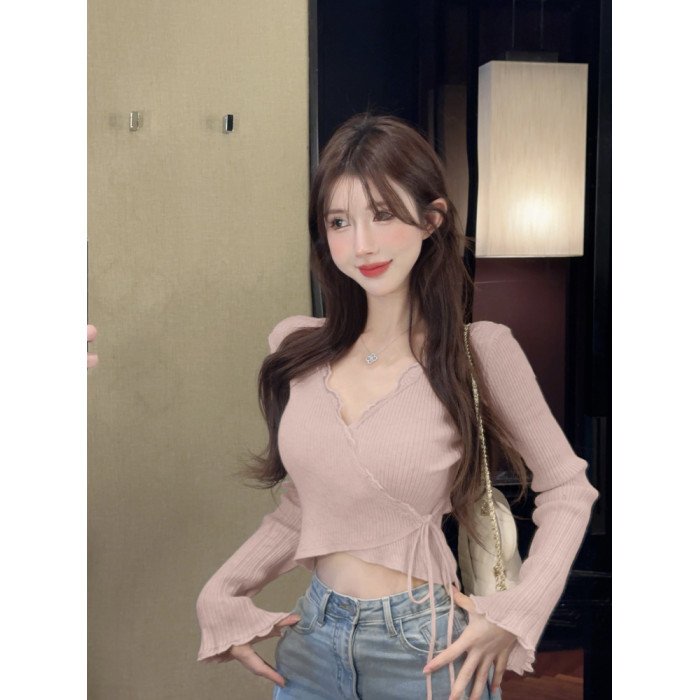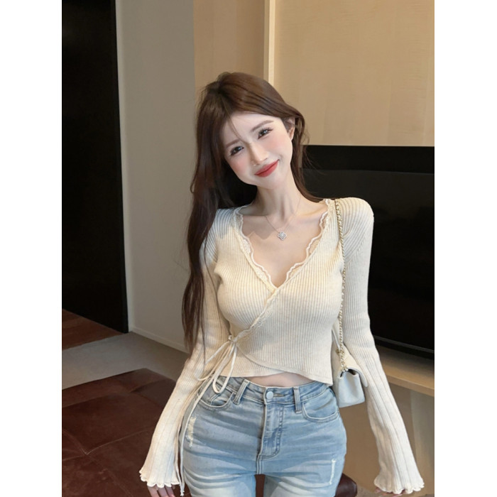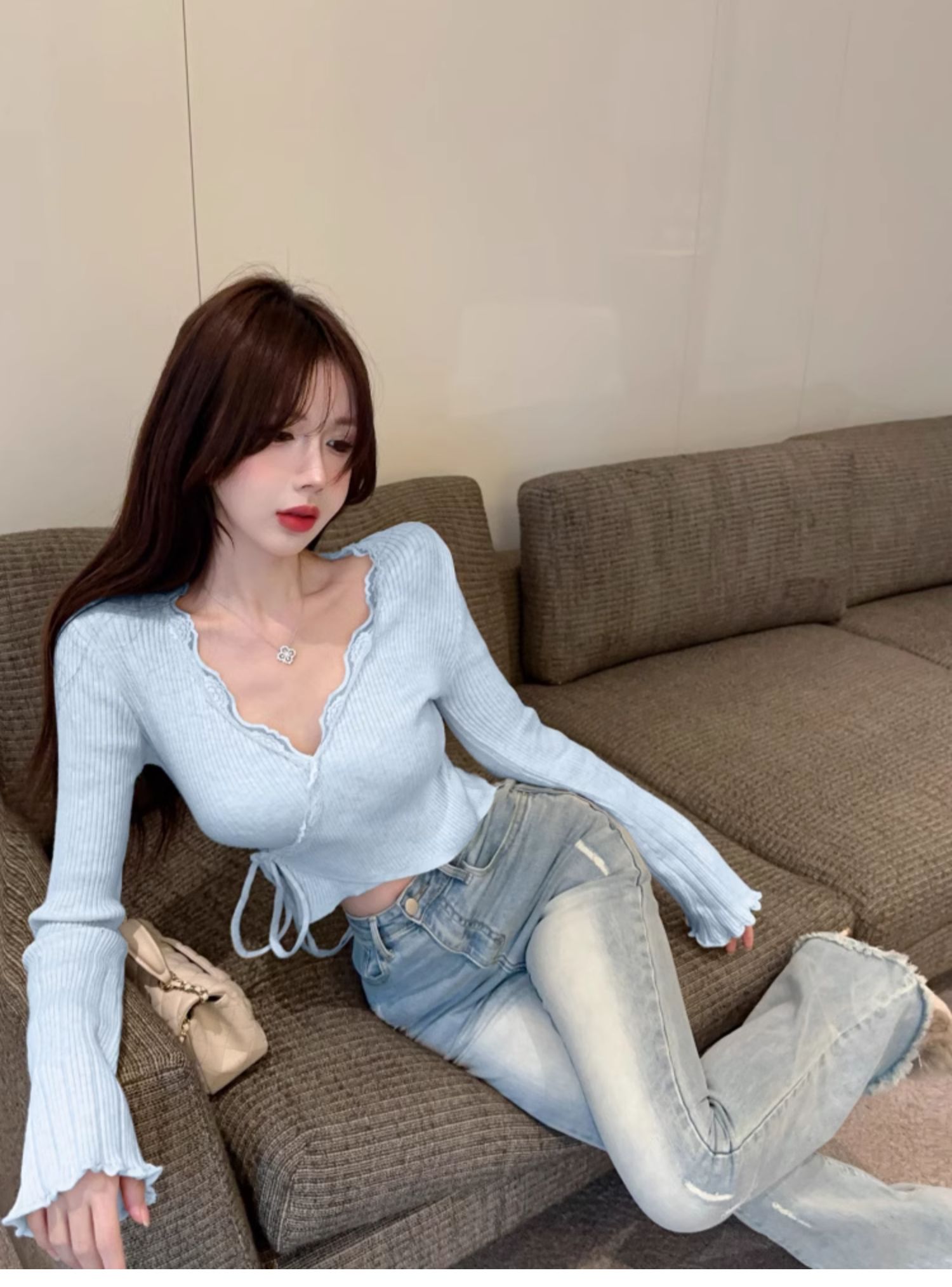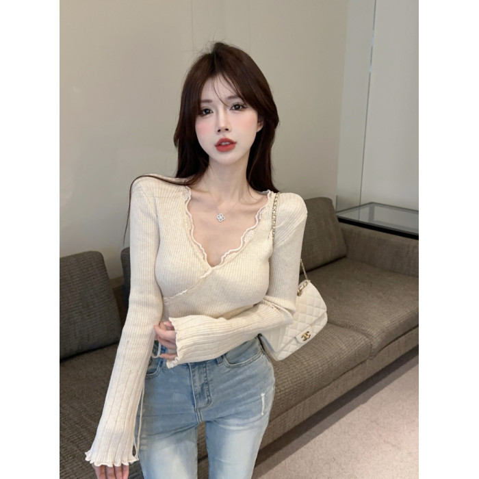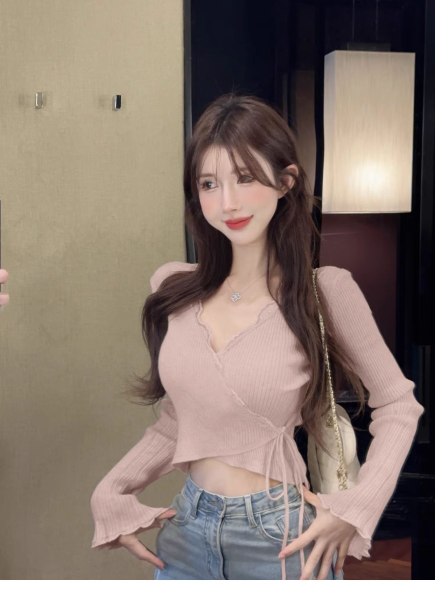 純欲辣妹性感v領短款小上衣女秋冬別致絕美顯身材蕾絲打底衫內搭