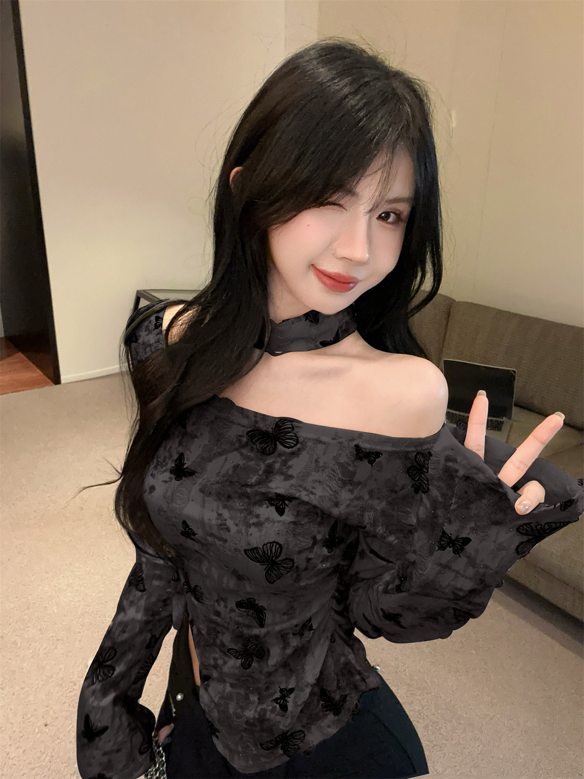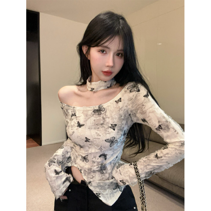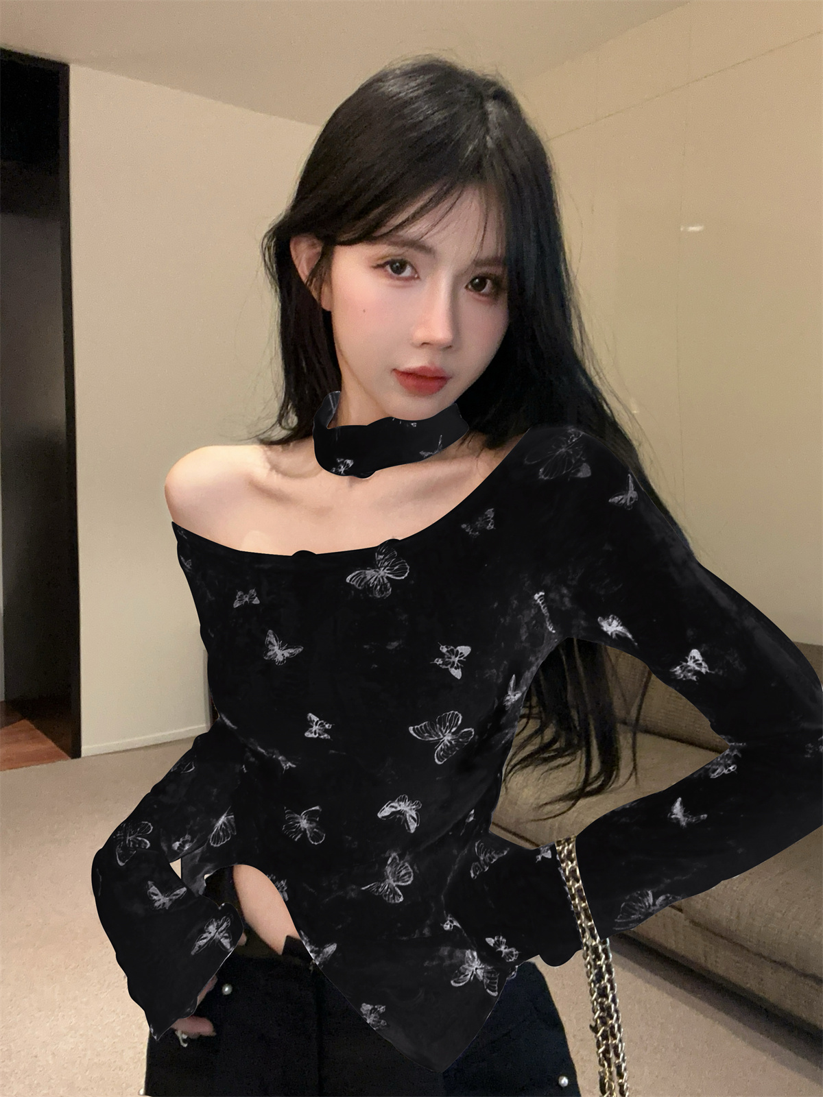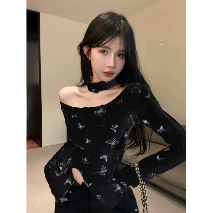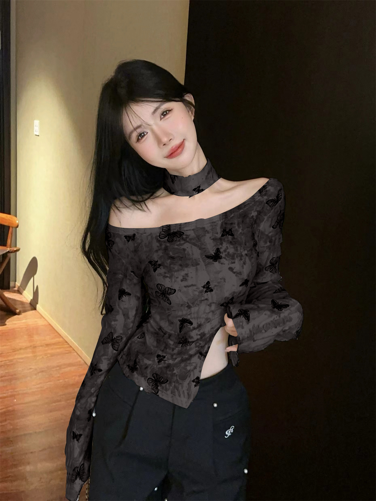 美式辣妹一字肩掛脖上衣女秋冬紥染露肩長袖t恤不規則打底衫內搭