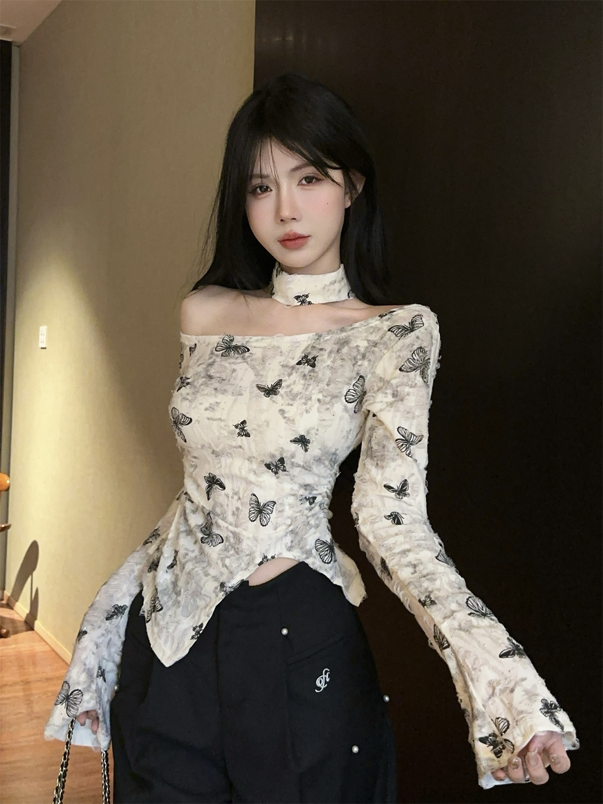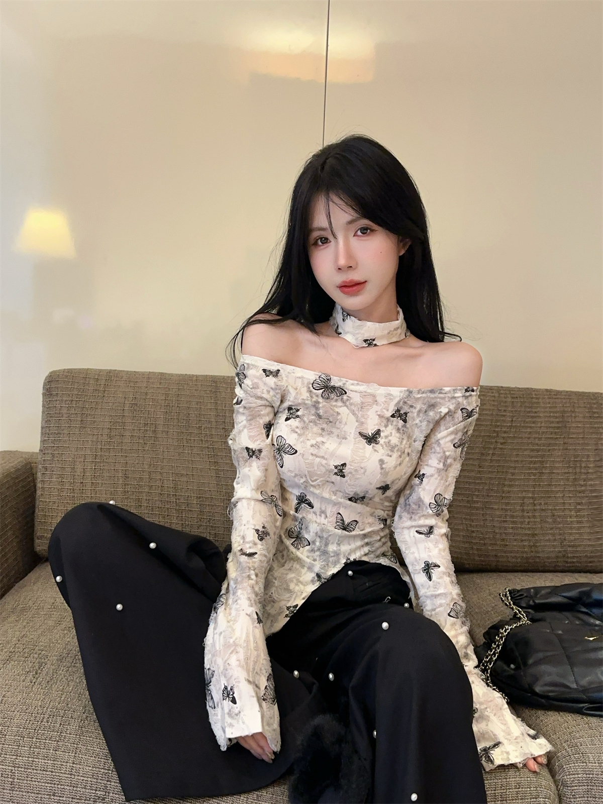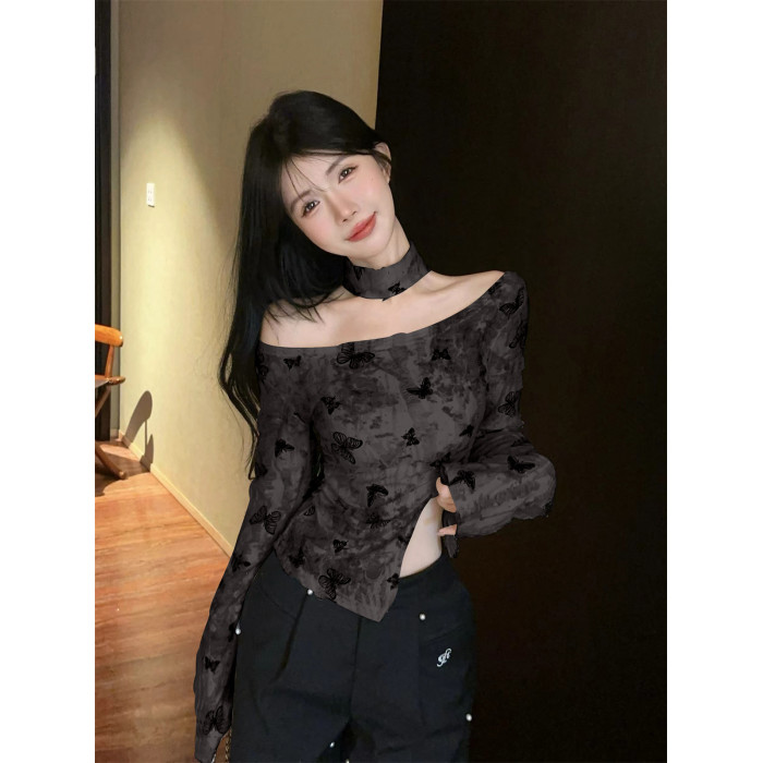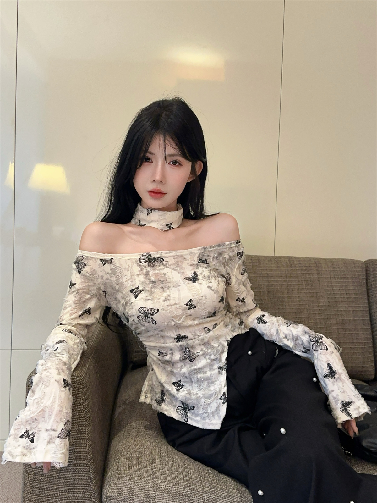 美式辣妹一字肩掛脖上衣女秋冬紥染露肩長袖t恤不規則打底衫內搭