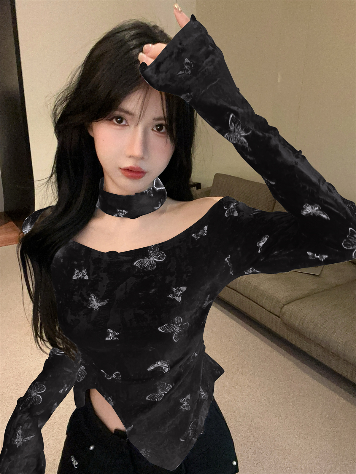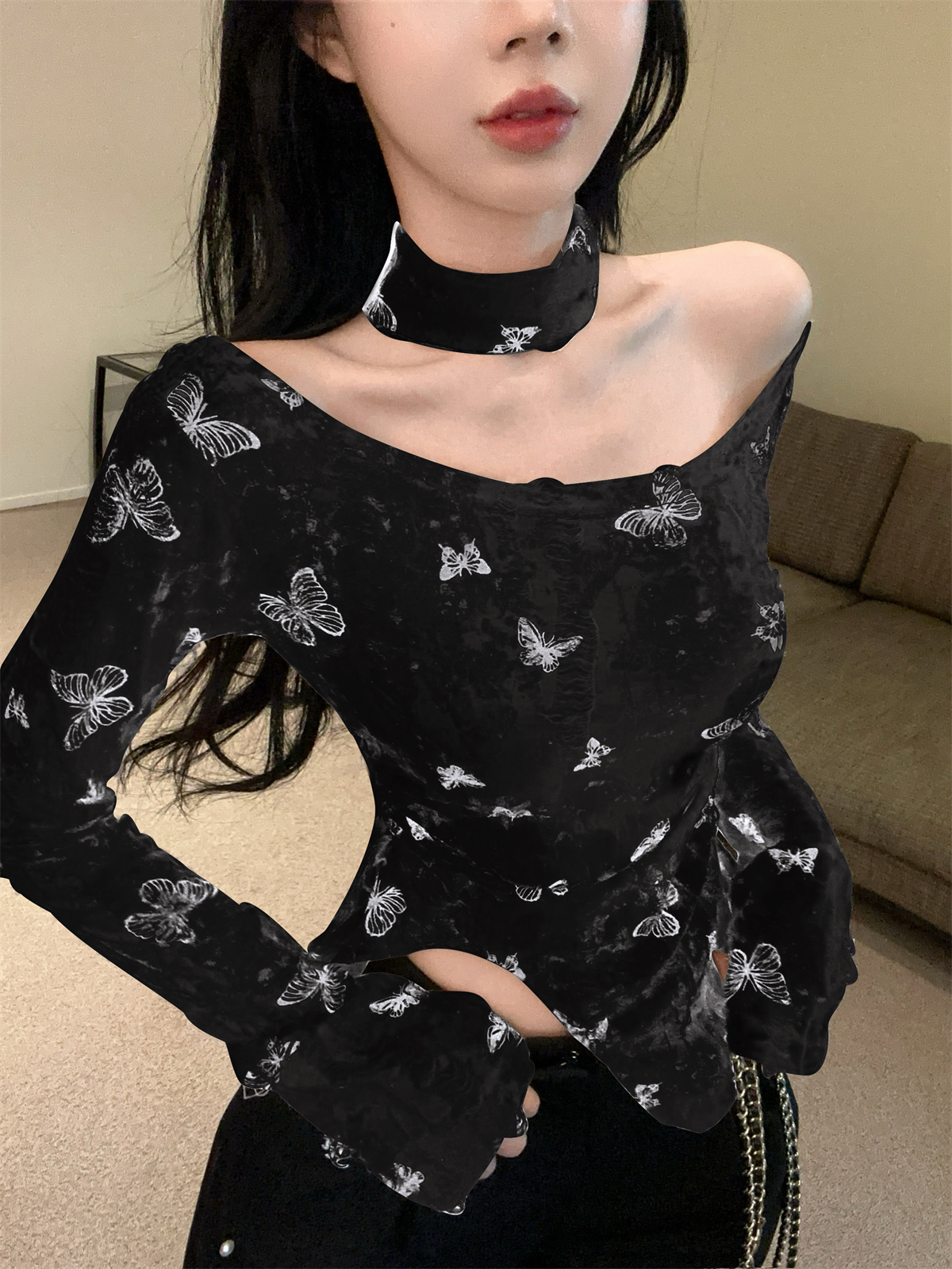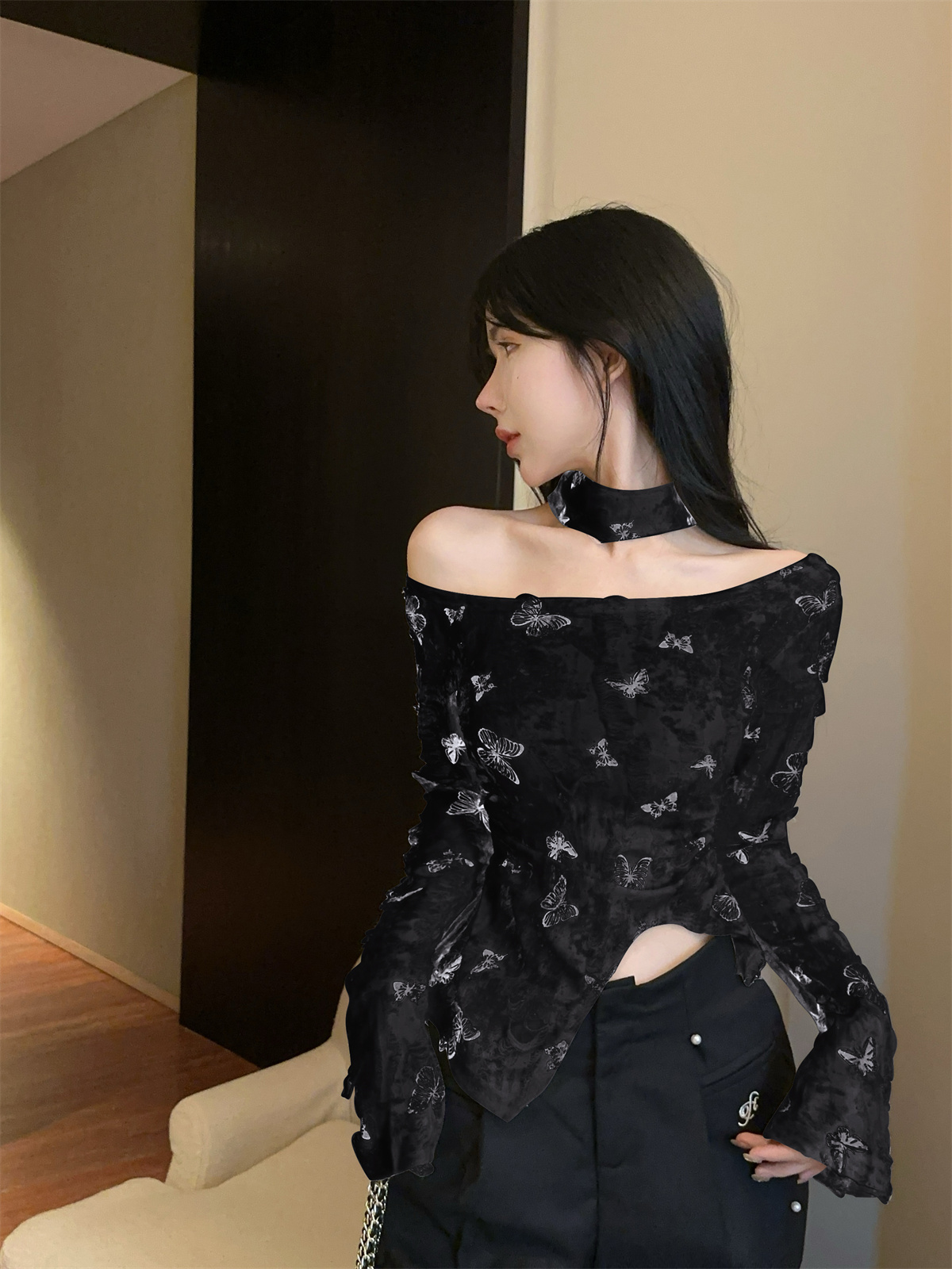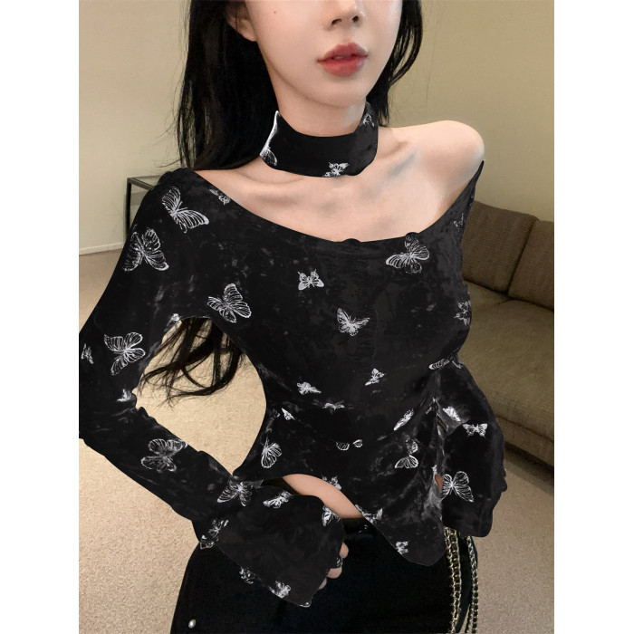 美式辣妹一字肩掛脖上衣女秋冬紥染露肩長袖t恤不規則打底衫內搭