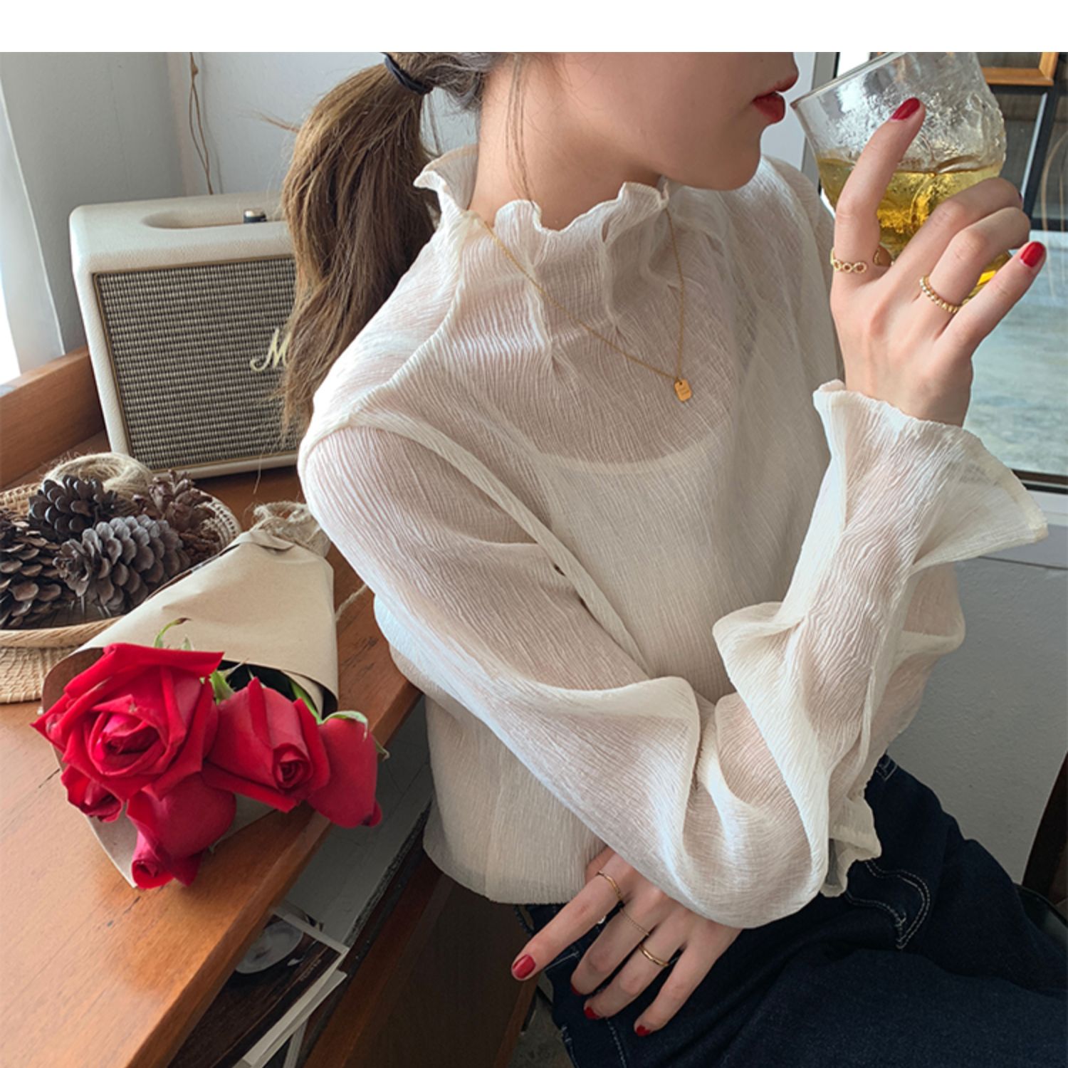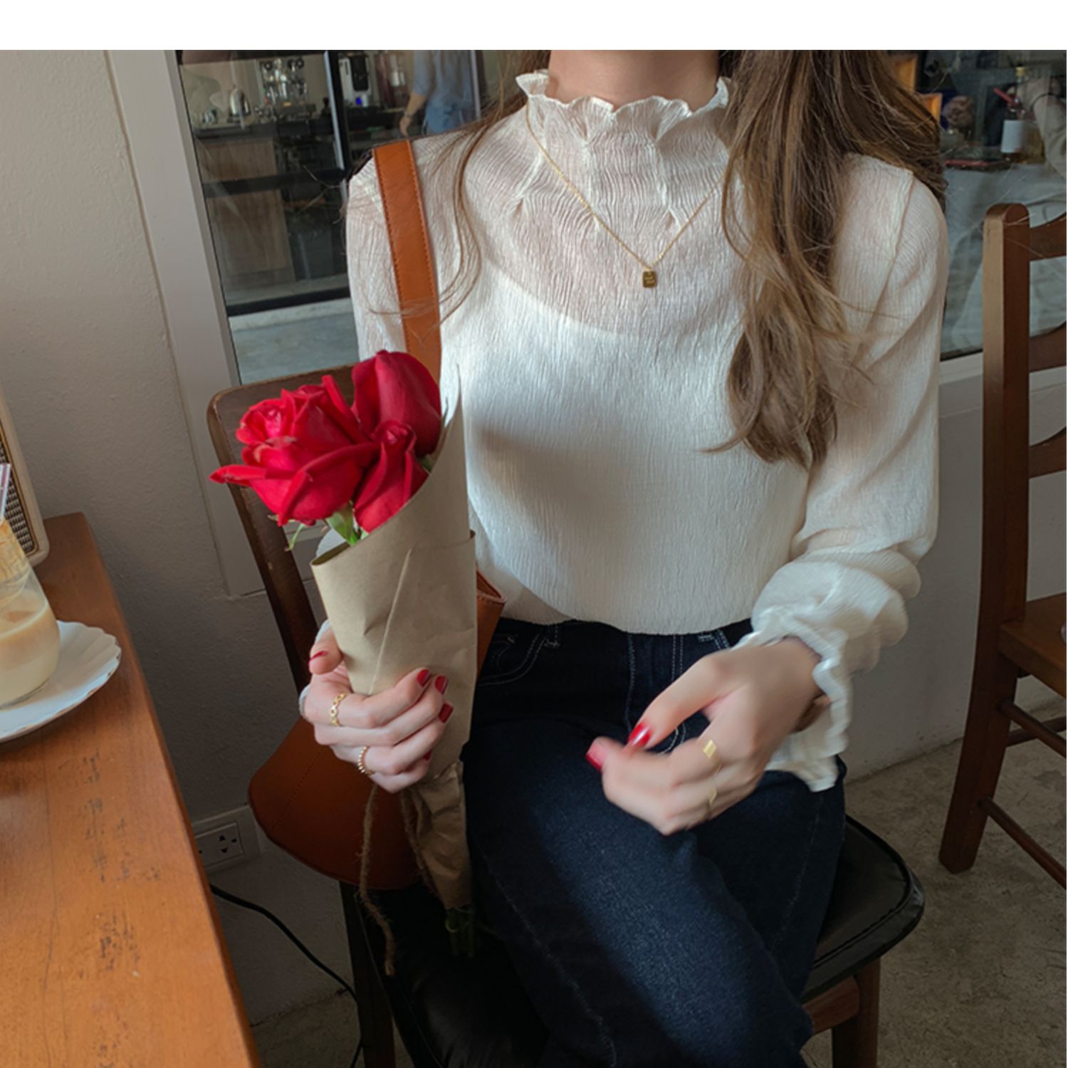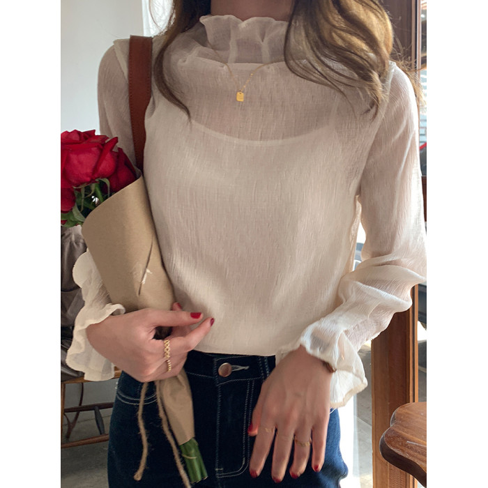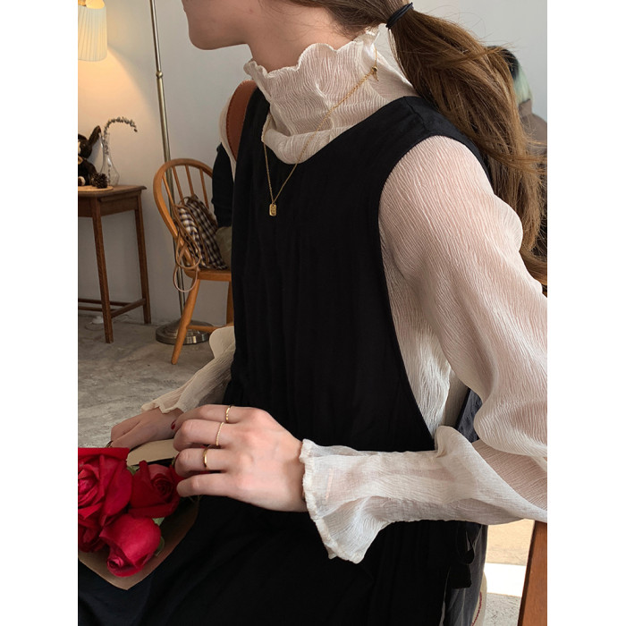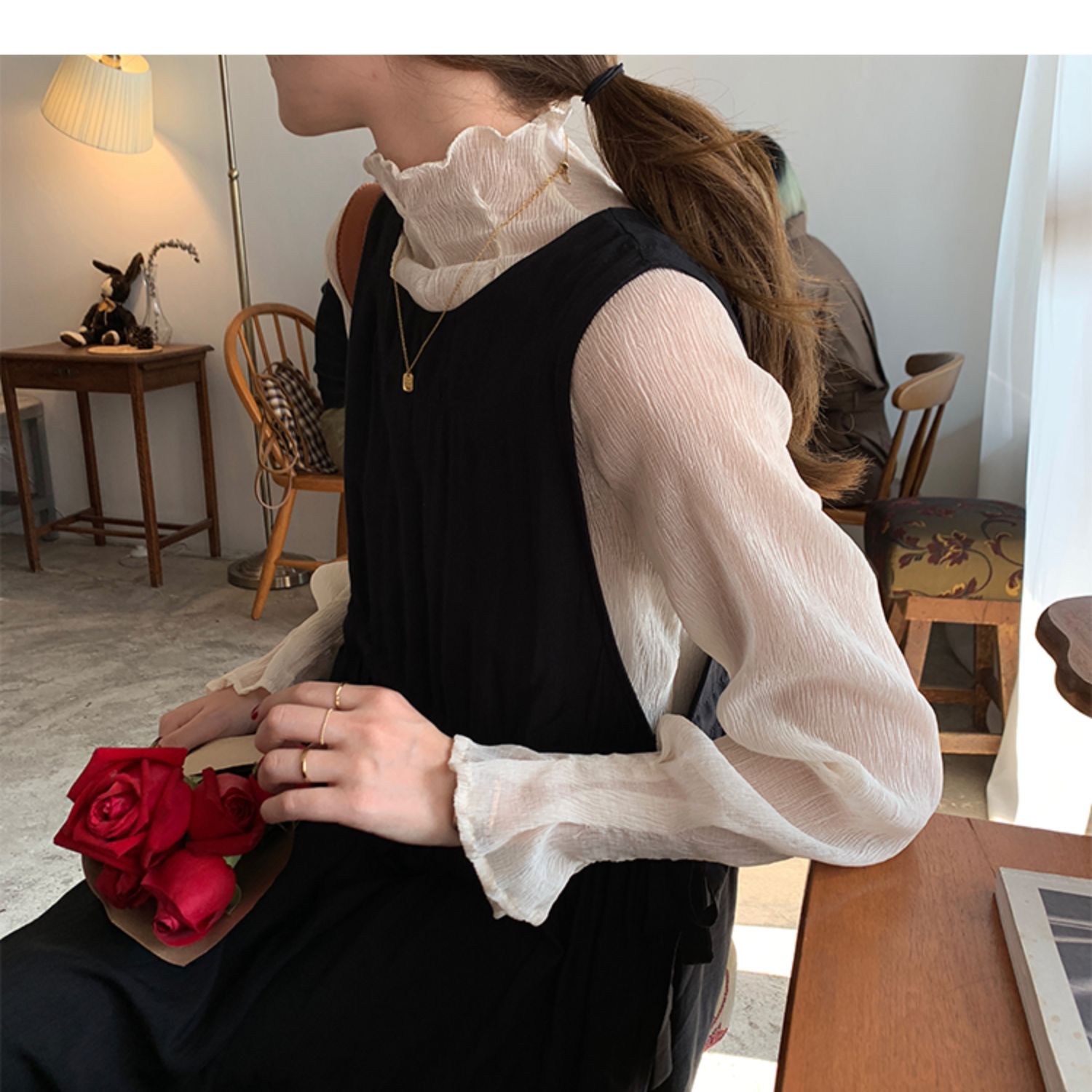 2025秋季新款韓版內搭上衣洋氣木耳邊高領百搭雪紡網紗打底衫女