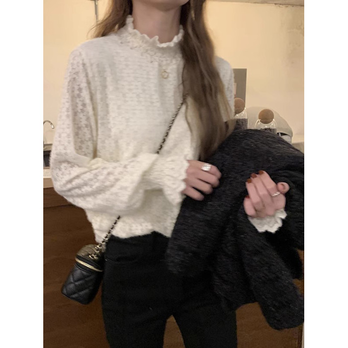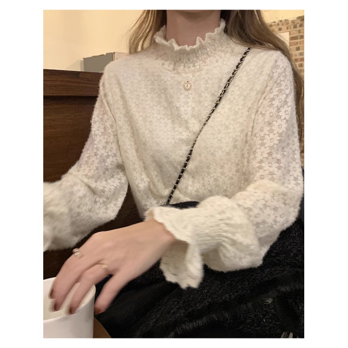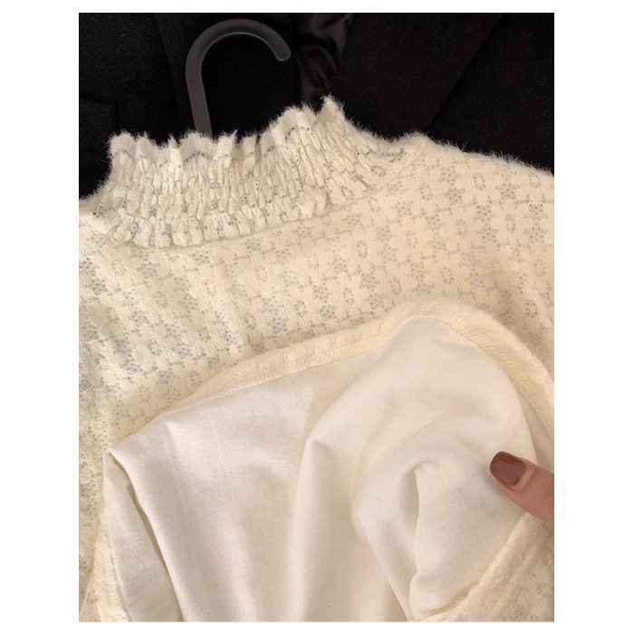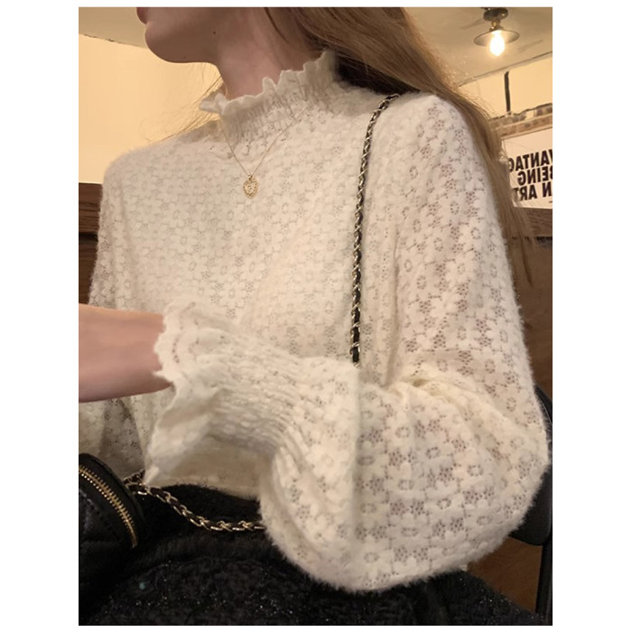 磨毛蕾絲打底衫女秋冬加絨厚洋氣喇叭袖毛衣內搭白色高領網紗上衣