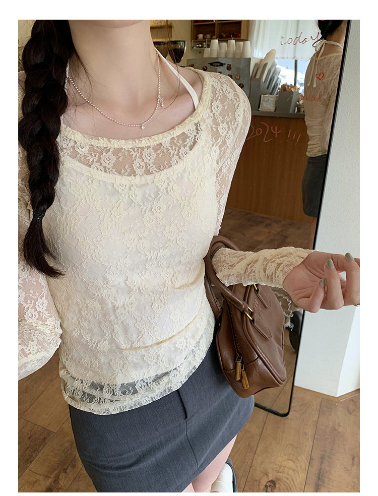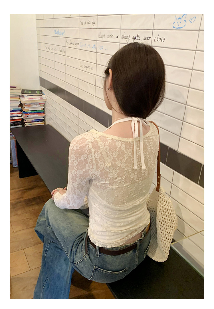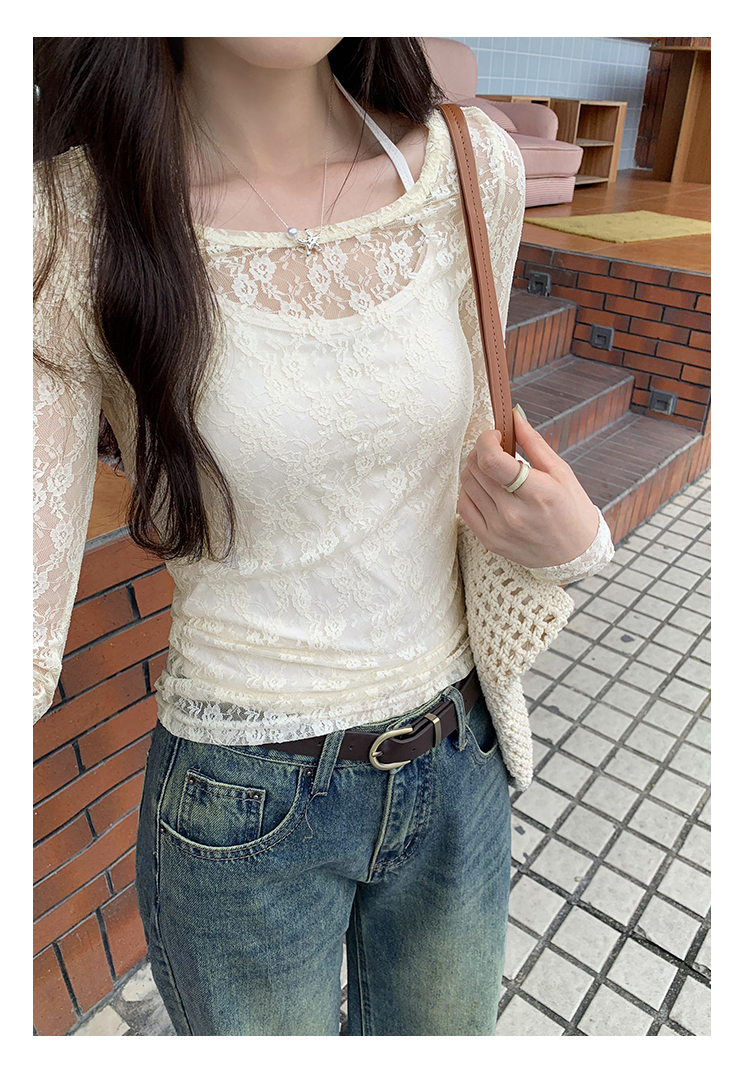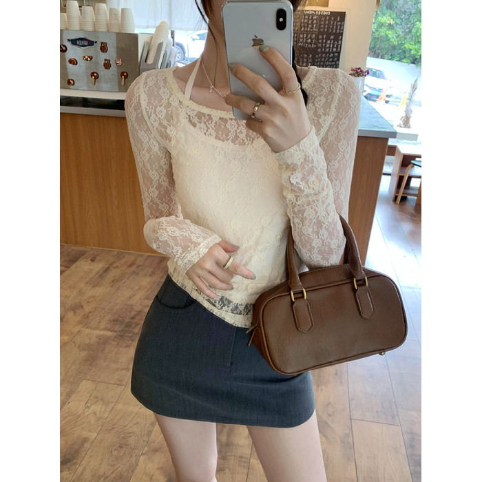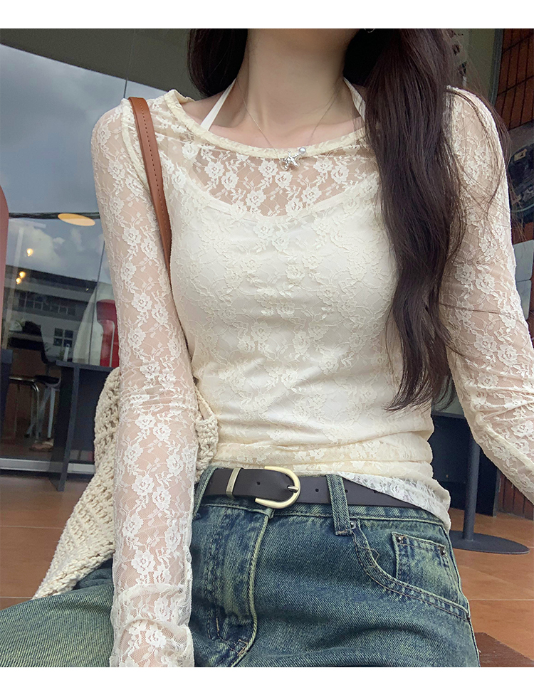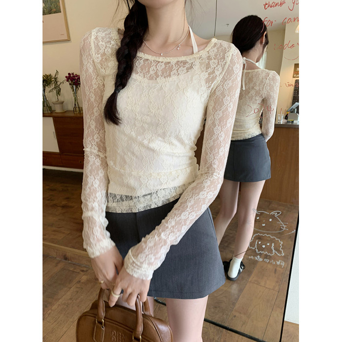 曡穿白色薄款蕾絲打底衫女初秋季內搭掛脖吊帶長袖罩衫上衣兩件套