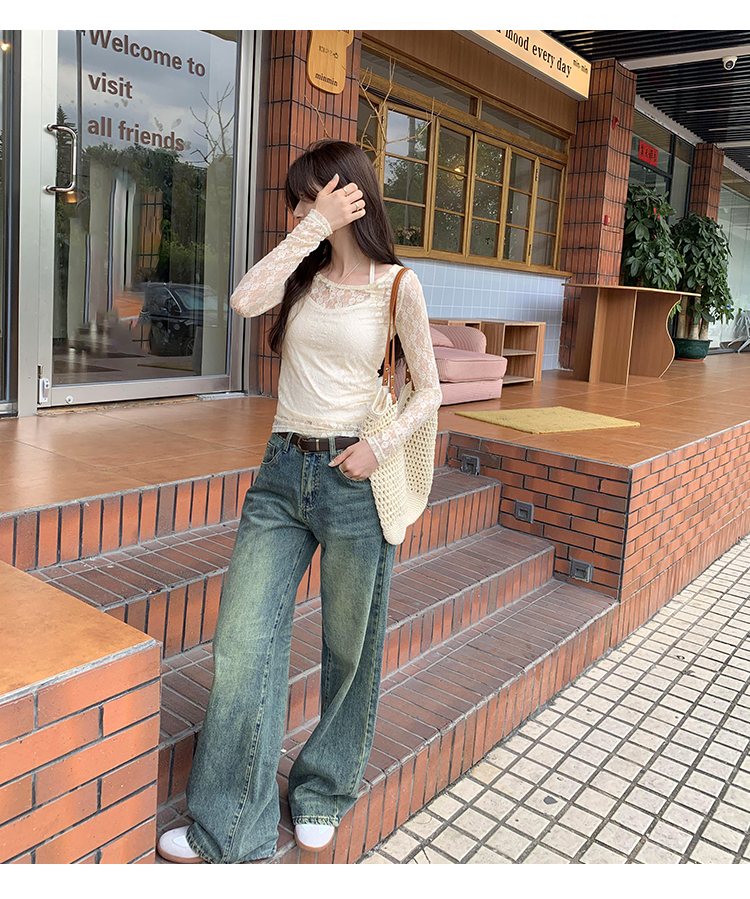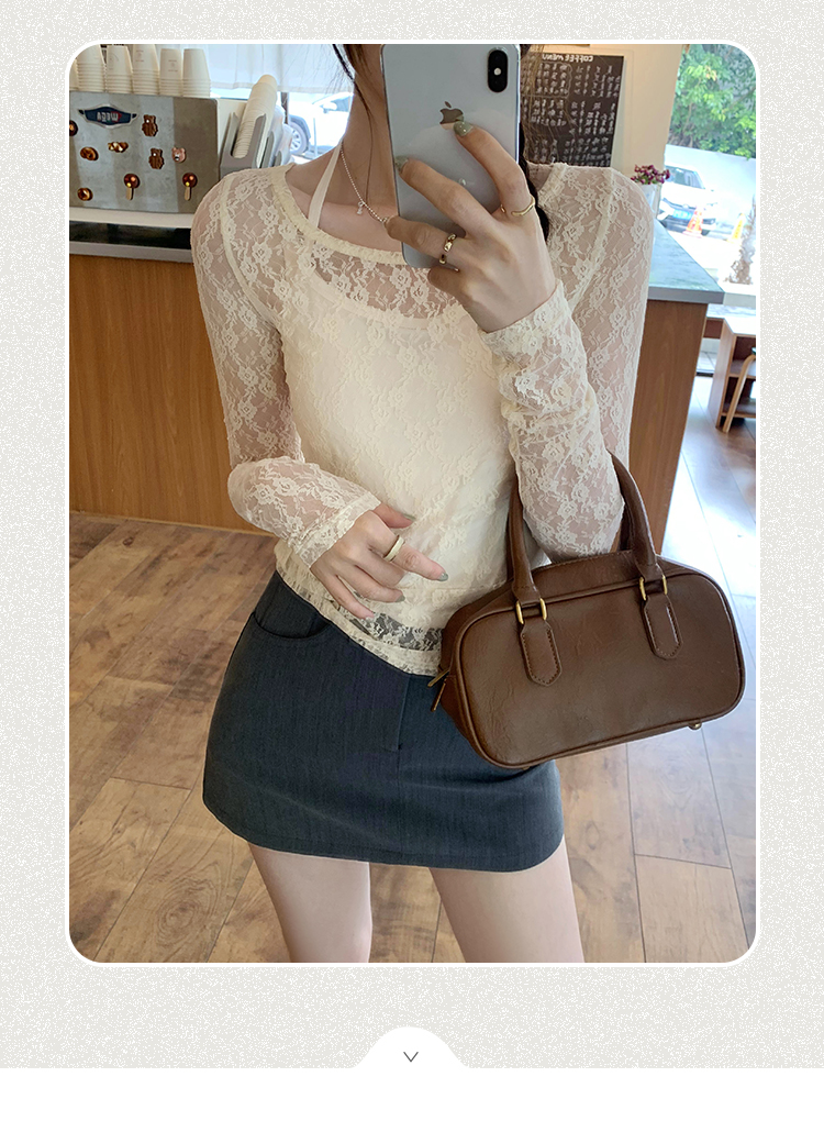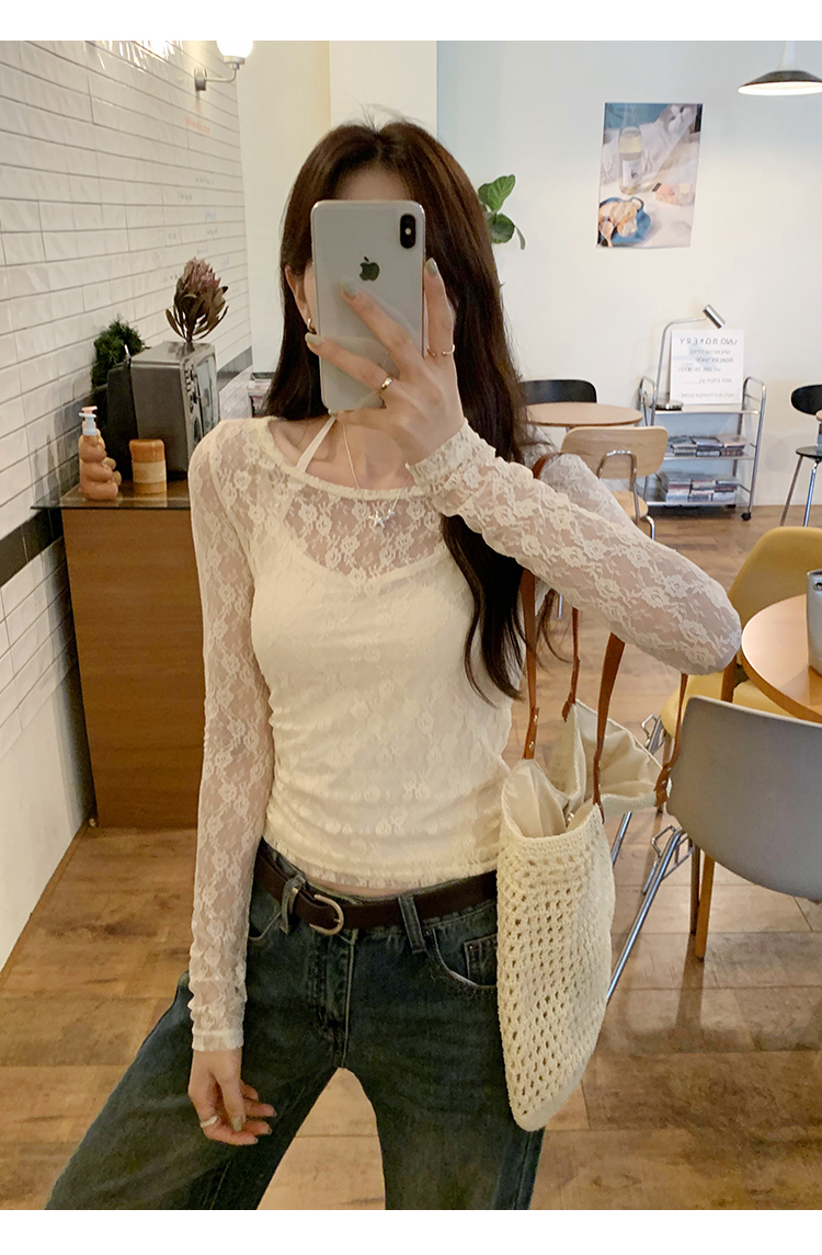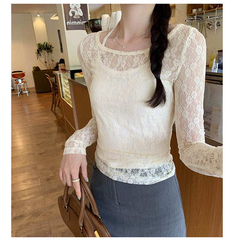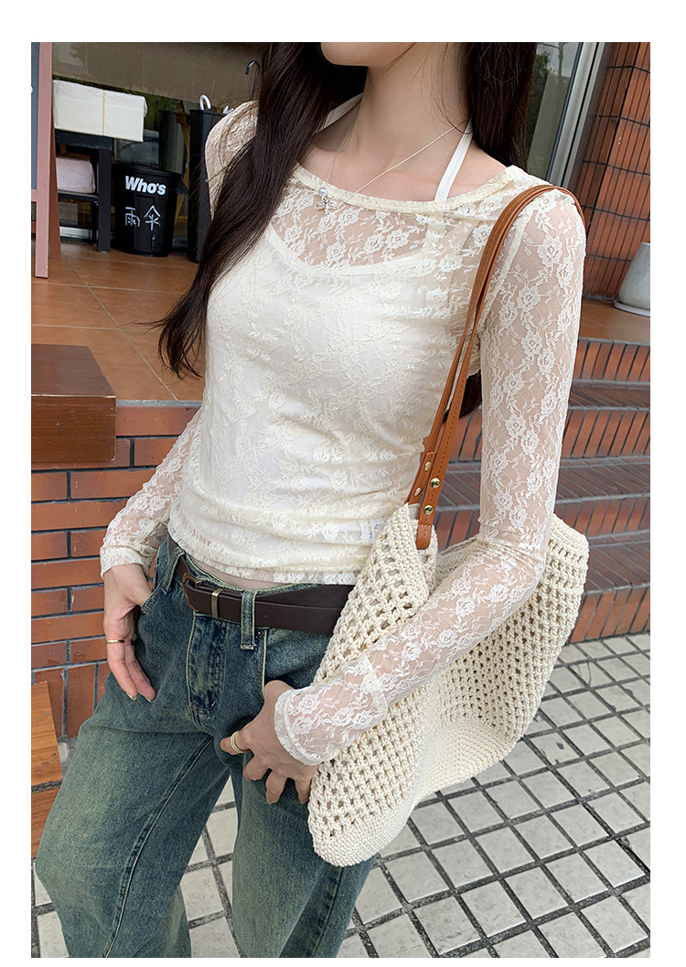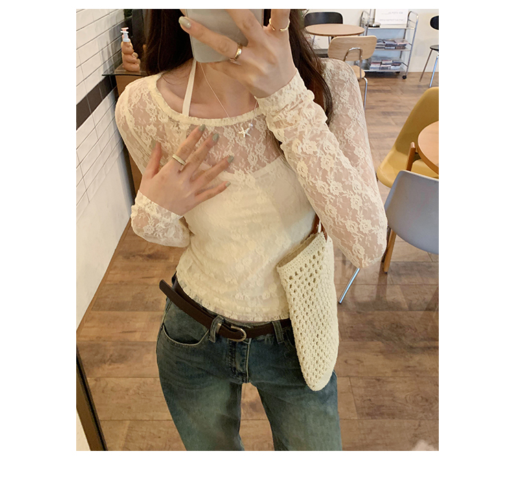 曡穿白色薄款蕾絲打底衫女初秋季內搭掛脖吊帶長袖罩衫上衣兩件套