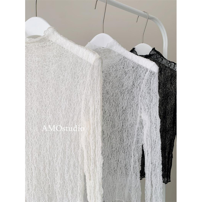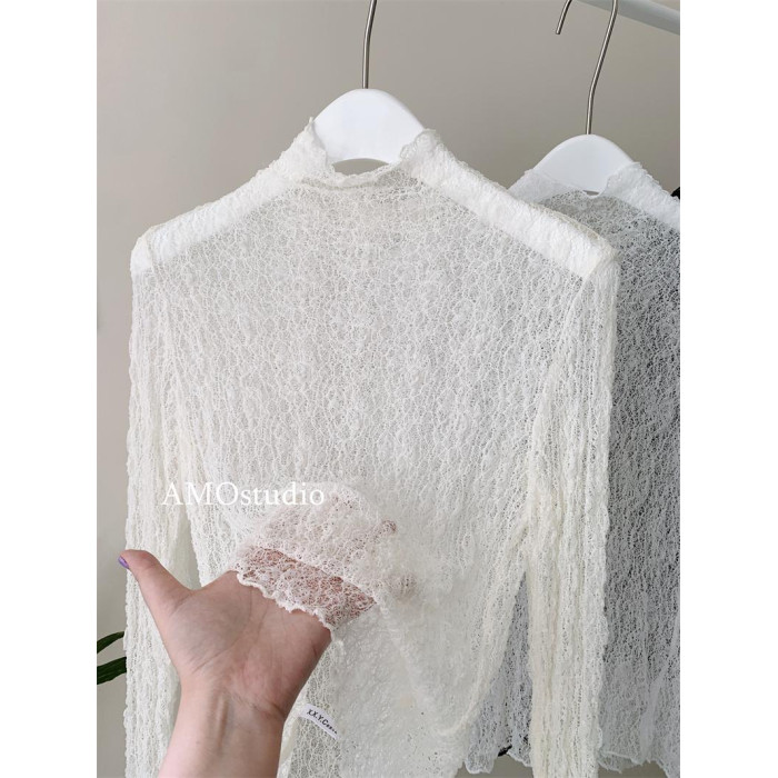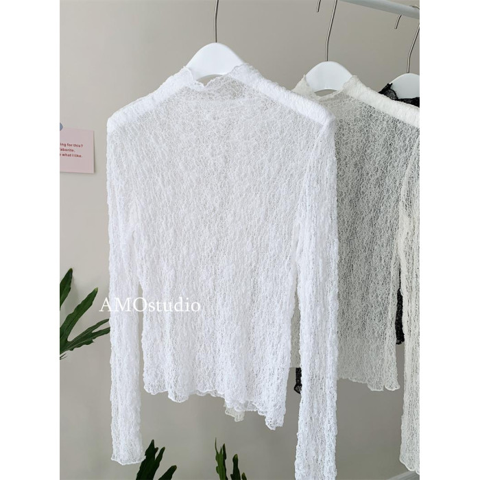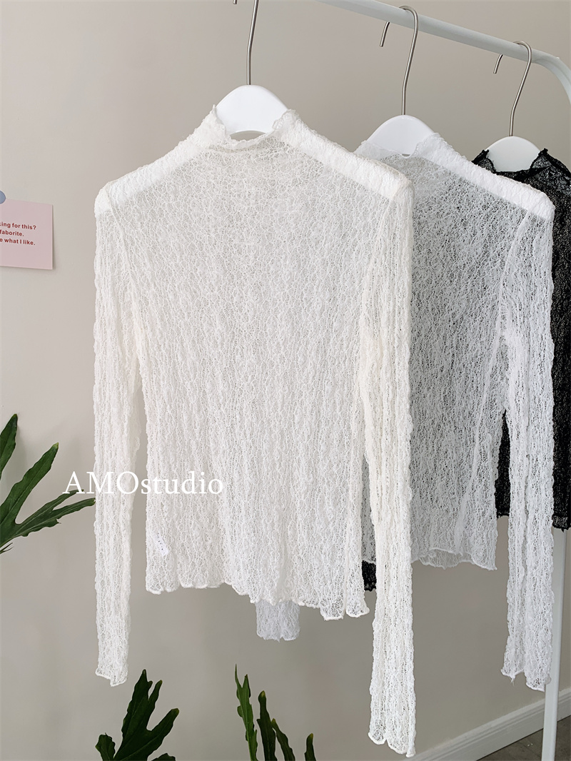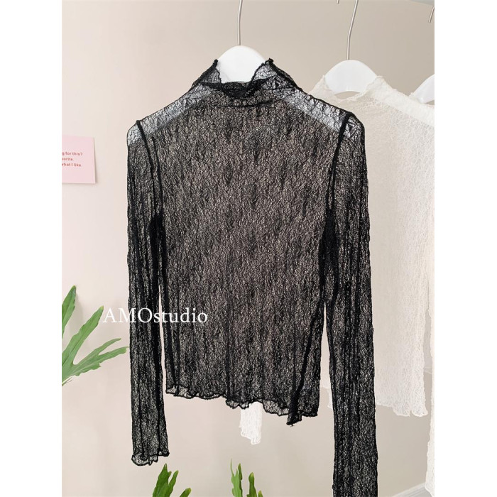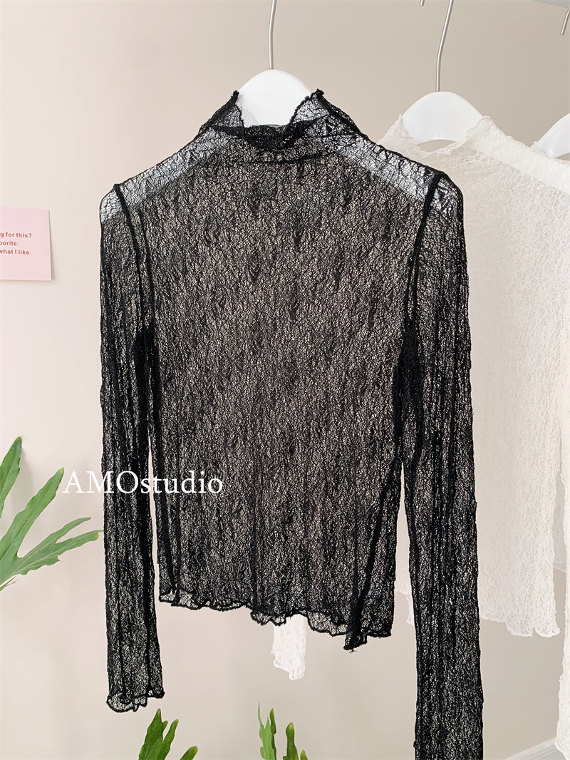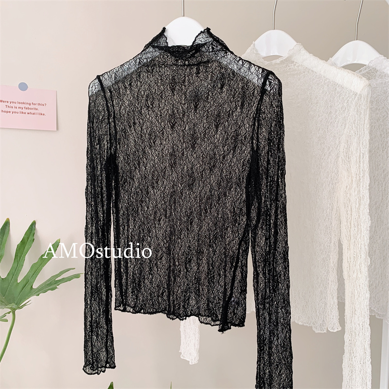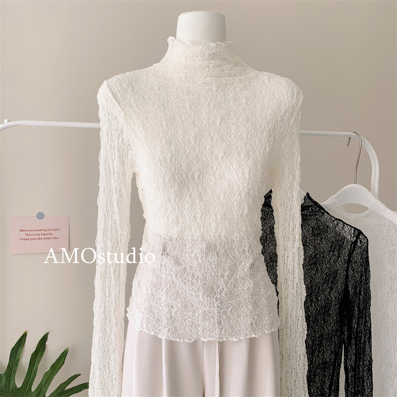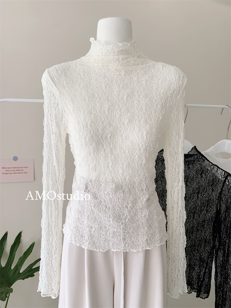 法式半高領蕾絲打底衫女秋冬內搭彈力修身堆堆領長袖網紗上衣小衫