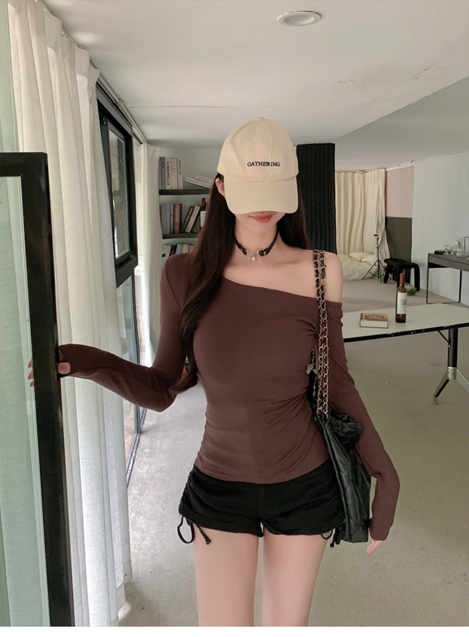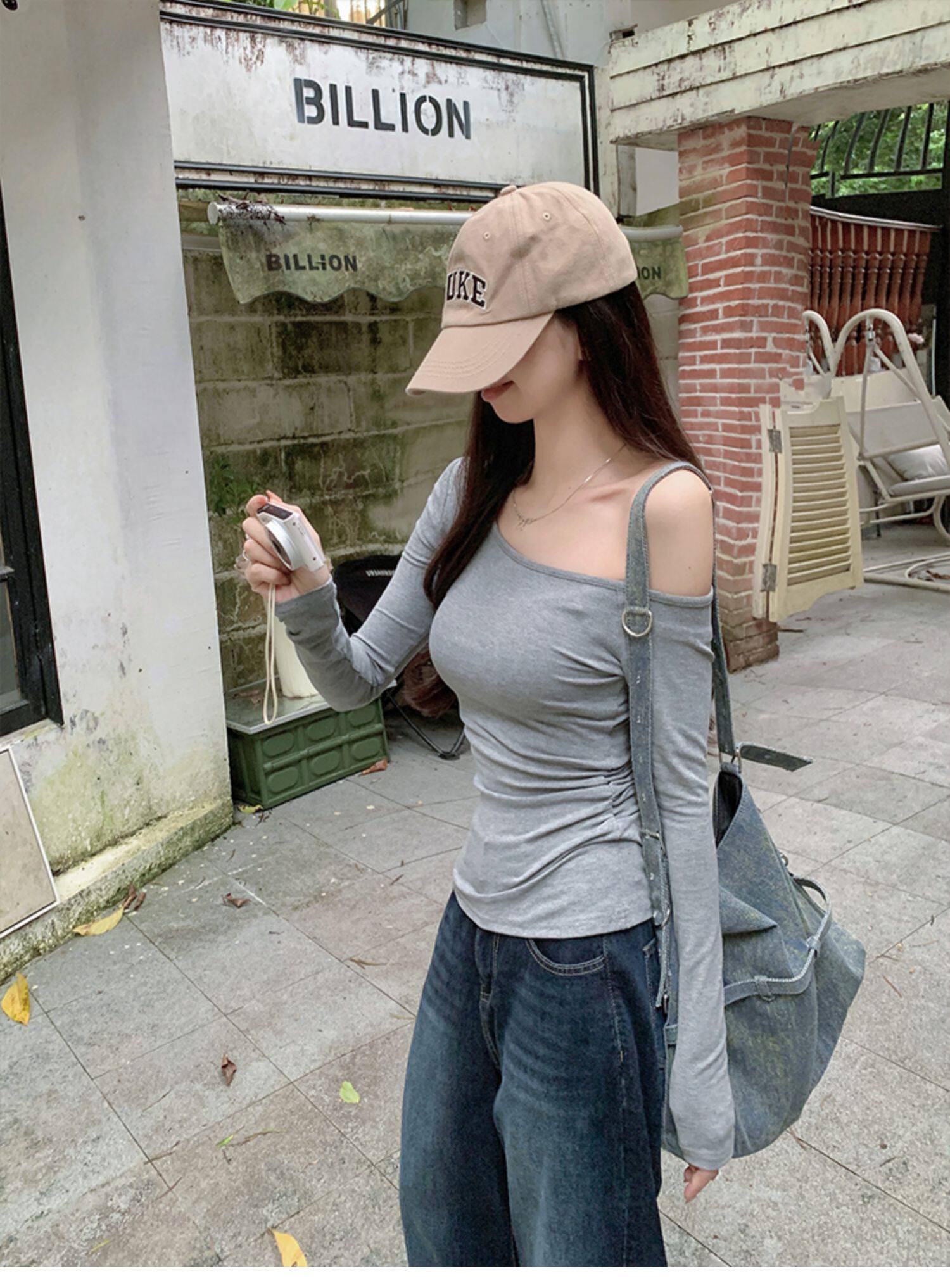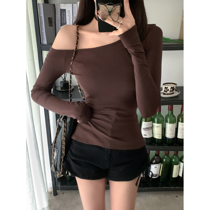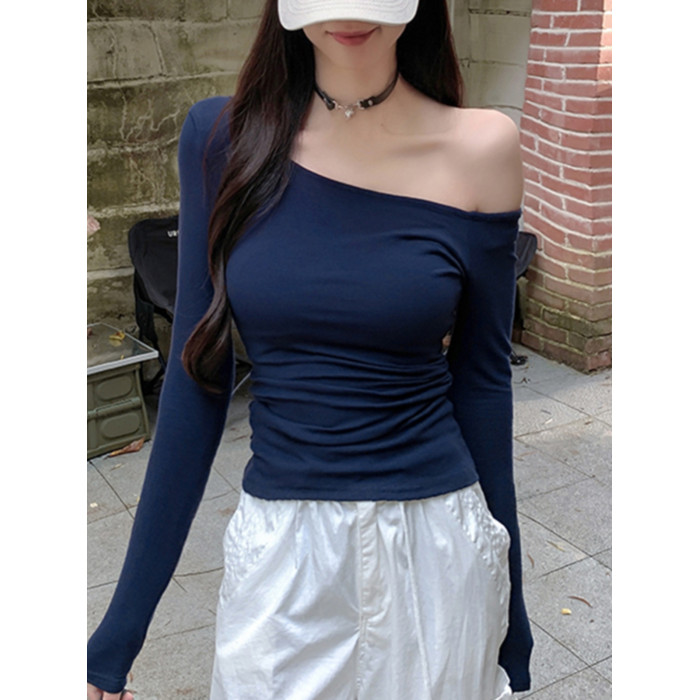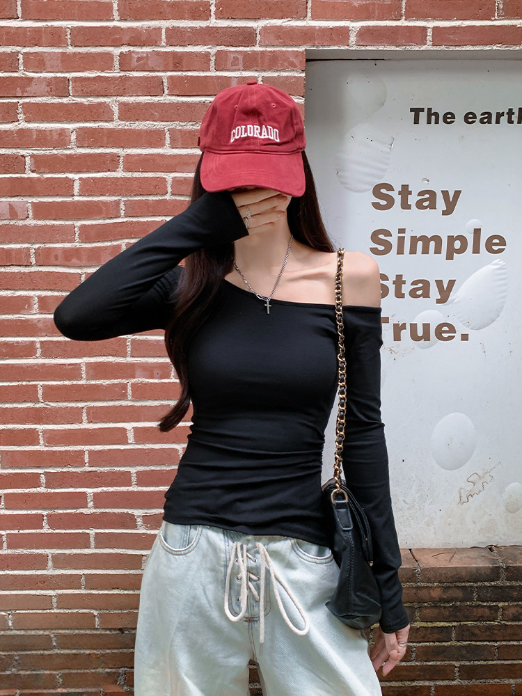 辣妹酷颯chic褶皺修身不規則斜肩長袖T恤女純欲一字領露肩小上衣