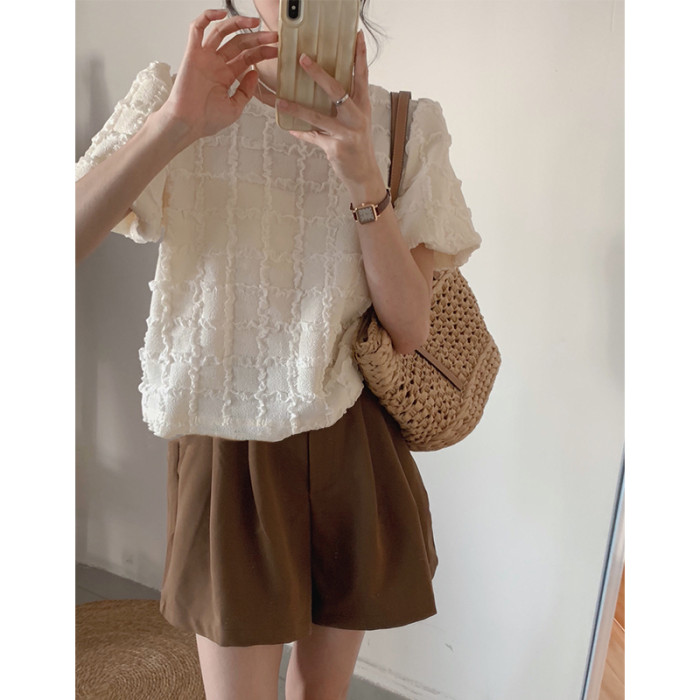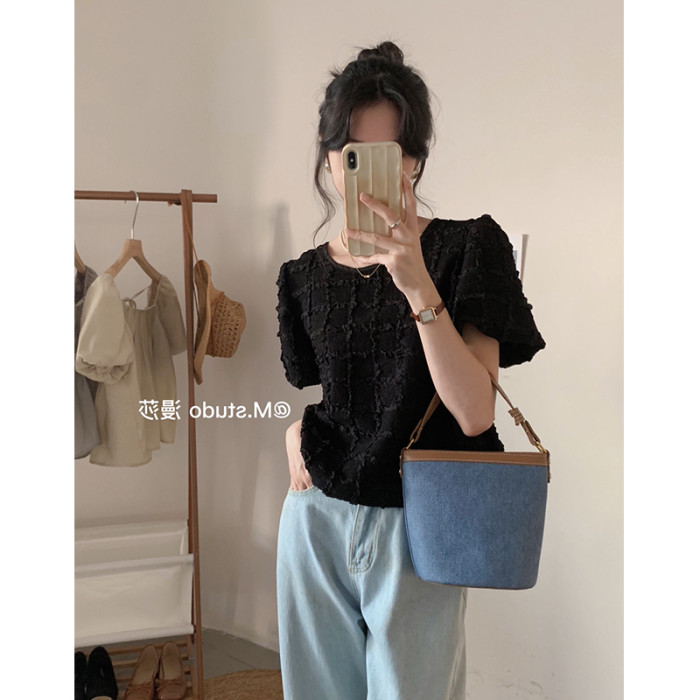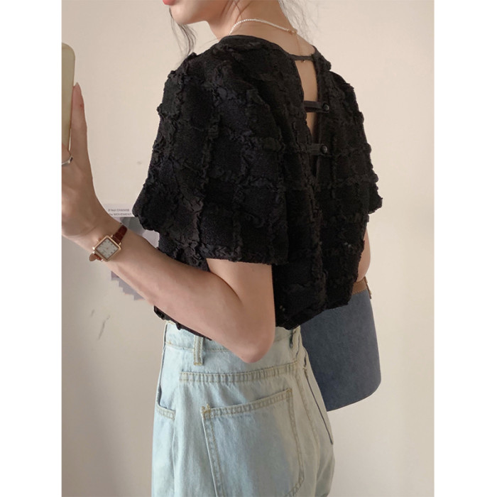 小香風復古洋氣氣質短袖圓領泡泡袖別致鏤空短款褶皺雪紡衫上衣女