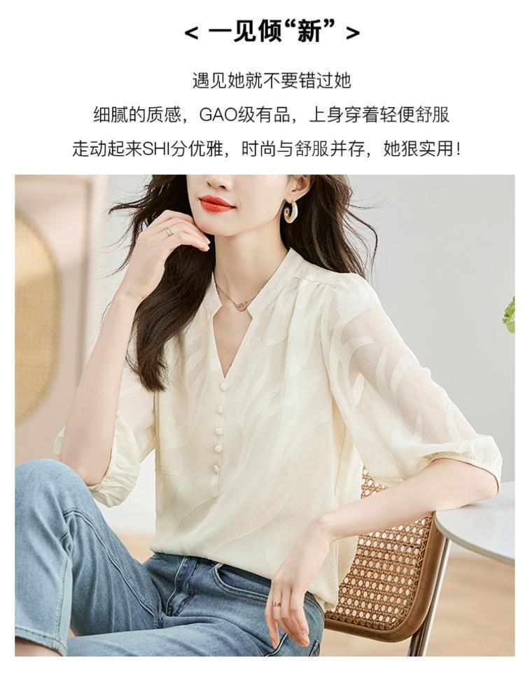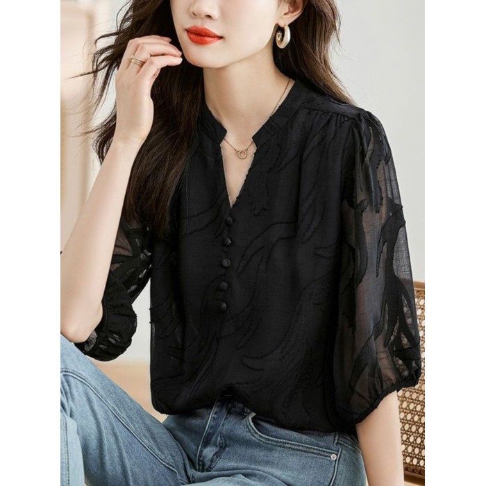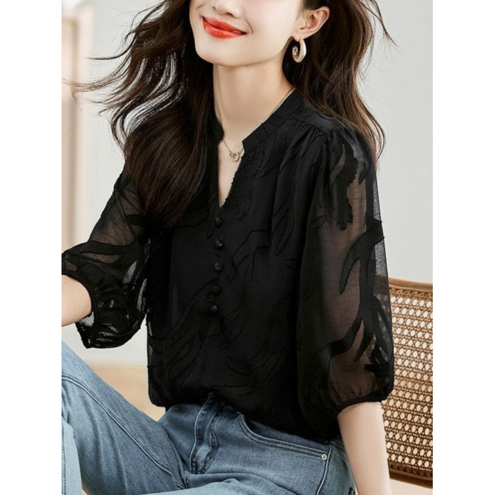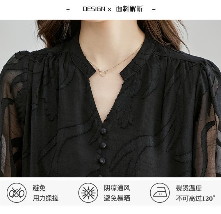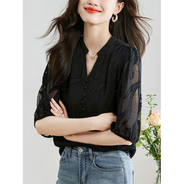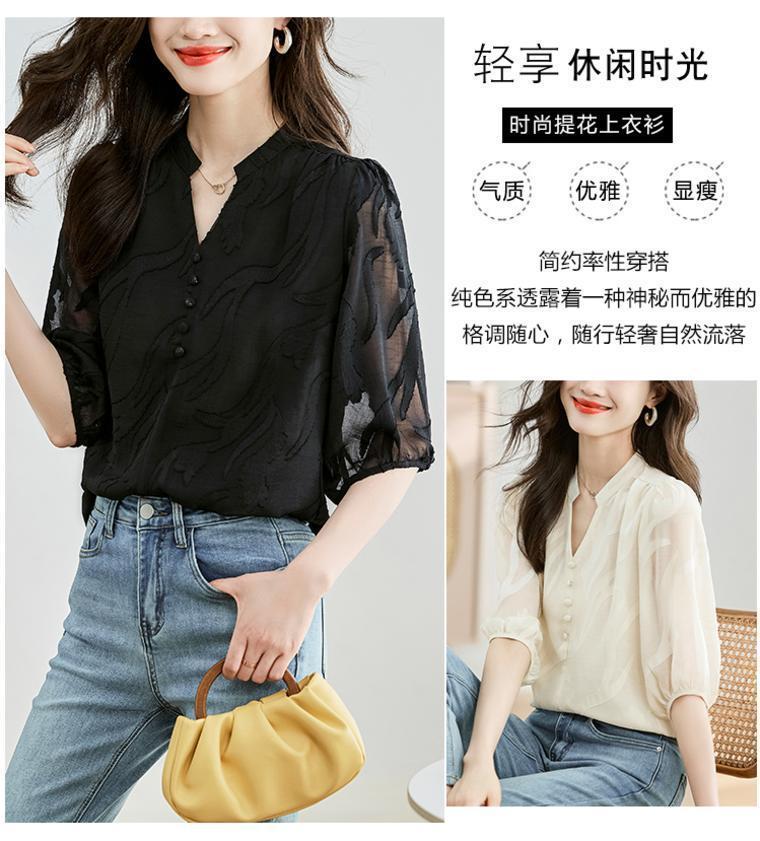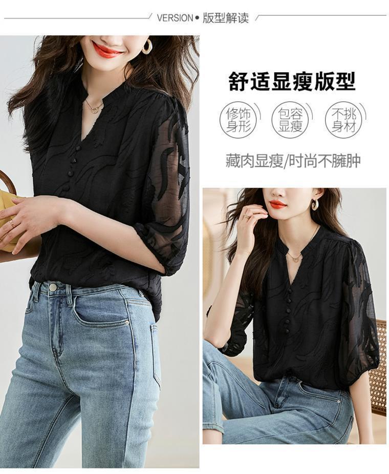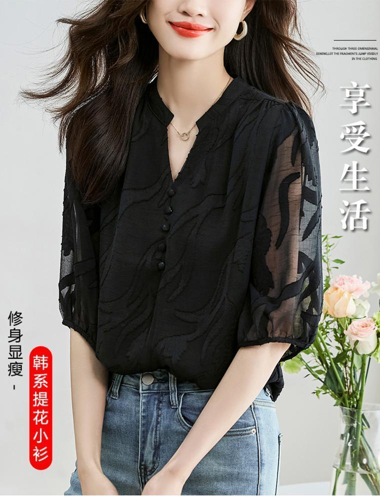 薄款黑色短袖雪紡衫女夏季新款時尚洋氣拼接蕾絲襯衫寬松遮肚上衣