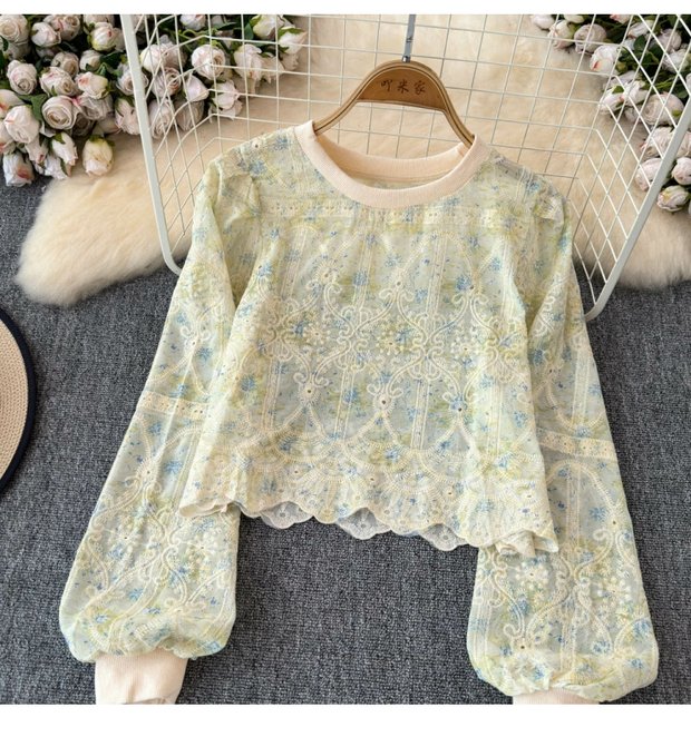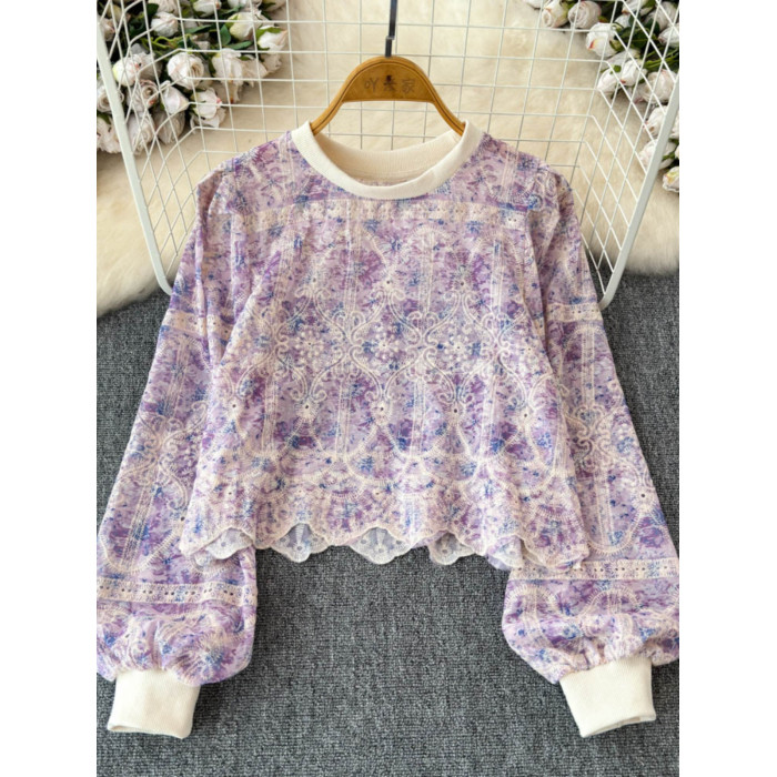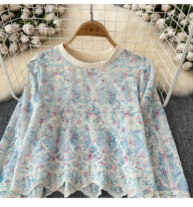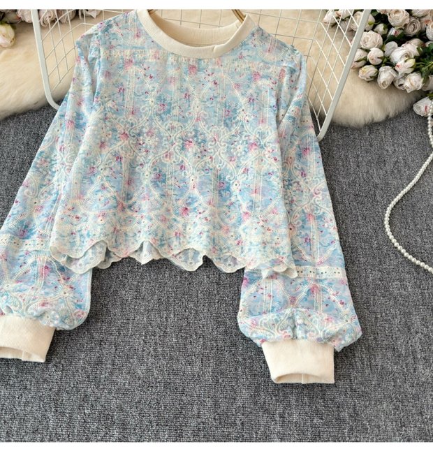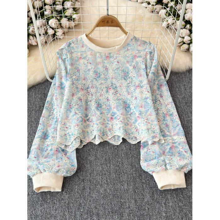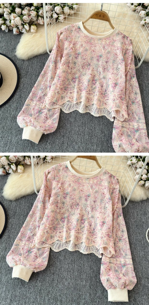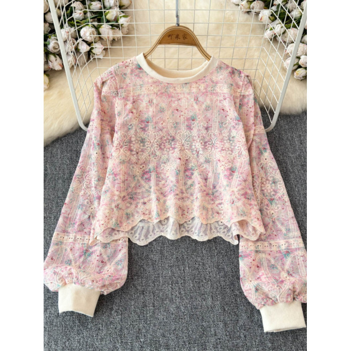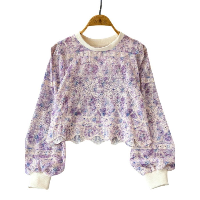 2025秋季新款法式復古圓領蕾絲拼接長袖衛衣女設計感小衆短款上衣