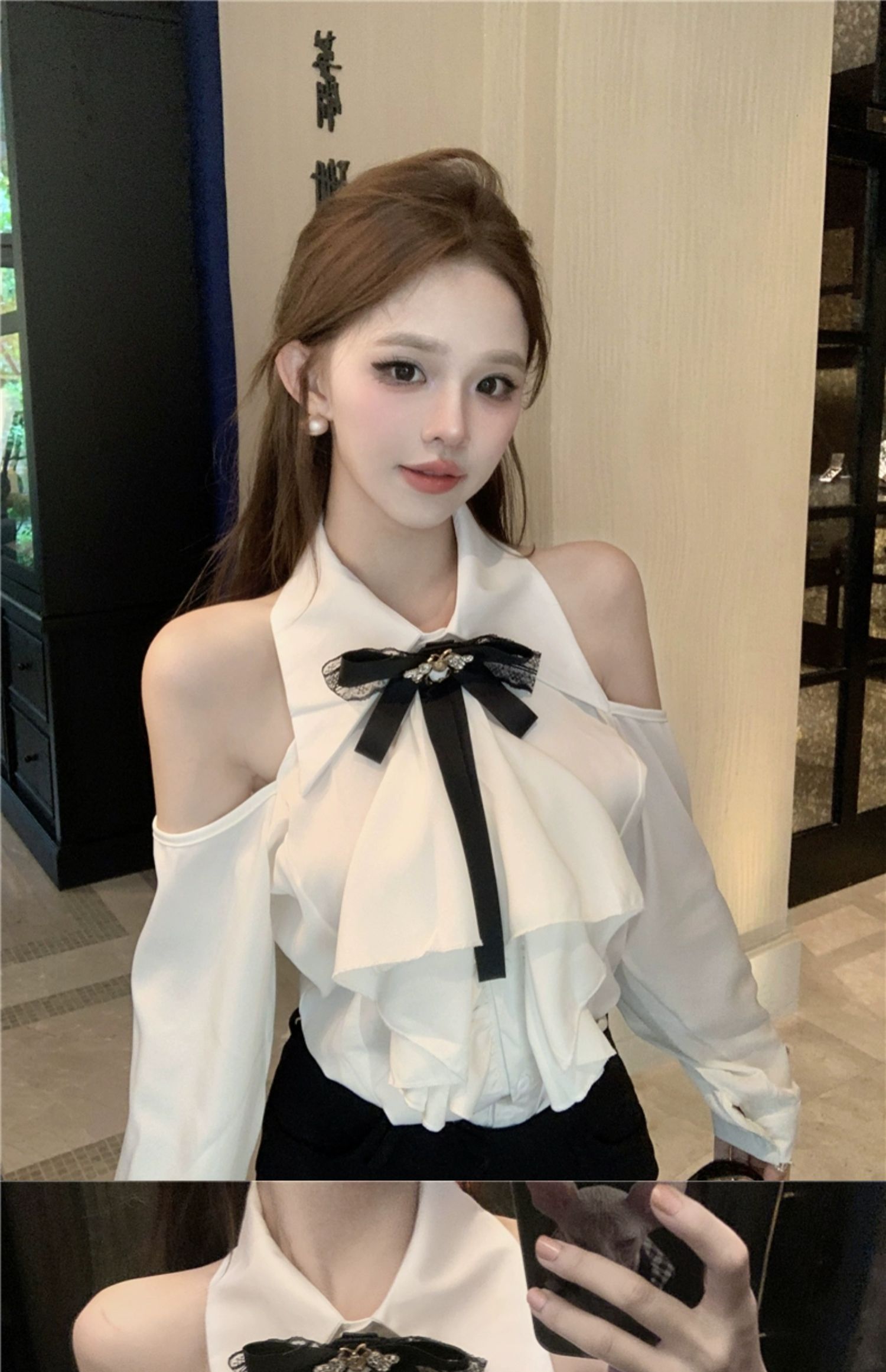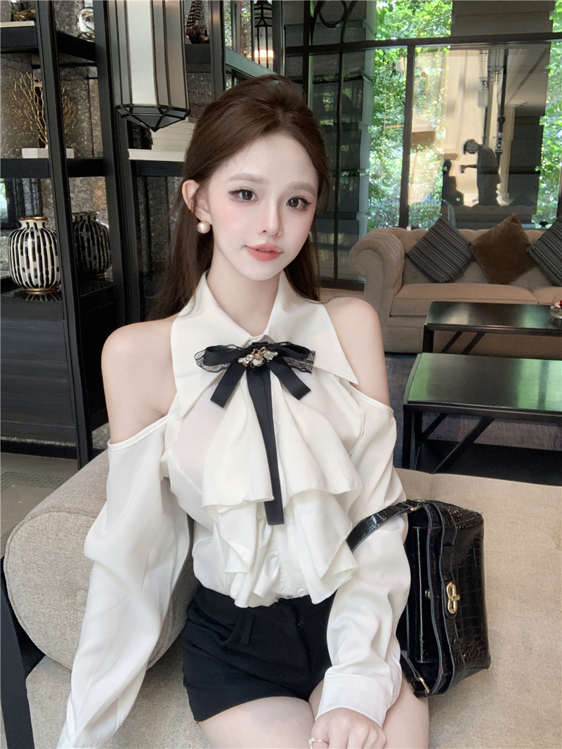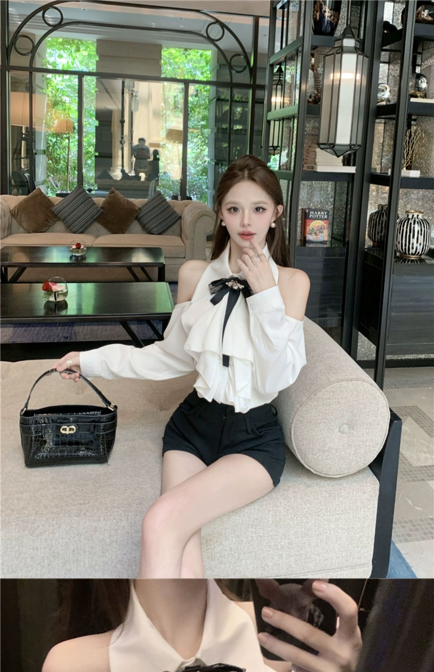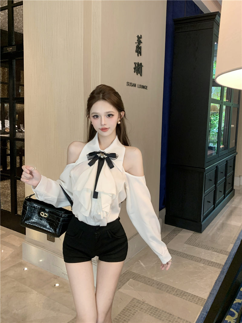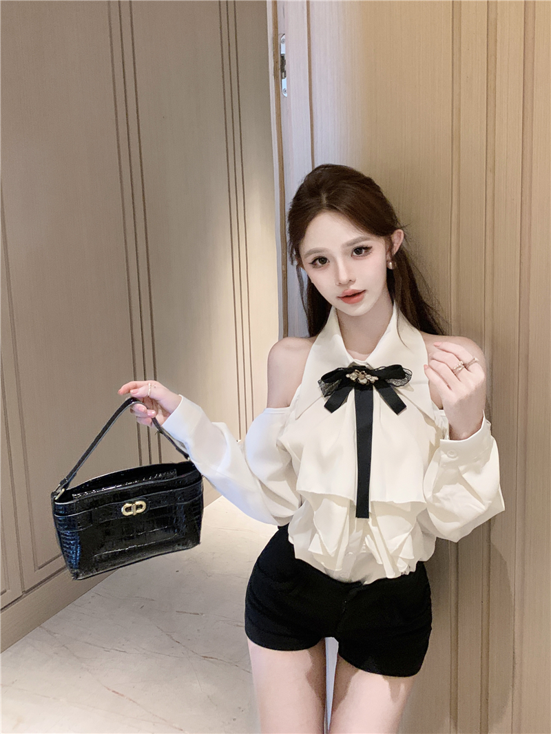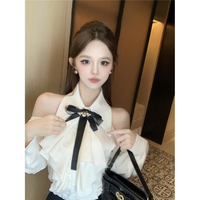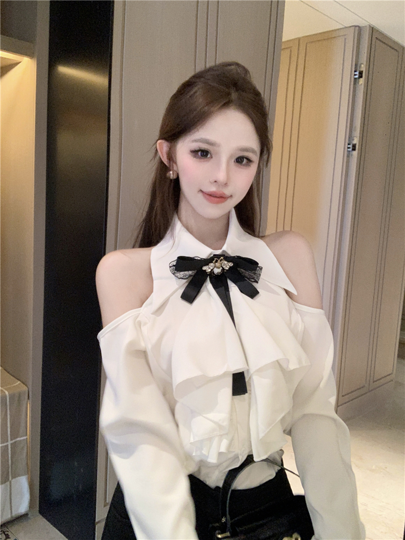 荷葉邊蝴蝶結襯衫女早秋純欲辣妹掛脖露肩上衣宮廷風法式白色襯衣