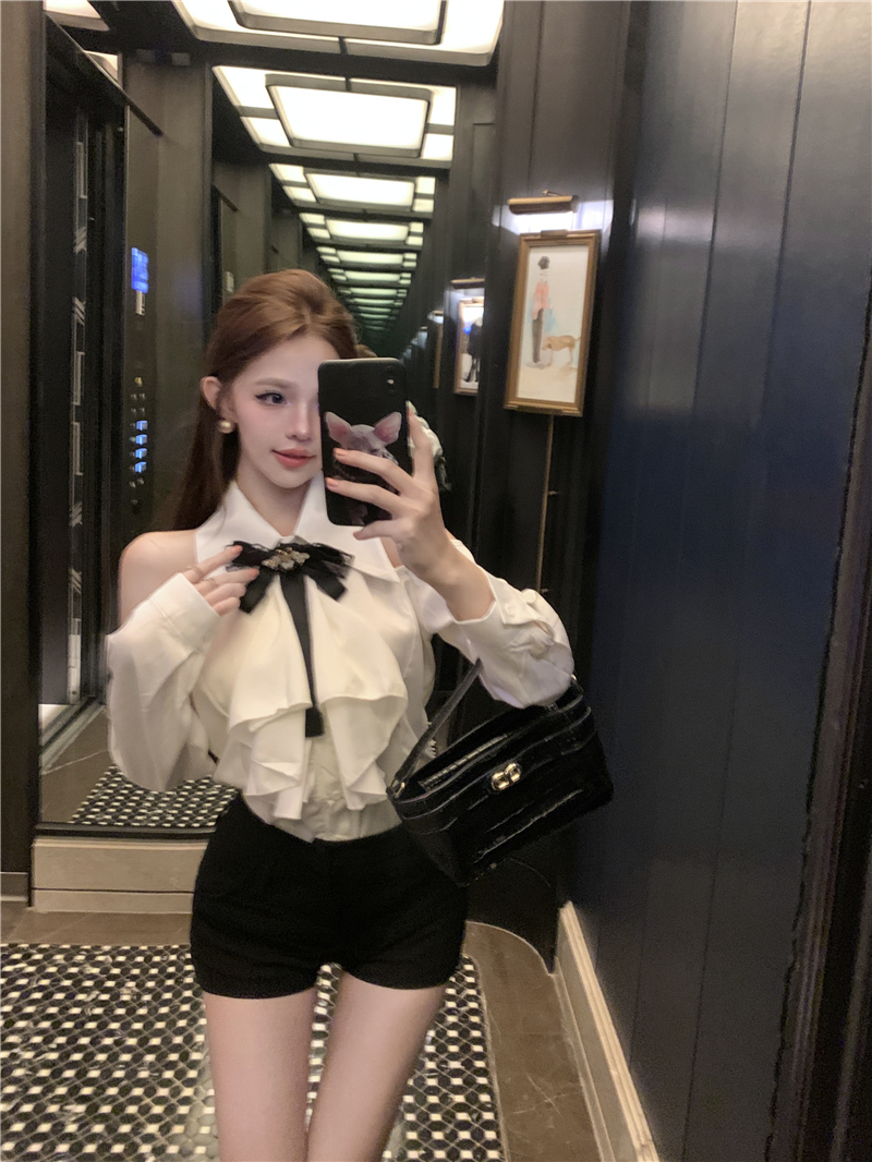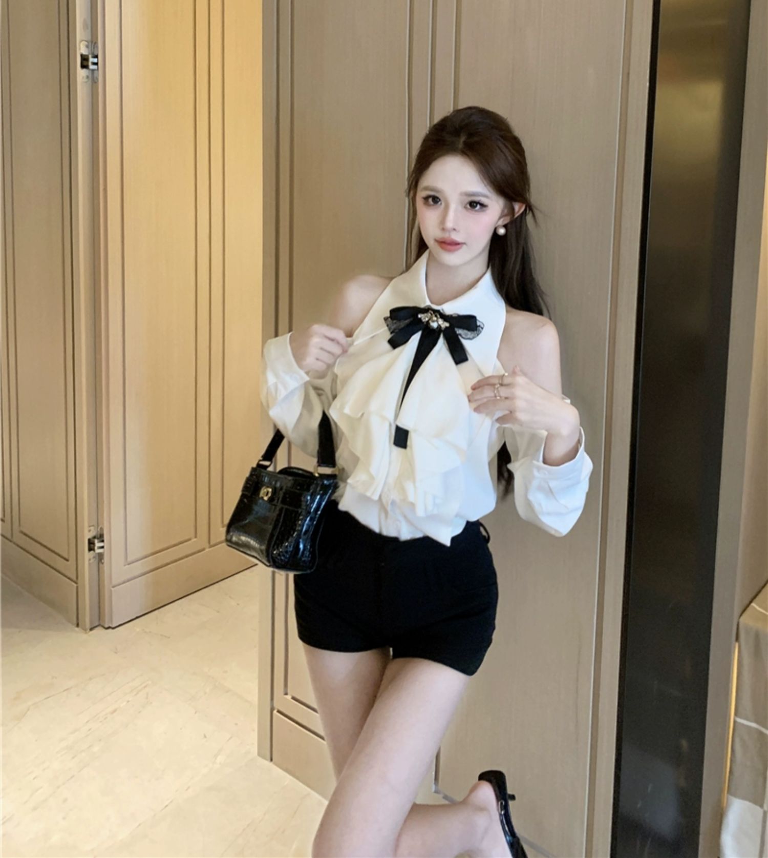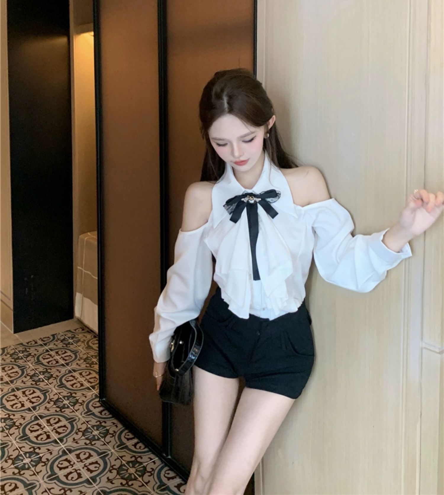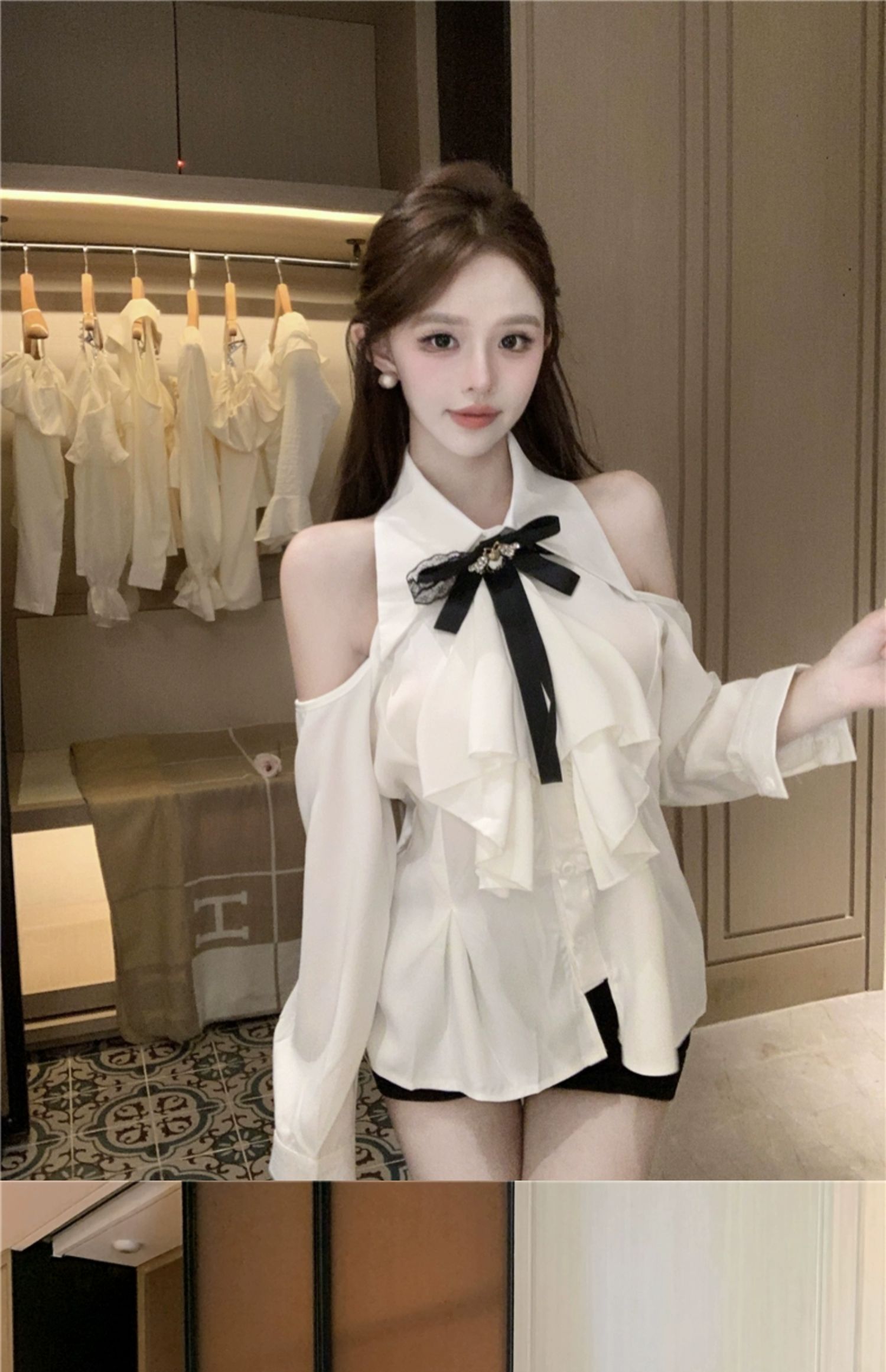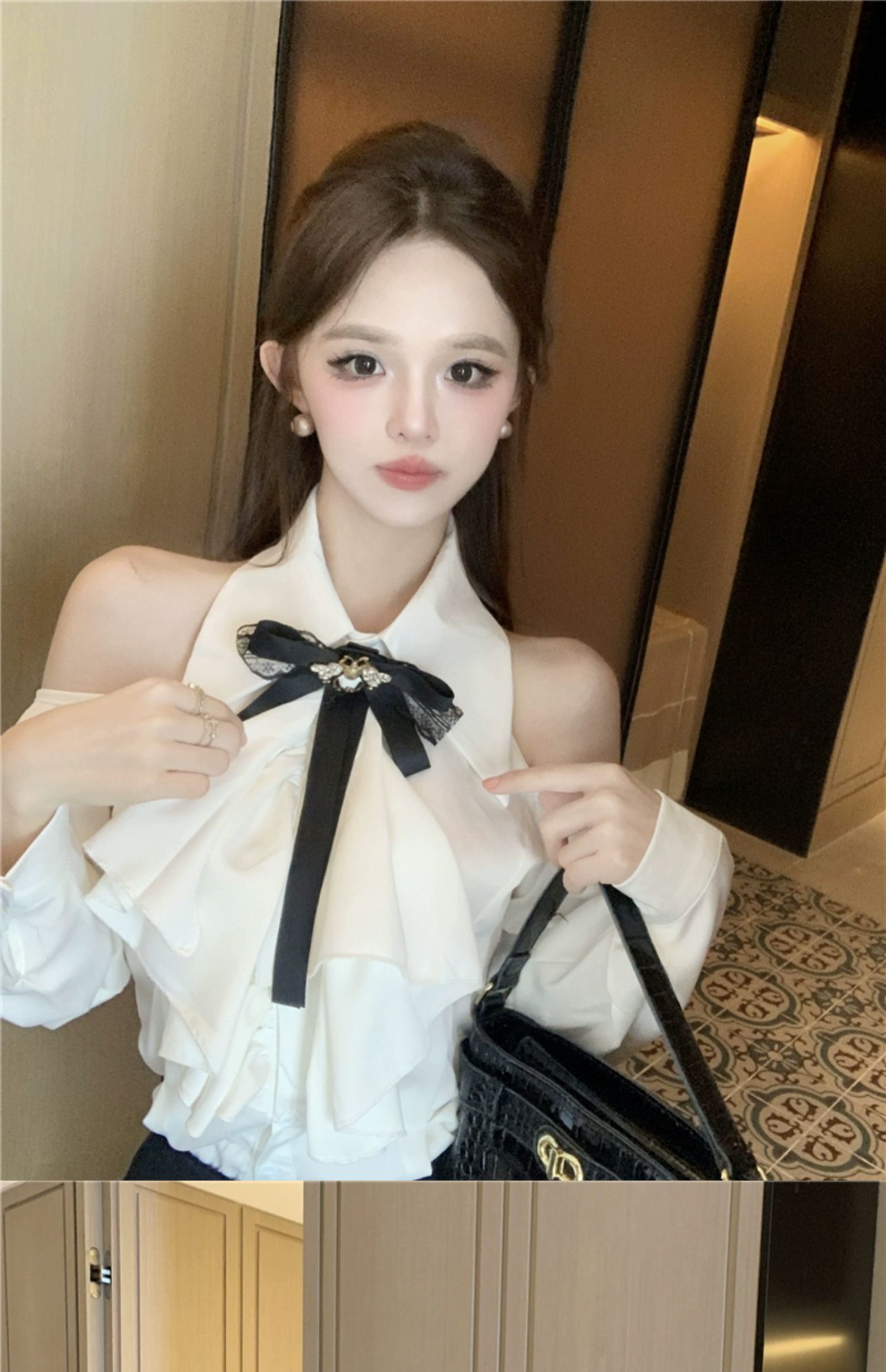 荷葉邊蝴蝶結襯衫女早秋純欲辣妹掛脖露肩上衣宮廷風法式白色襯衣
