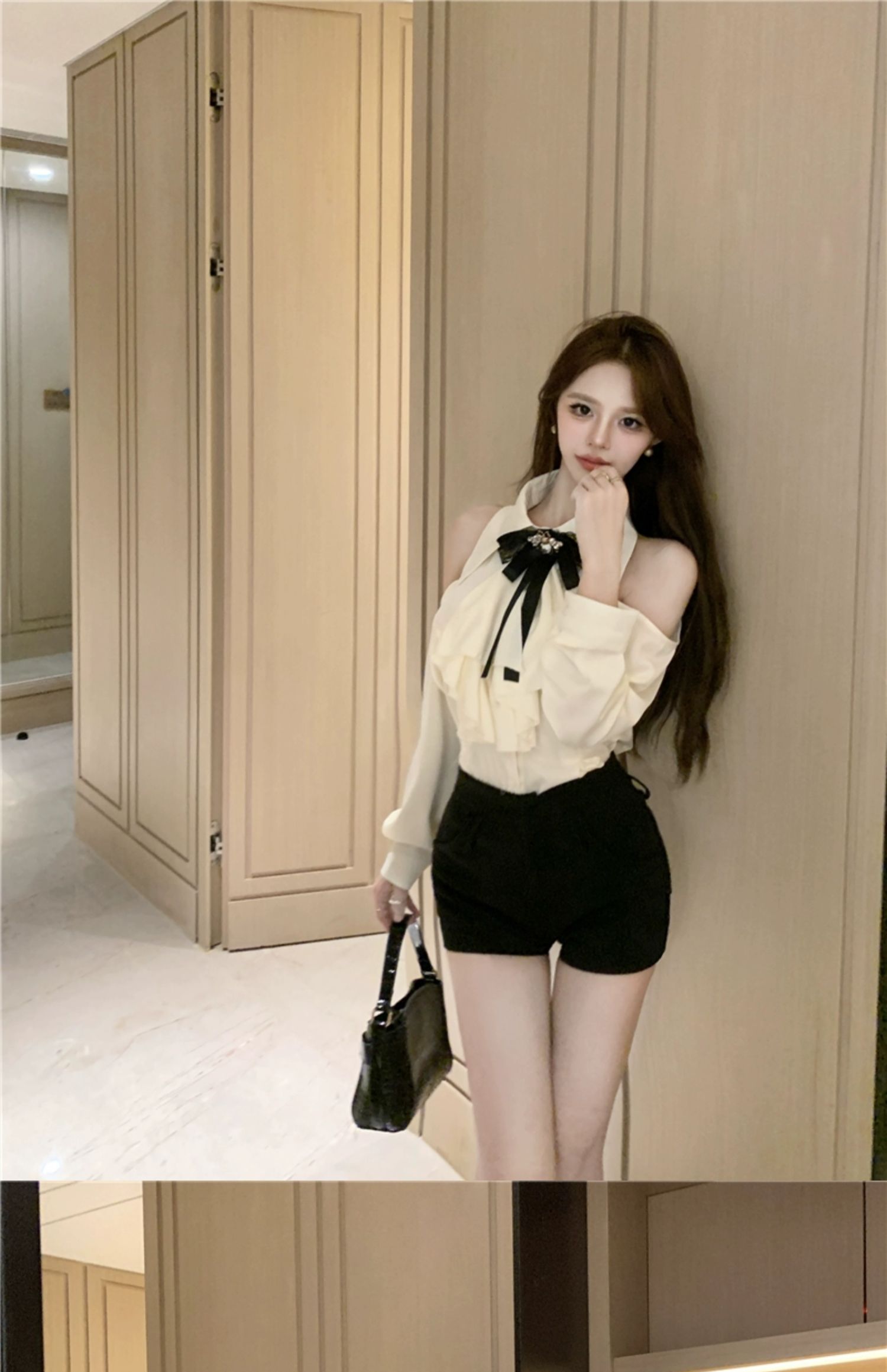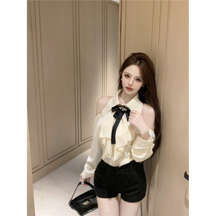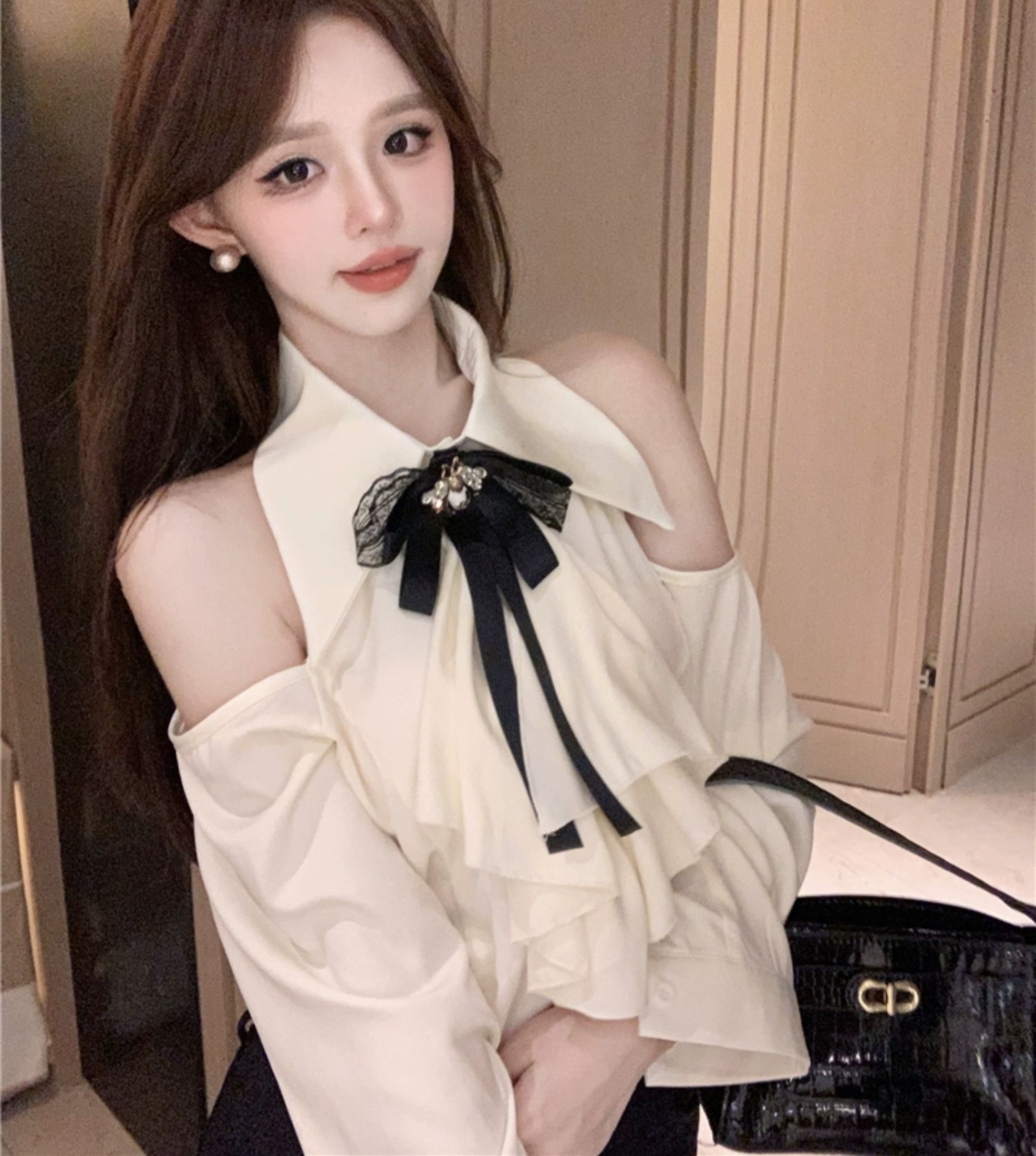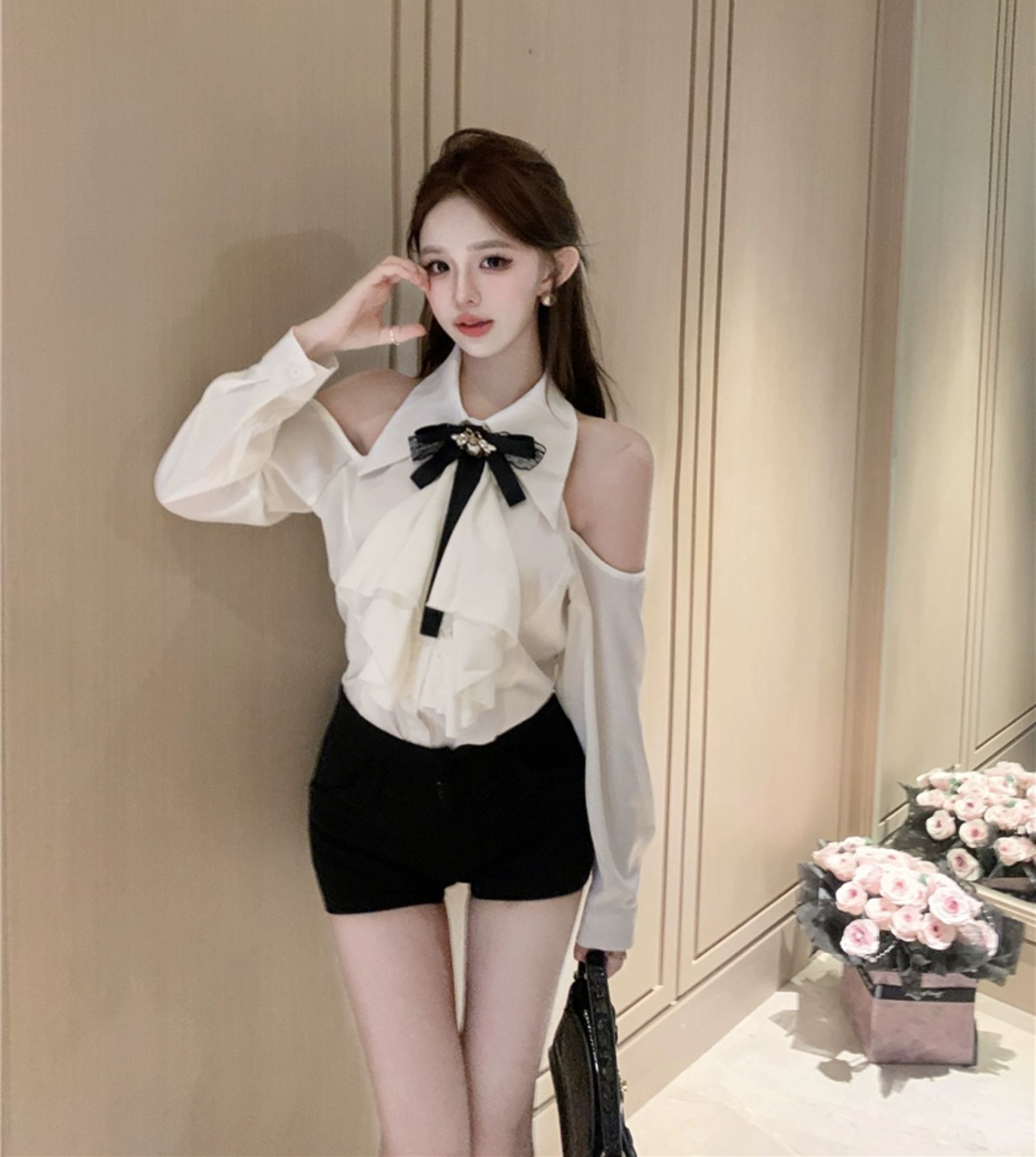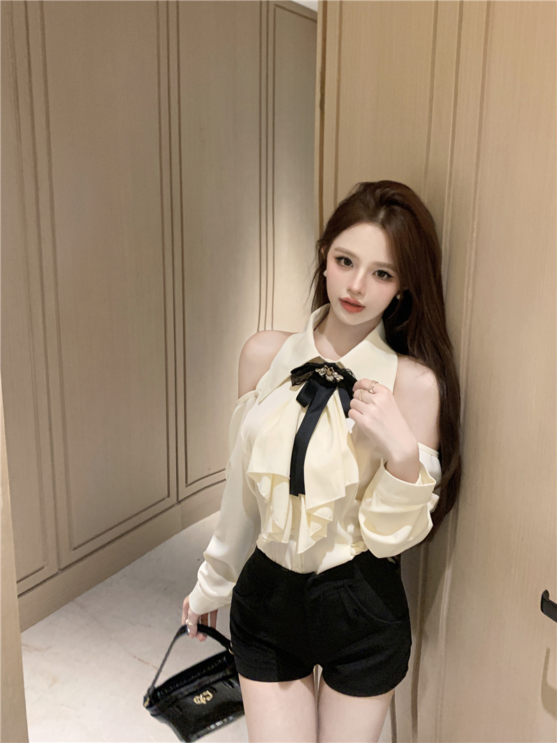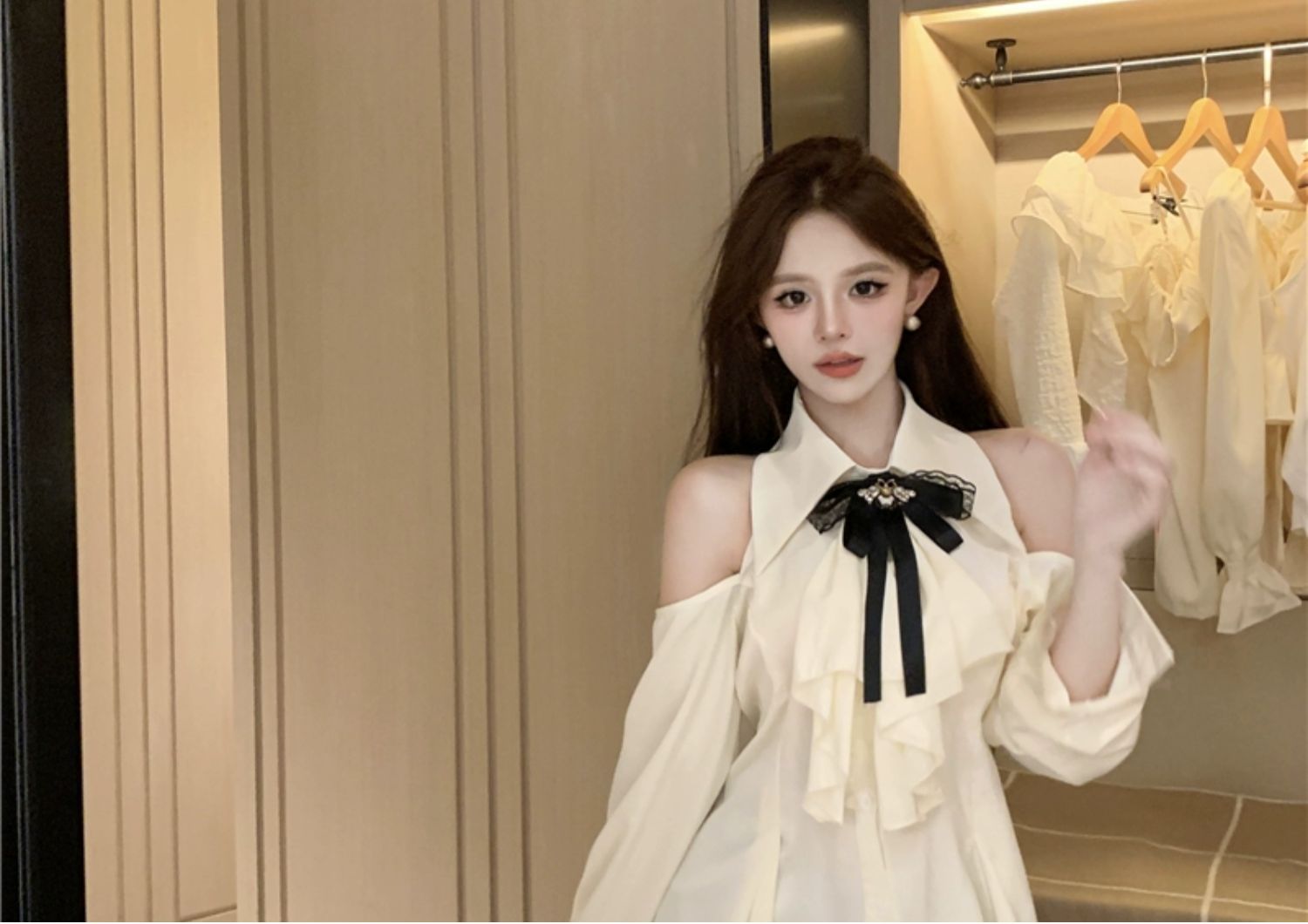 荷葉邊蝴蝶結襯衫女早秋純欲辣妹掛脖露肩上衣宮廷風法式白色襯衣