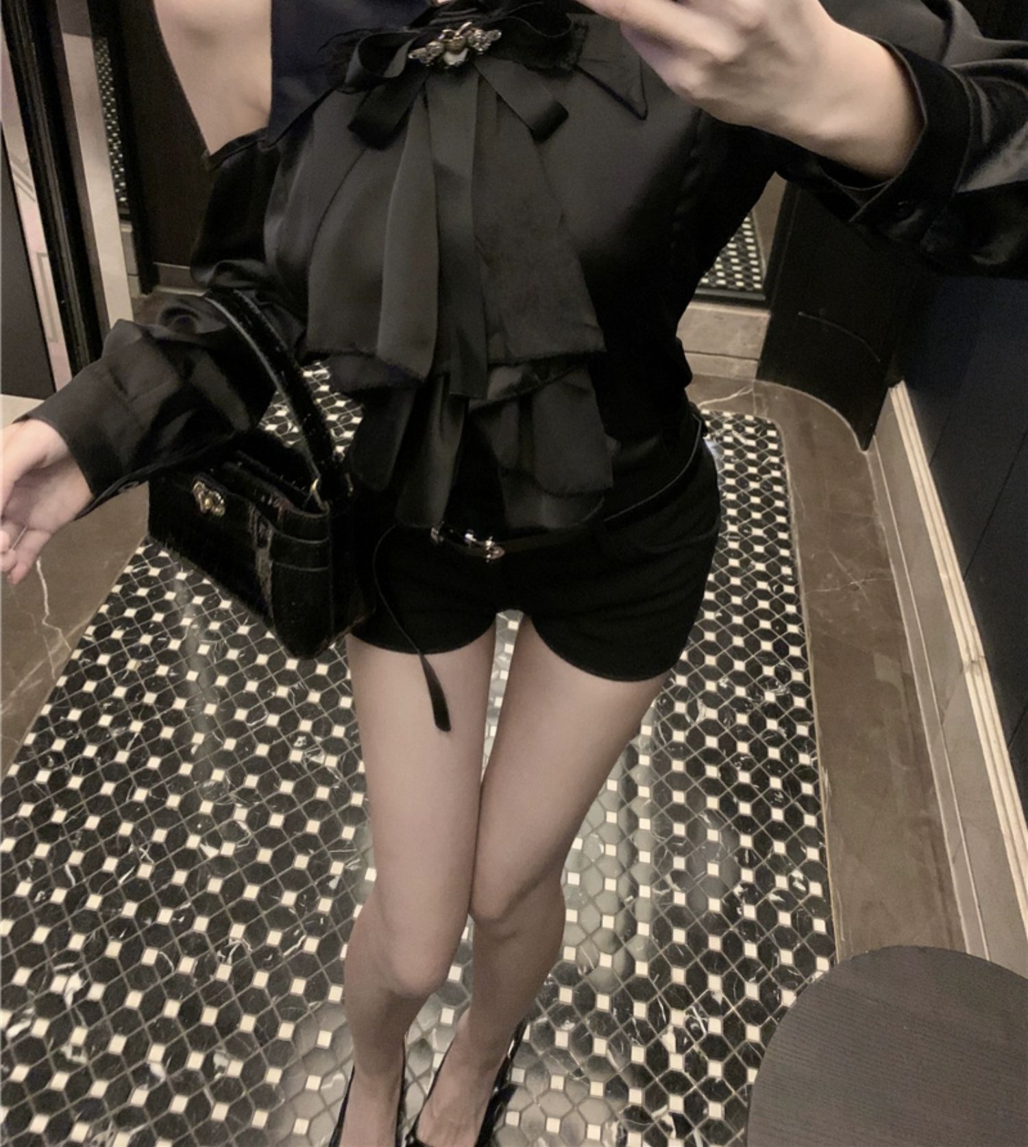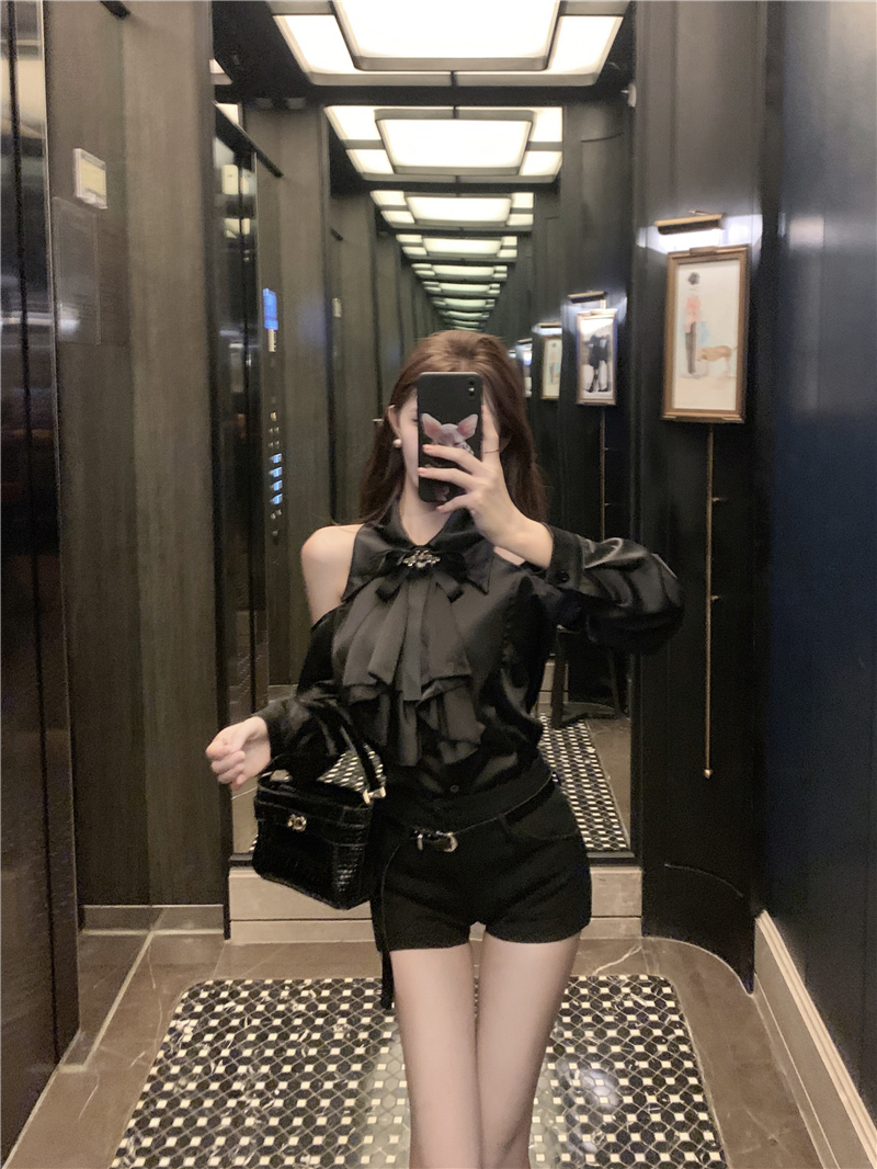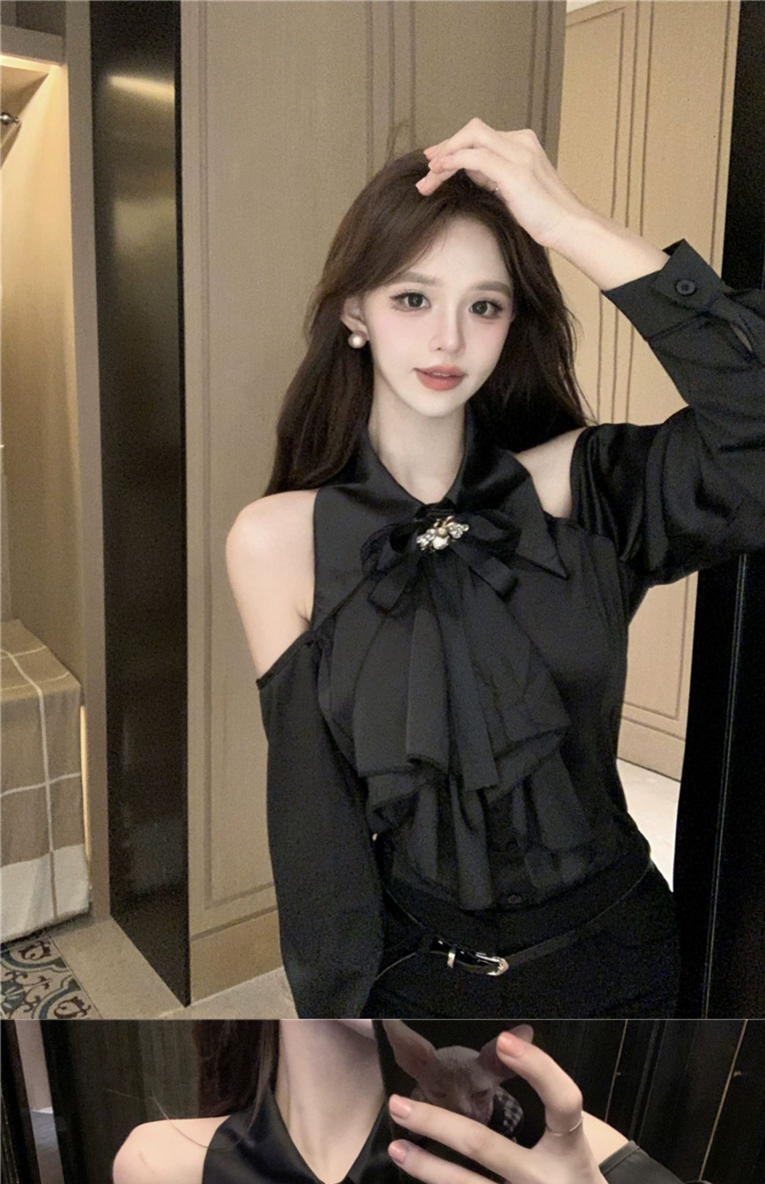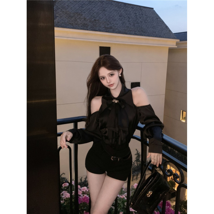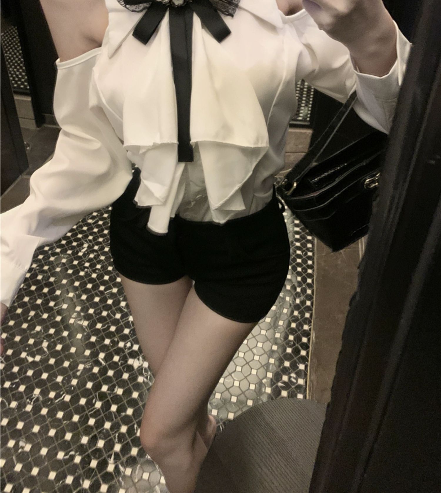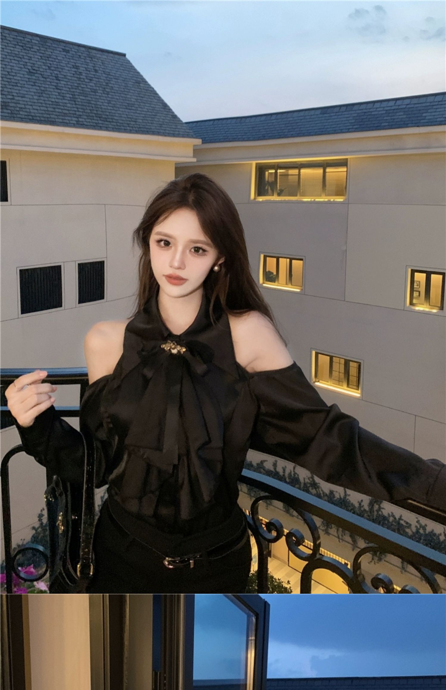 荷葉邊蝴蝶結襯衫女早秋純欲辣妹掛脖露肩上衣宮廷風法式白色襯衣