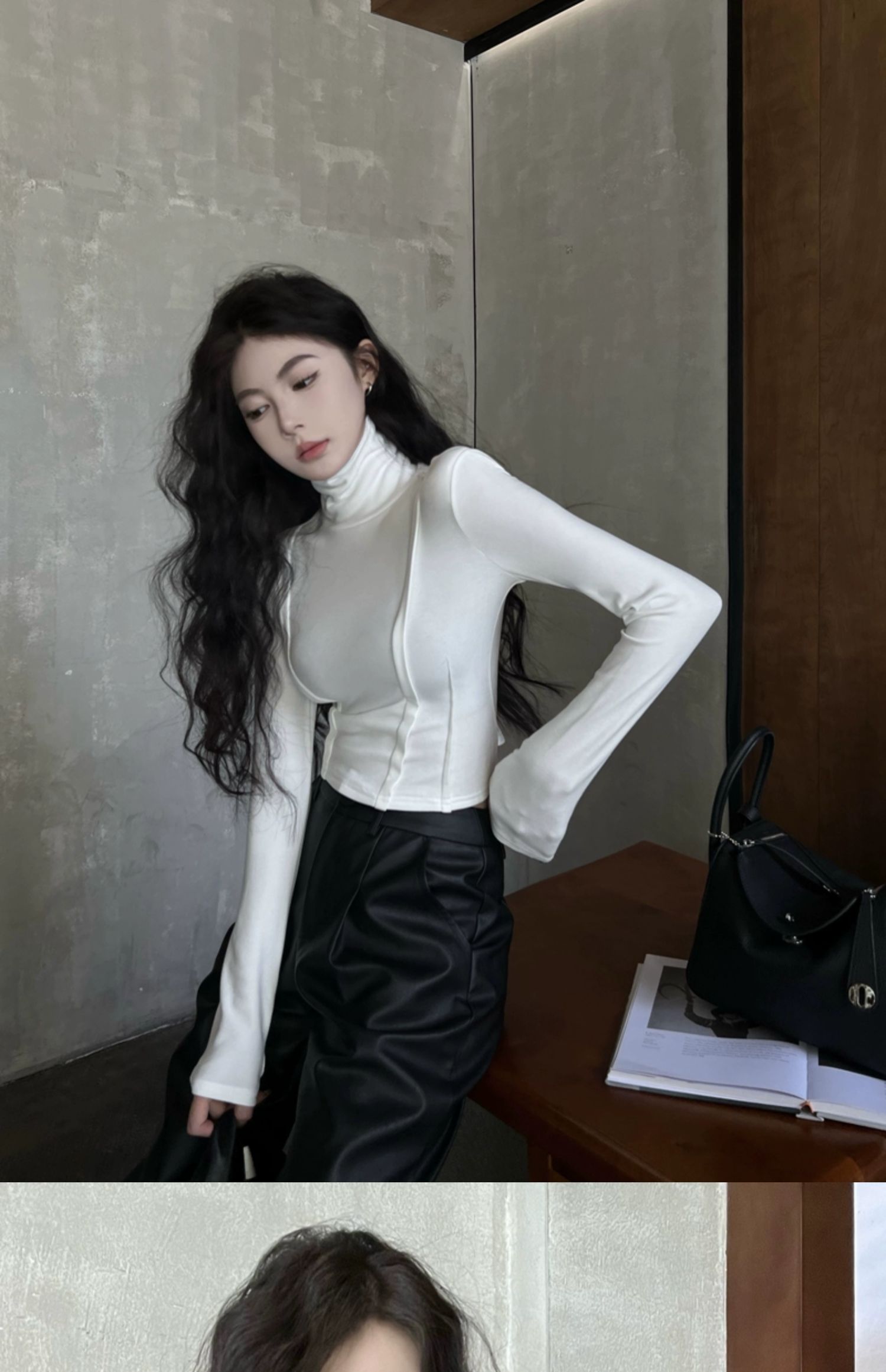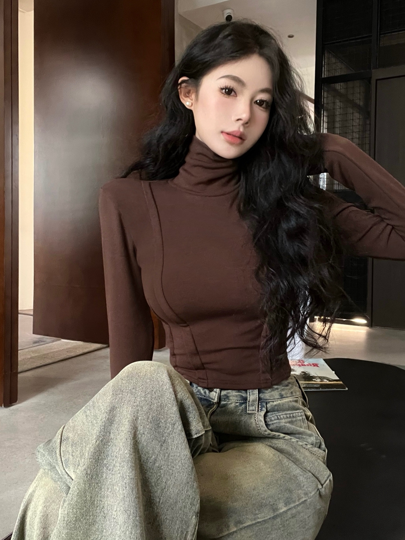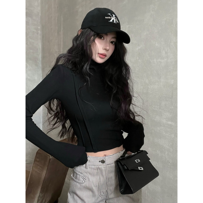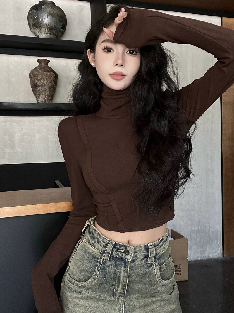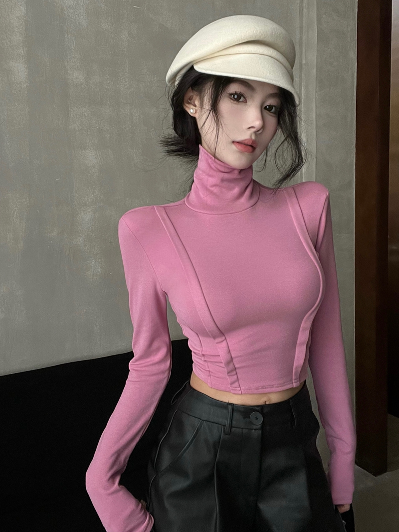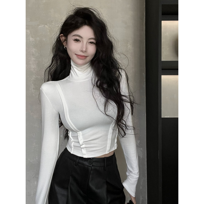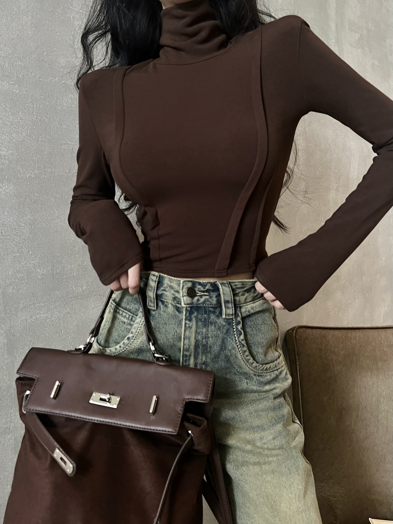 純欲辣妹y2k美拉德魚骨上衣女秋冬墊肩長袖t恤高領加絨打底衫內搭