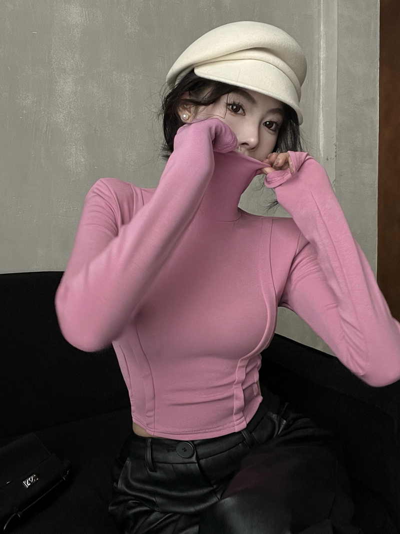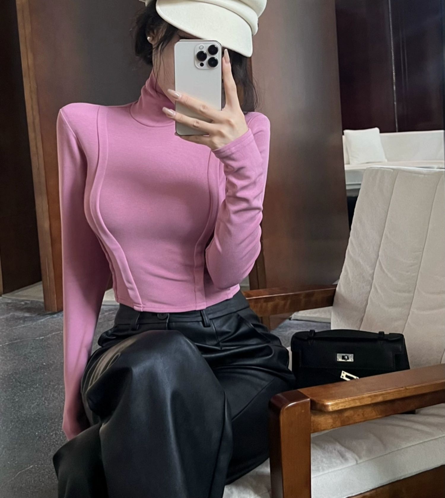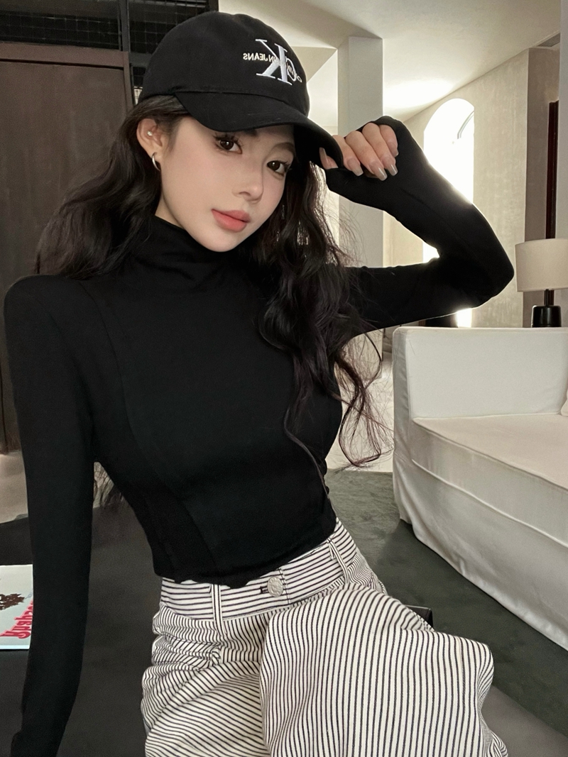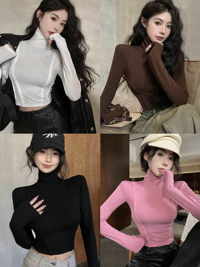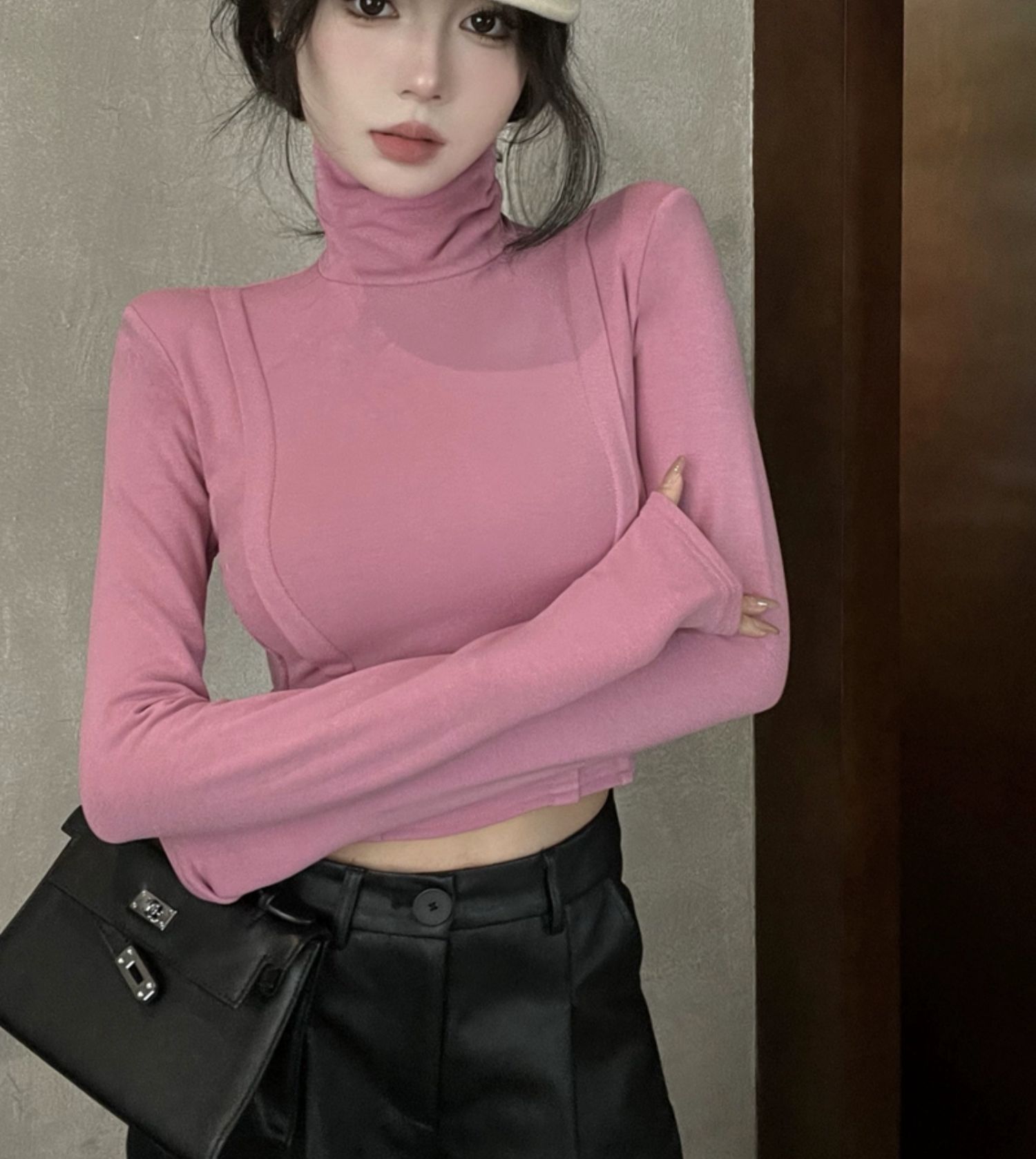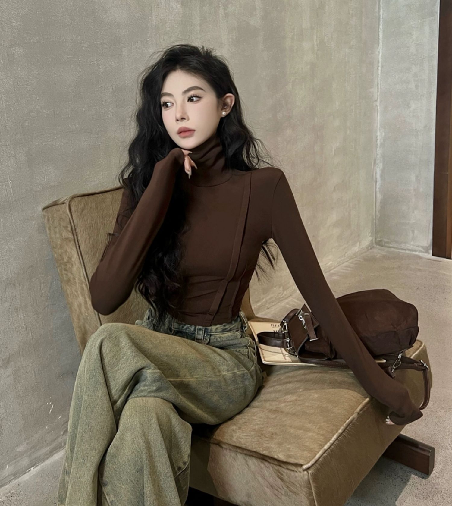 純欲辣妹y2k美拉德魚骨上衣女秋冬墊肩長袖t恤高領加絨打底衫內搭