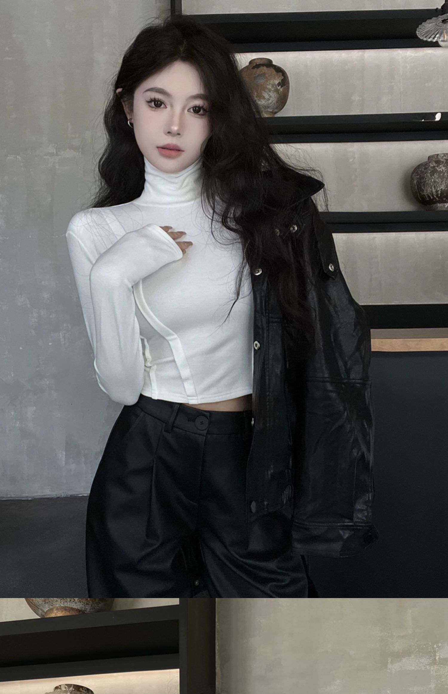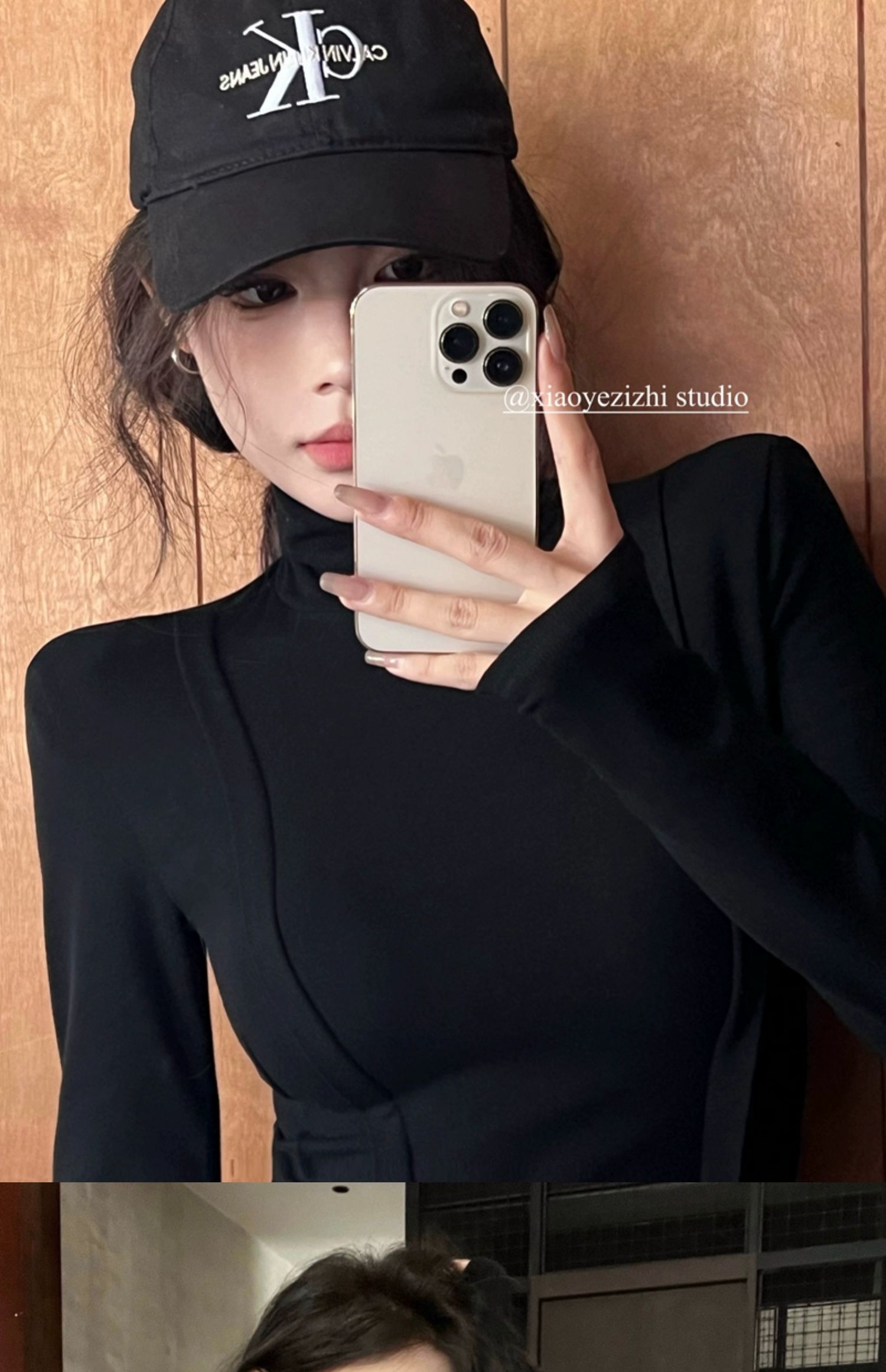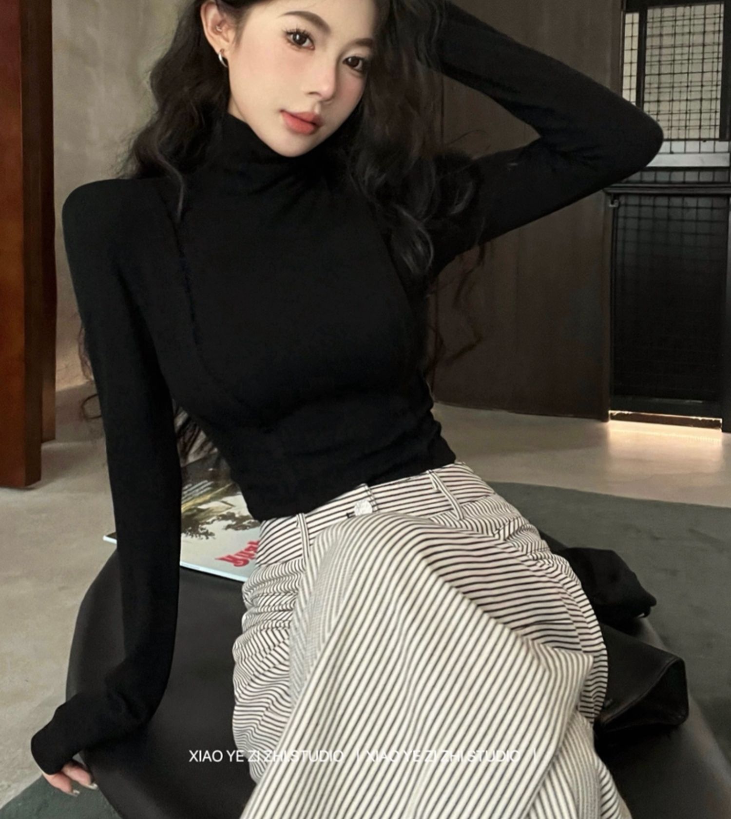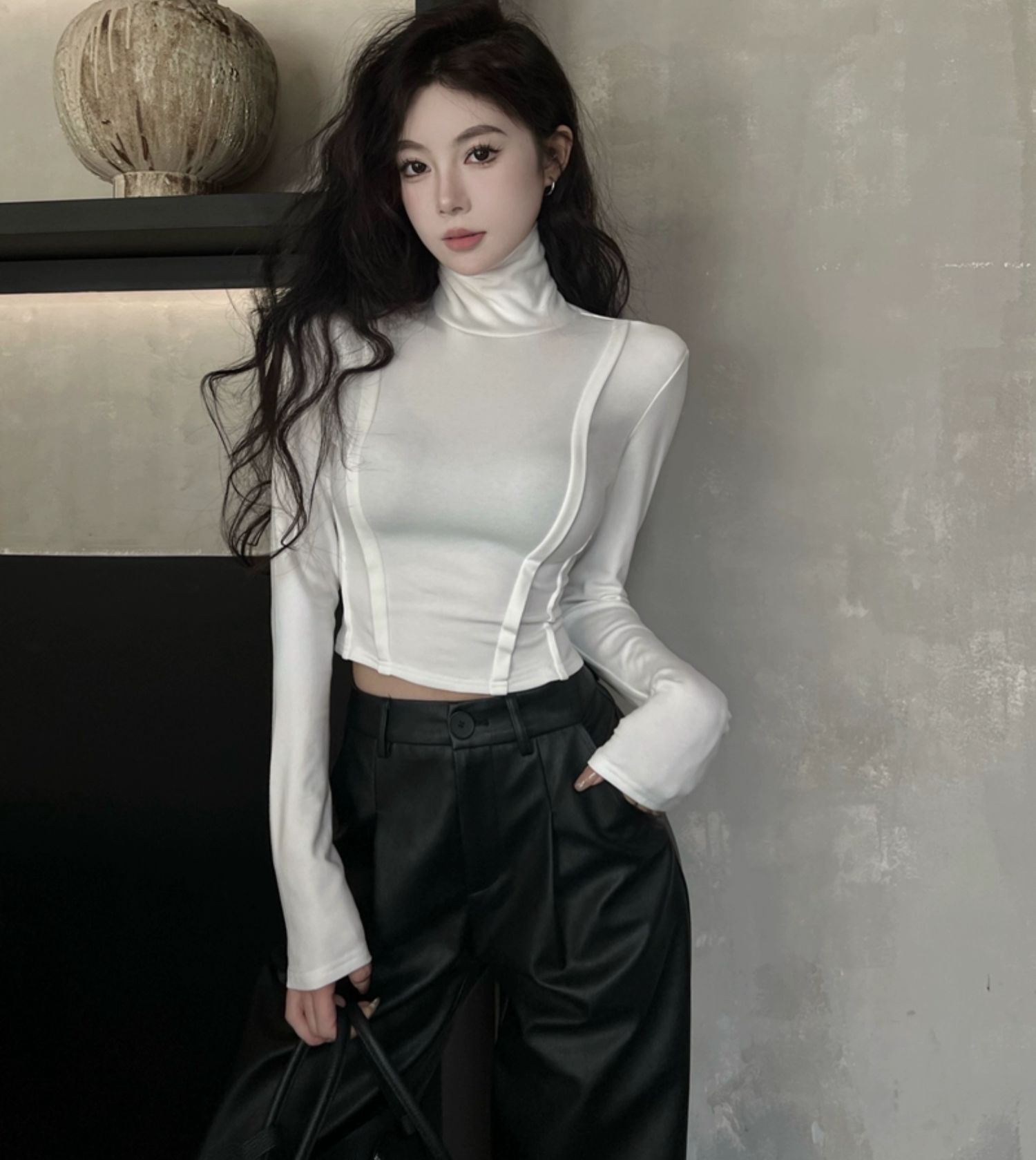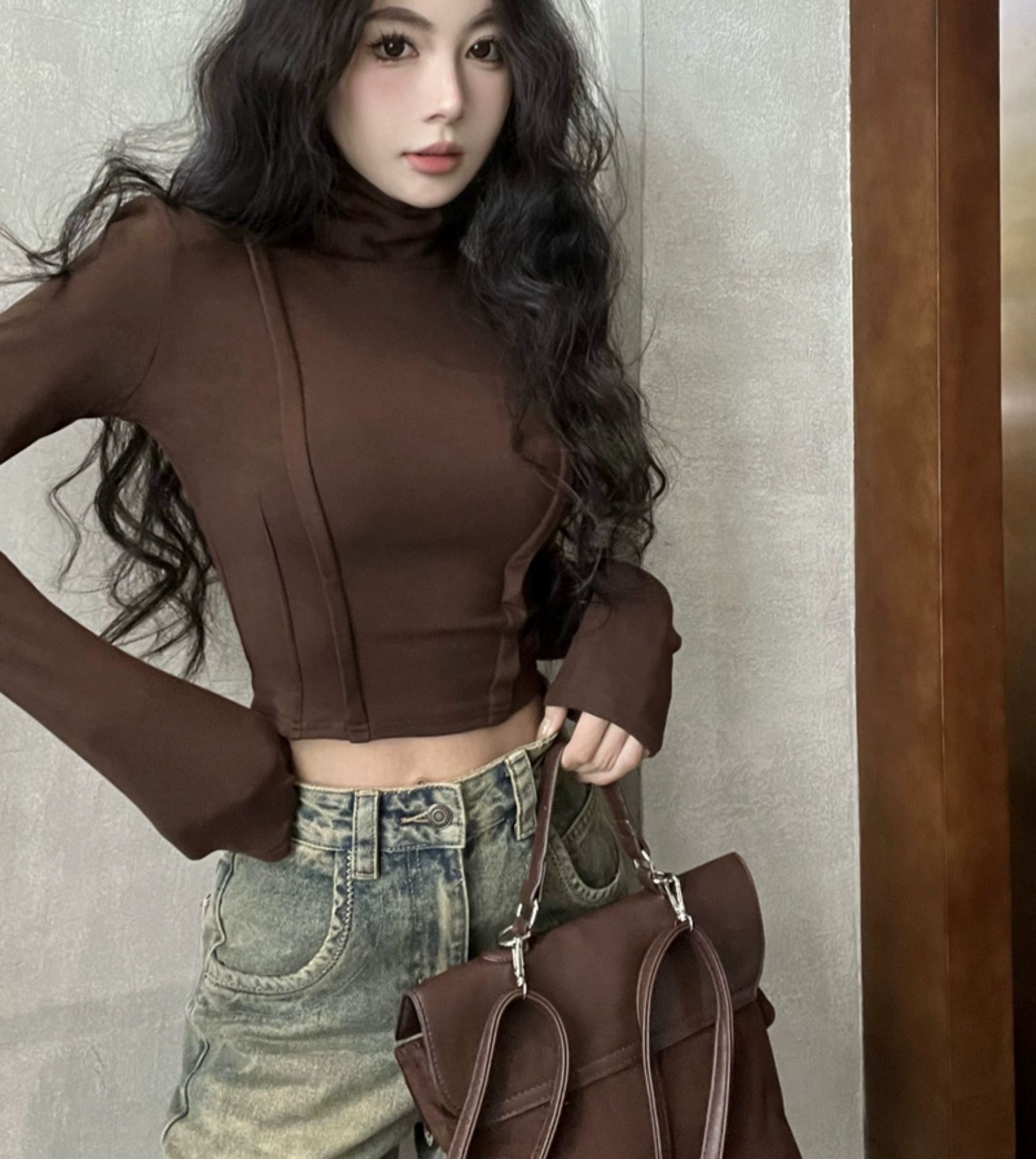 純欲辣妹y2k美拉德魚骨上衣女秋冬墊肩長袖t恤高領加絨打底衫內搭