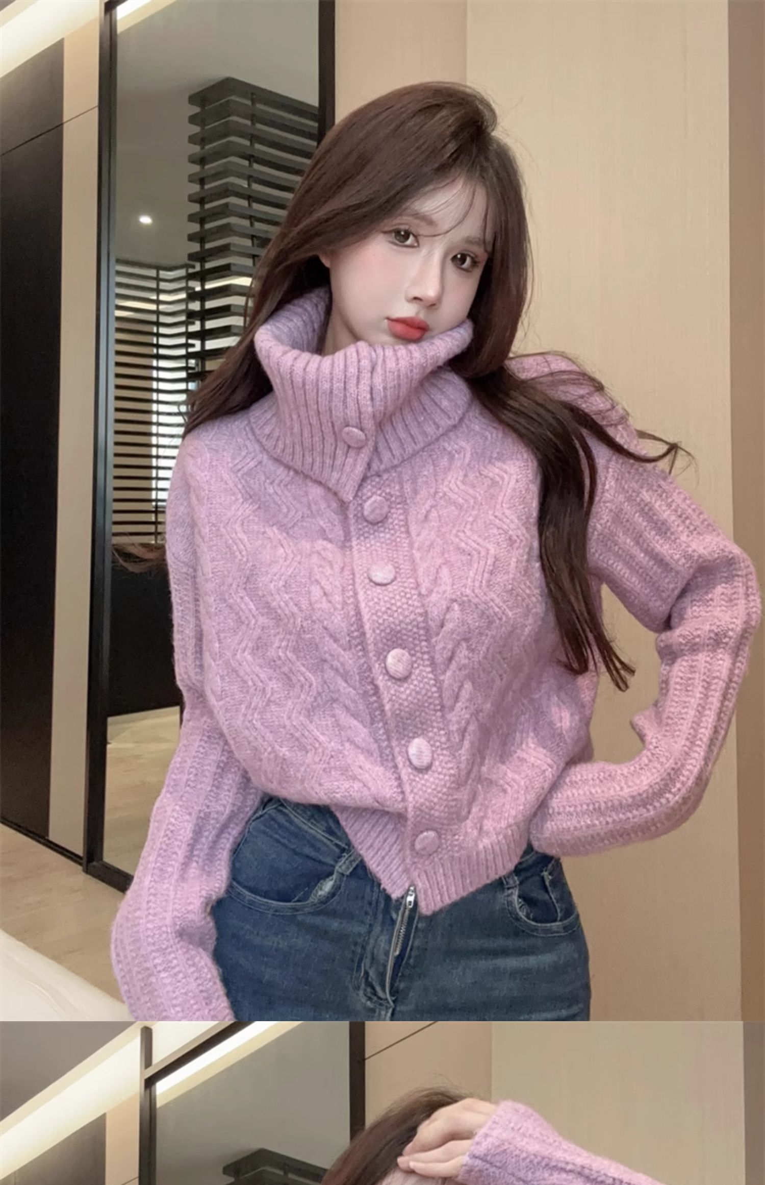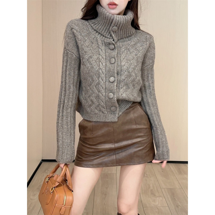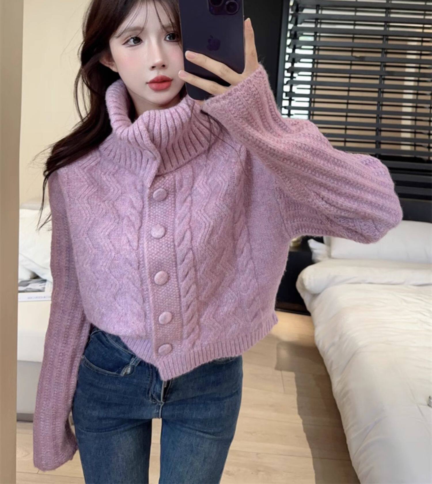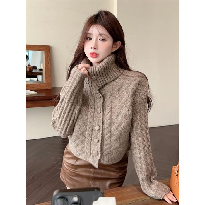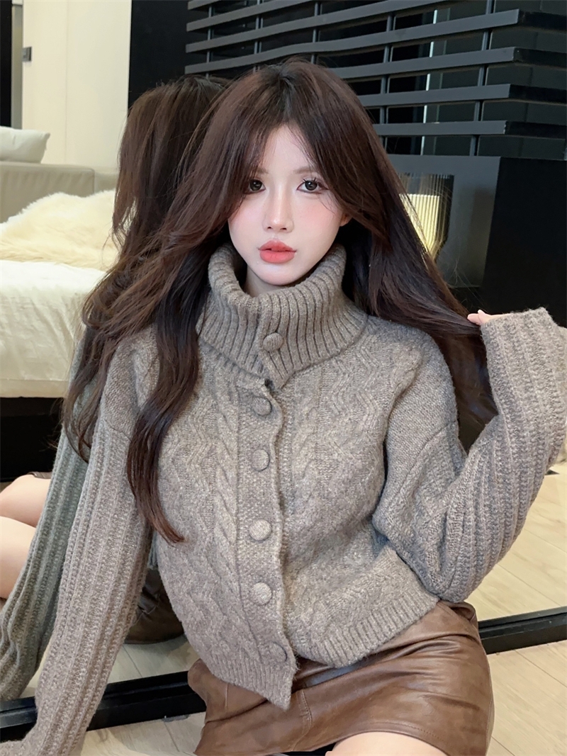 美拉德慵懶風高領毛衣女秋冬外穿高級感加厚短款針織開衫外套上衣