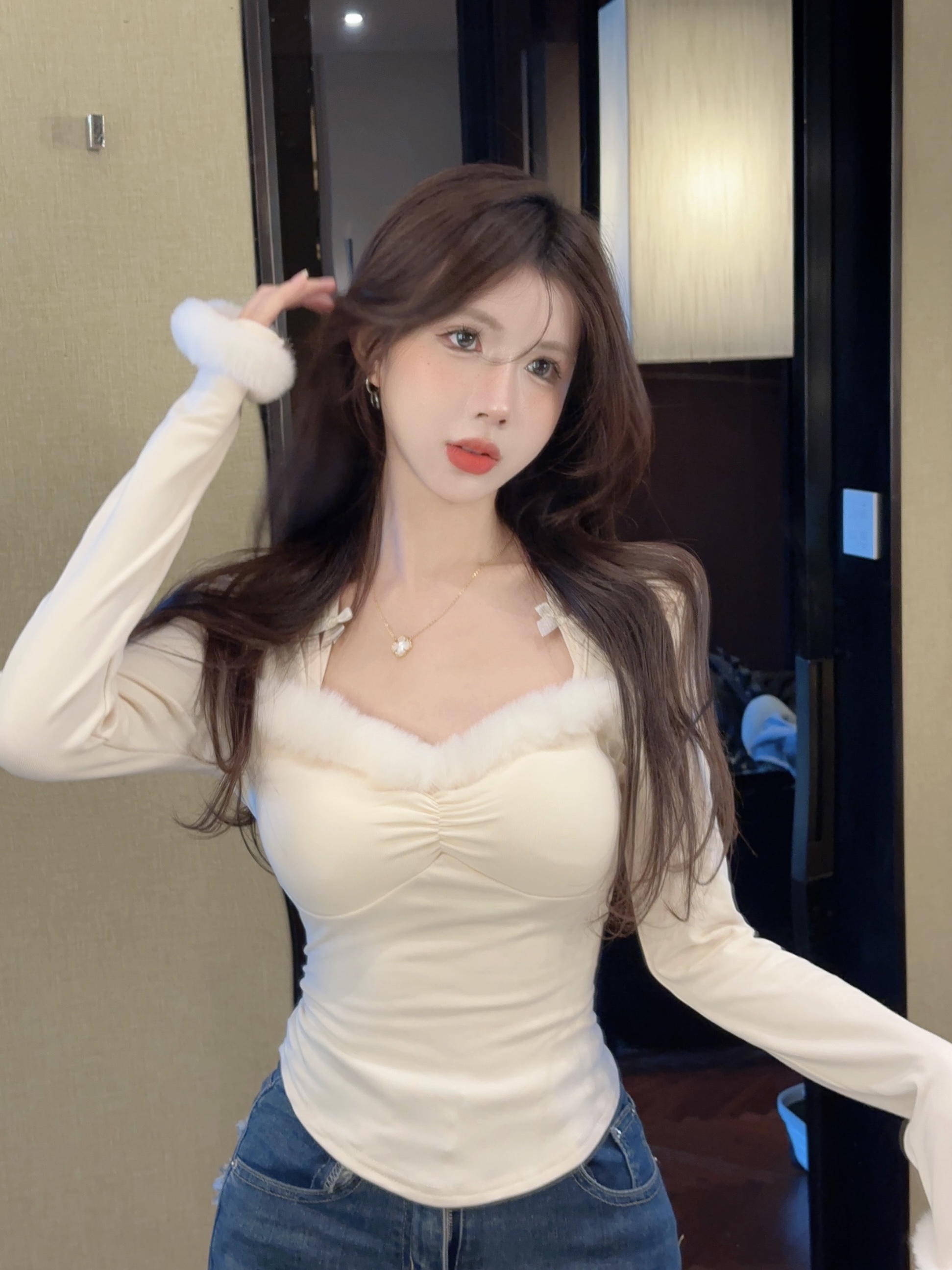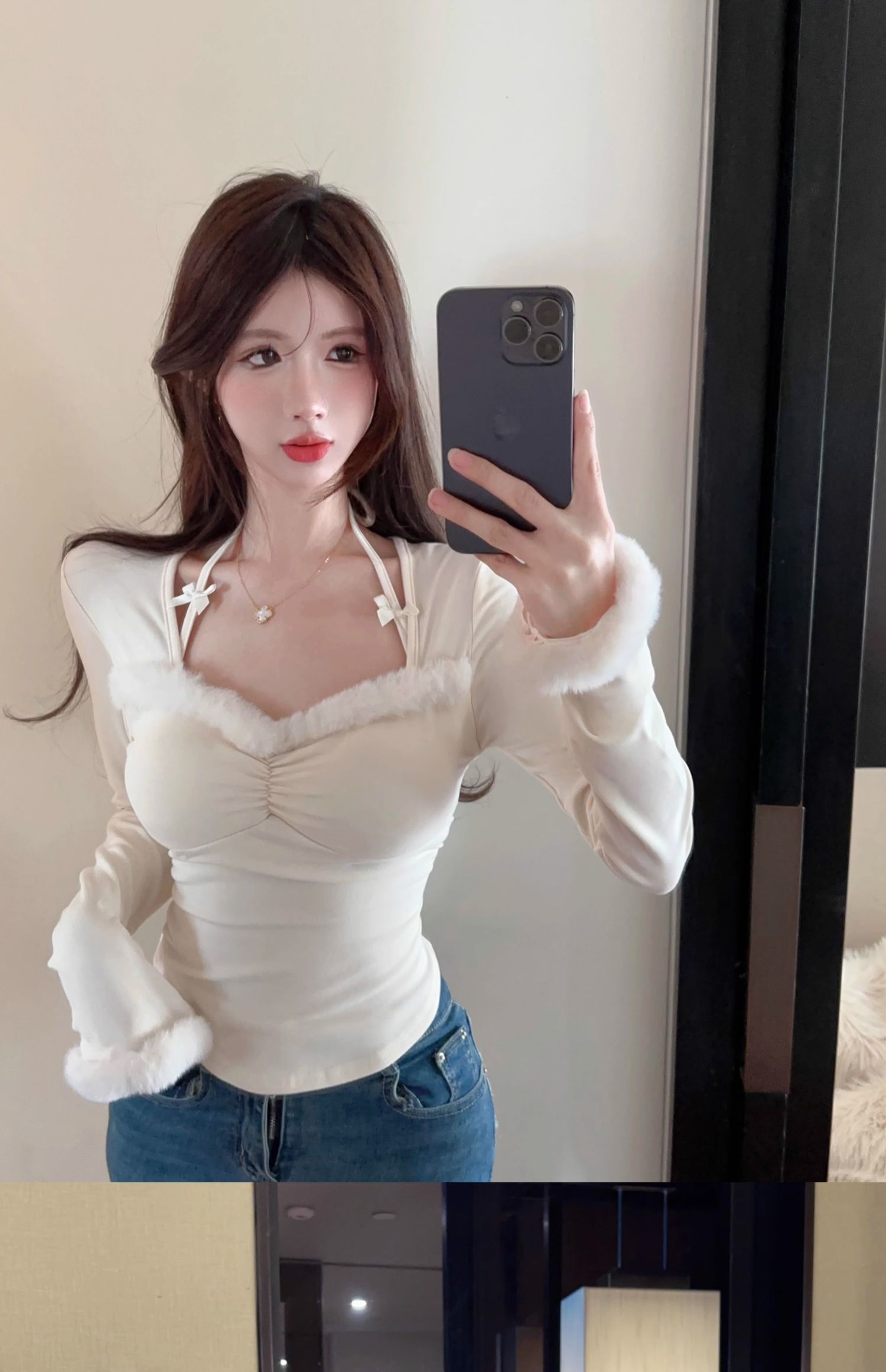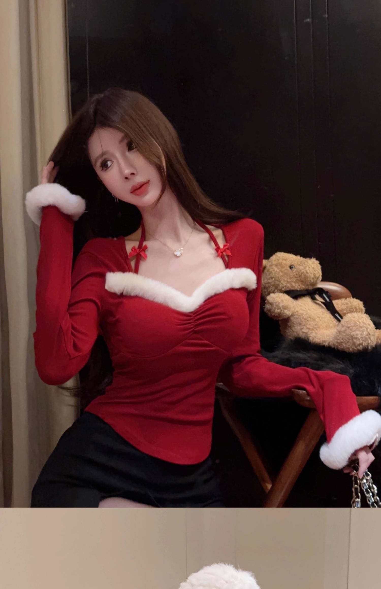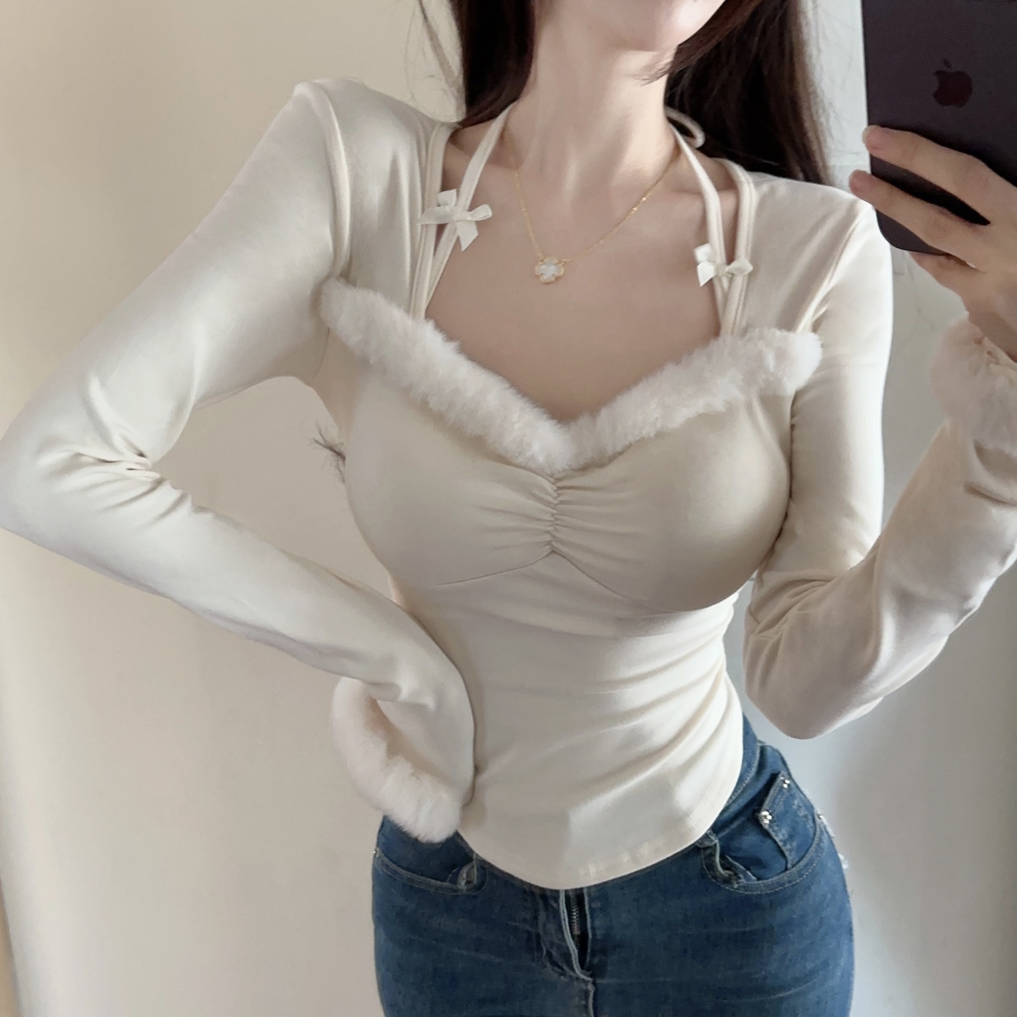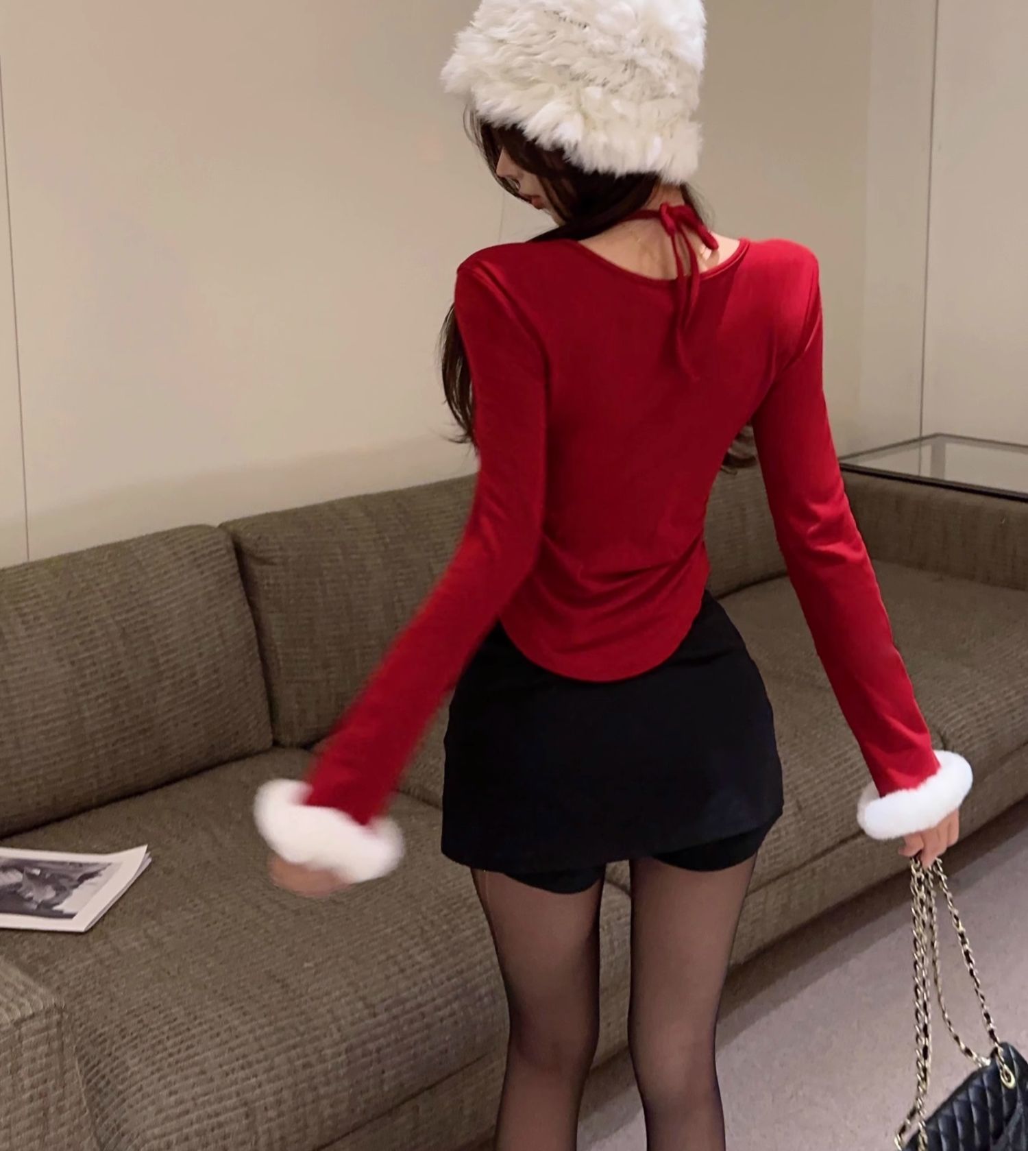 純欲辣妹掛脖毛毛上衣女秋冬聖誕節帶胸墊長袖t恤加絨打底衫內搭