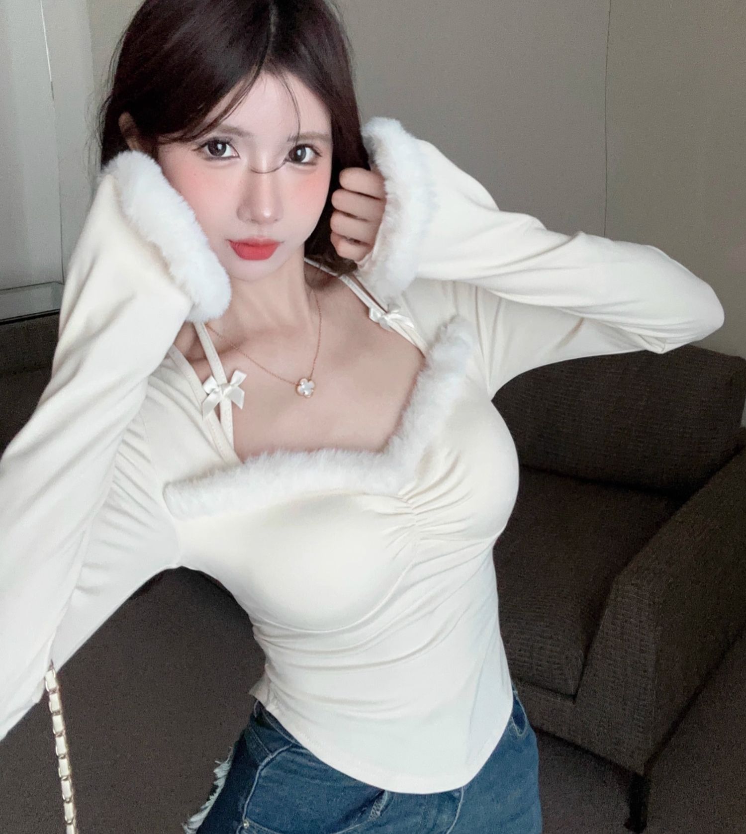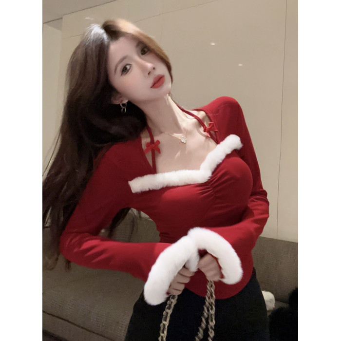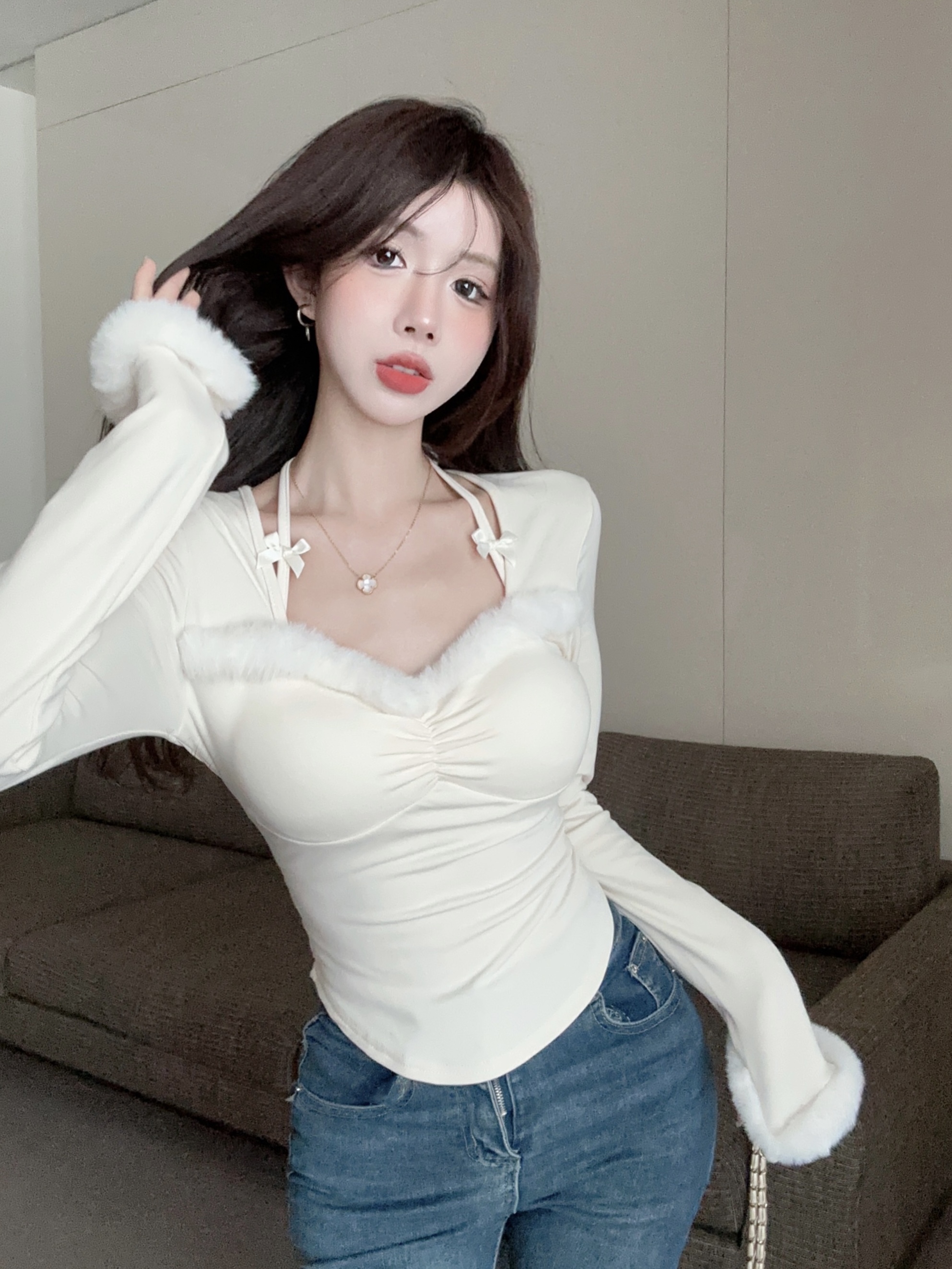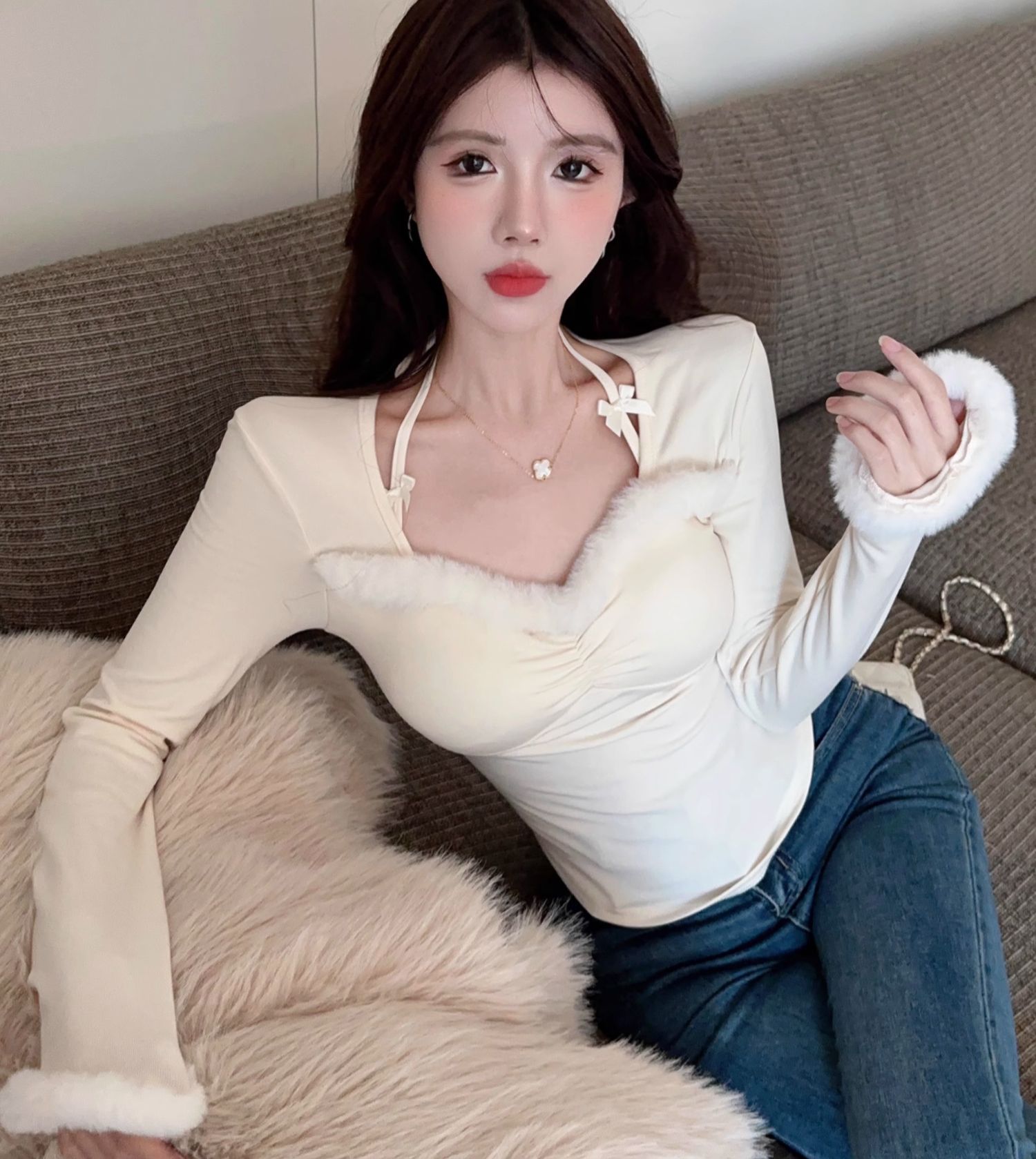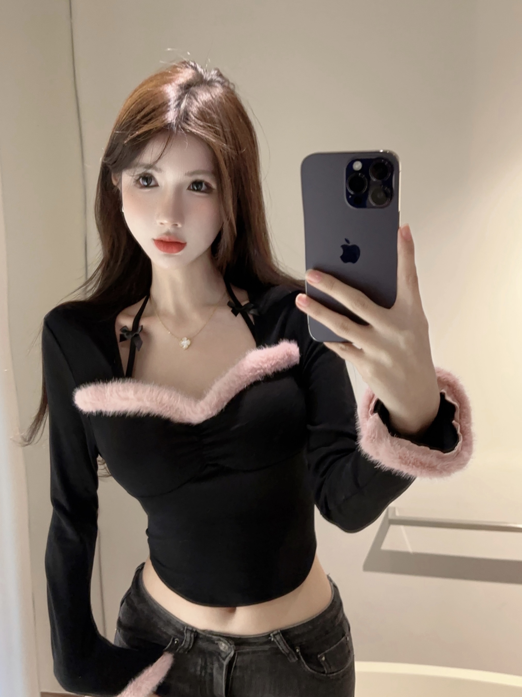 純欲辣妹掛脖毛毛上衣女秋冬聖誕節帶胸墊長袖t恤加絨打底衫內搭