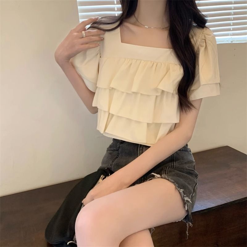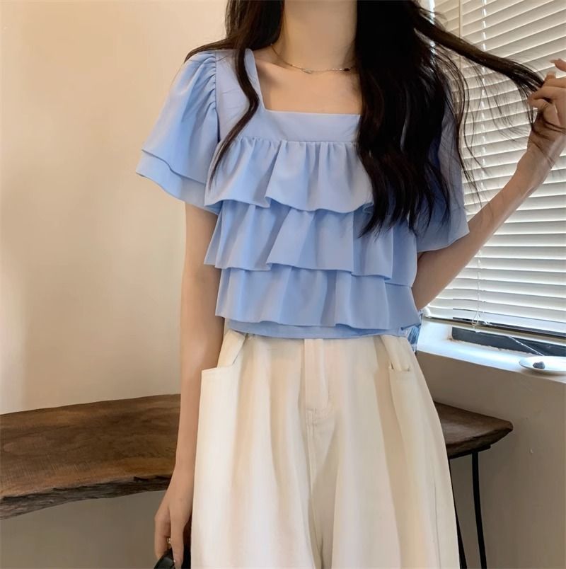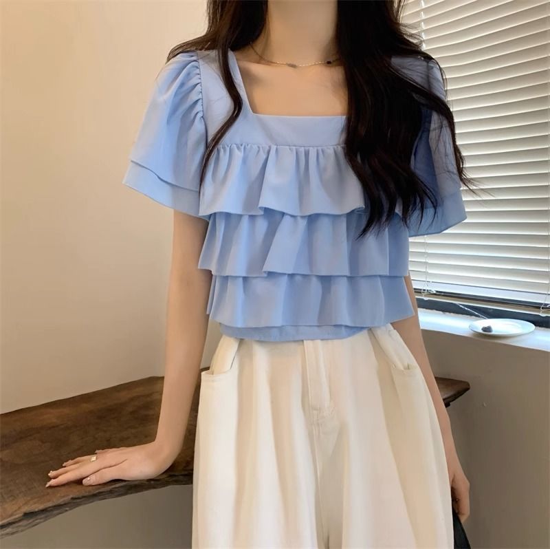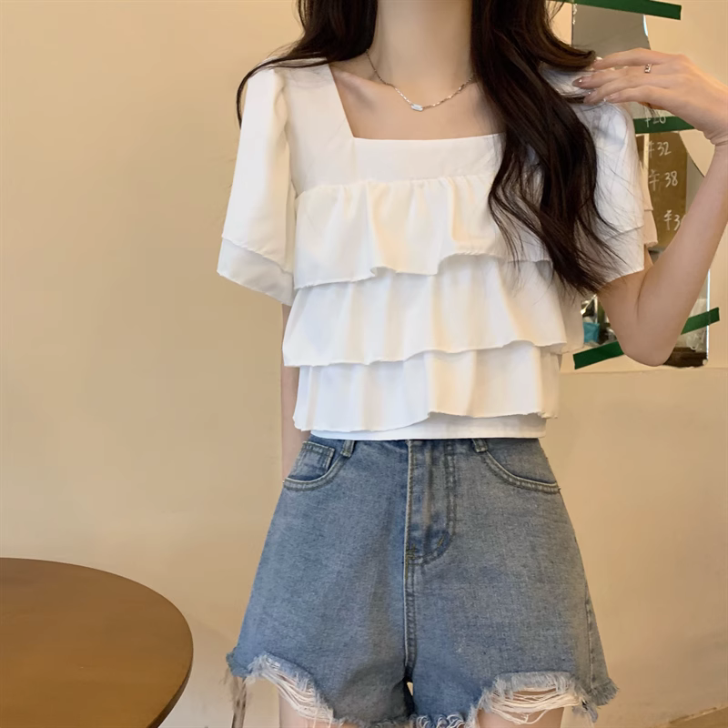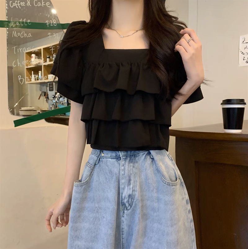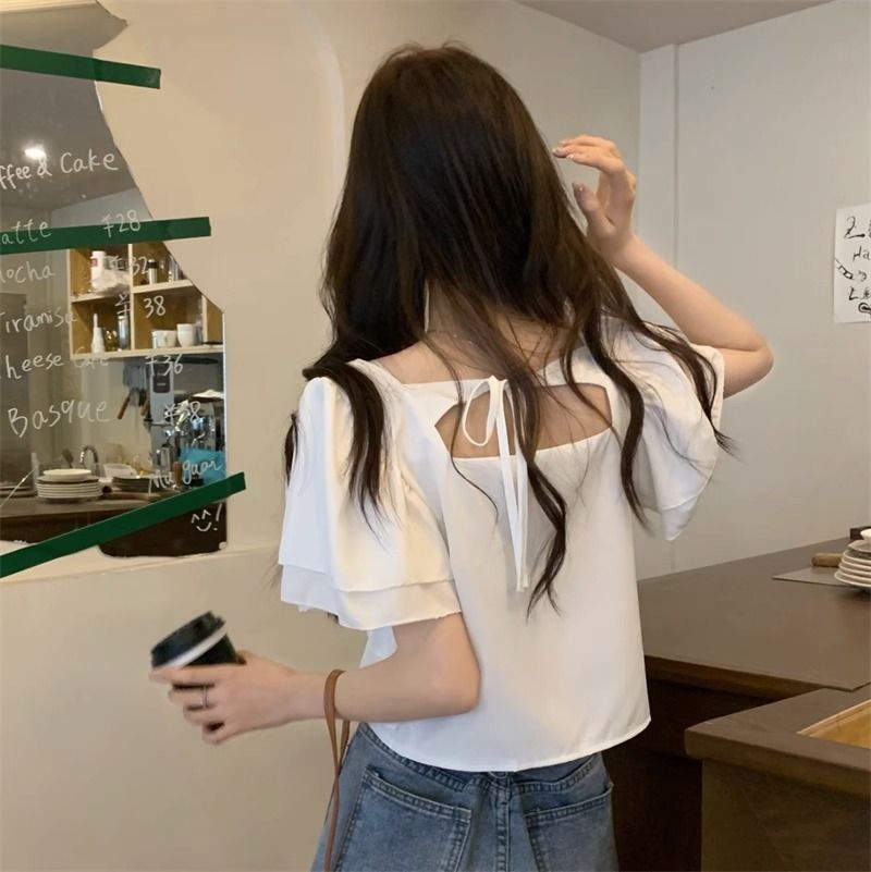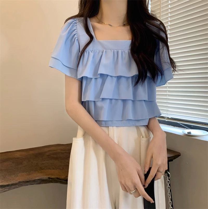 雪紡襯衫2024夏季新款韓版寬松顯瘦短袖方領百搭氣質荷葉邊上衣女