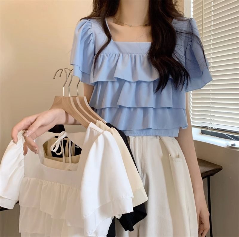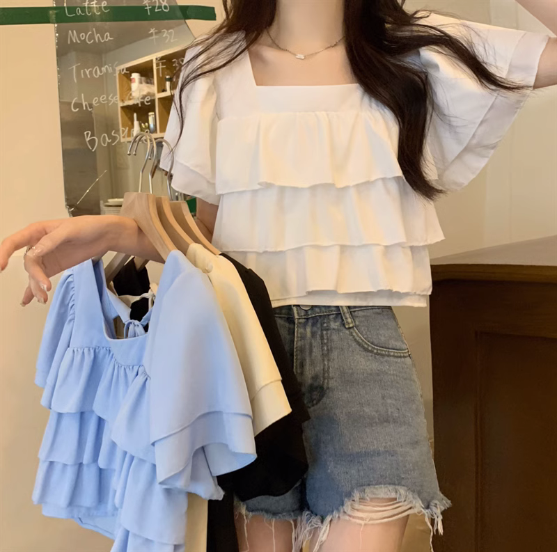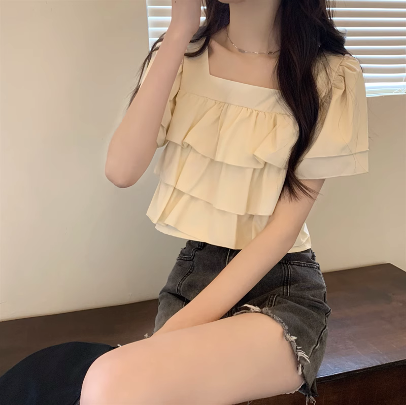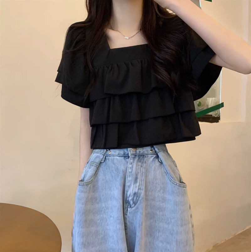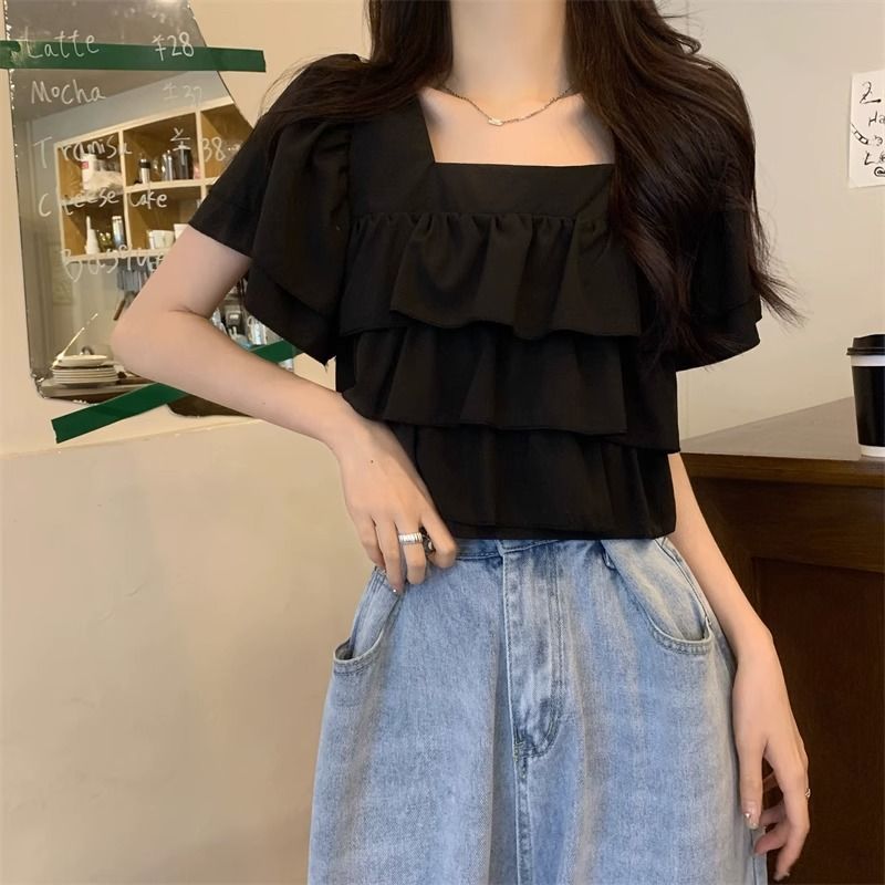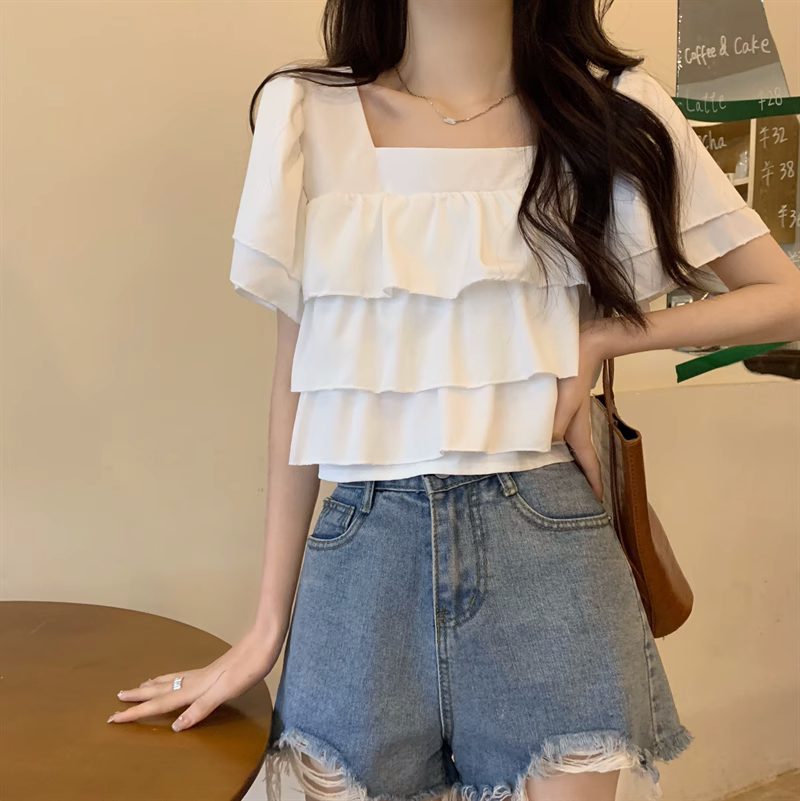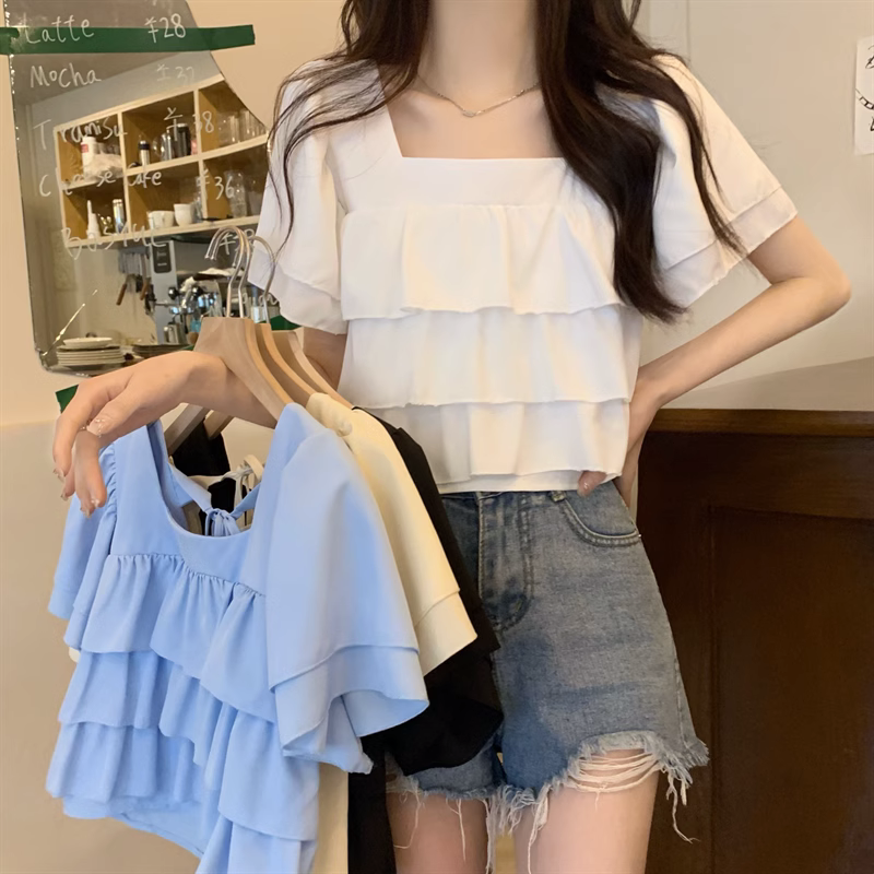 雪紡襯衫2024夏季新款韓版寬松顯瘦短袖方領百搭氣質荷葉邊上衣女