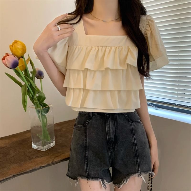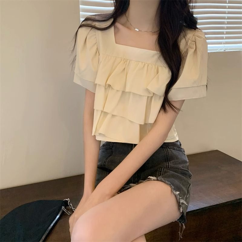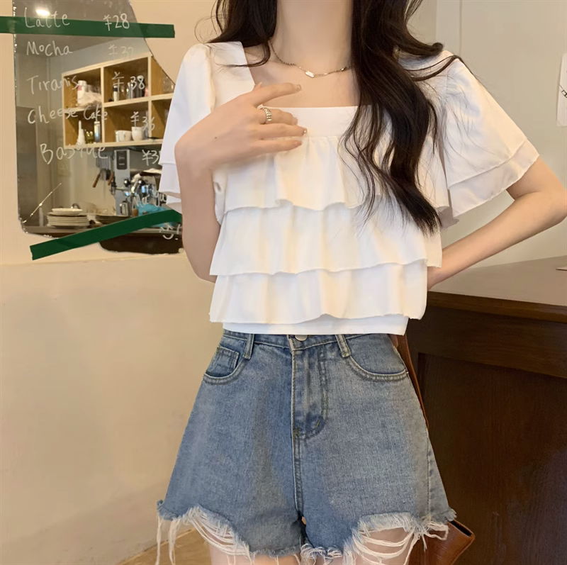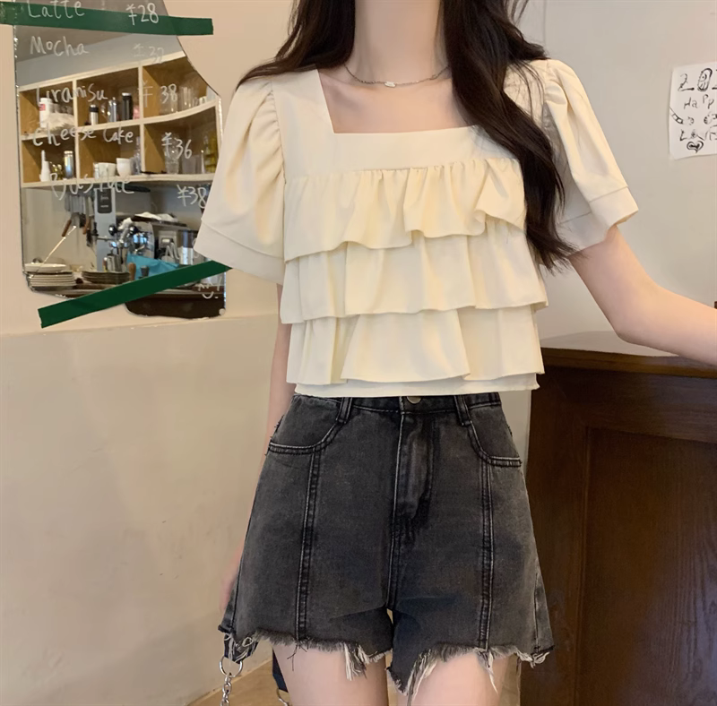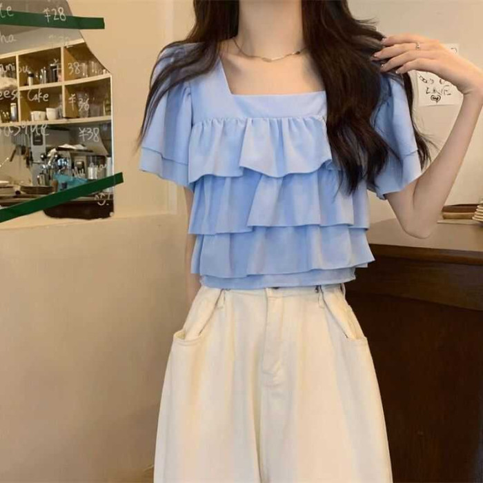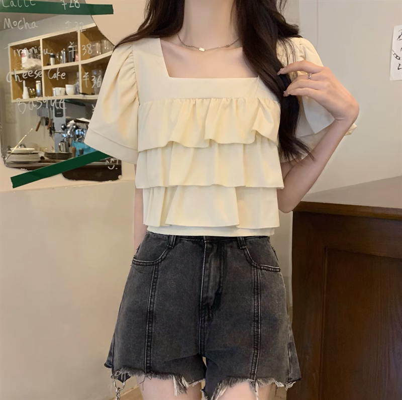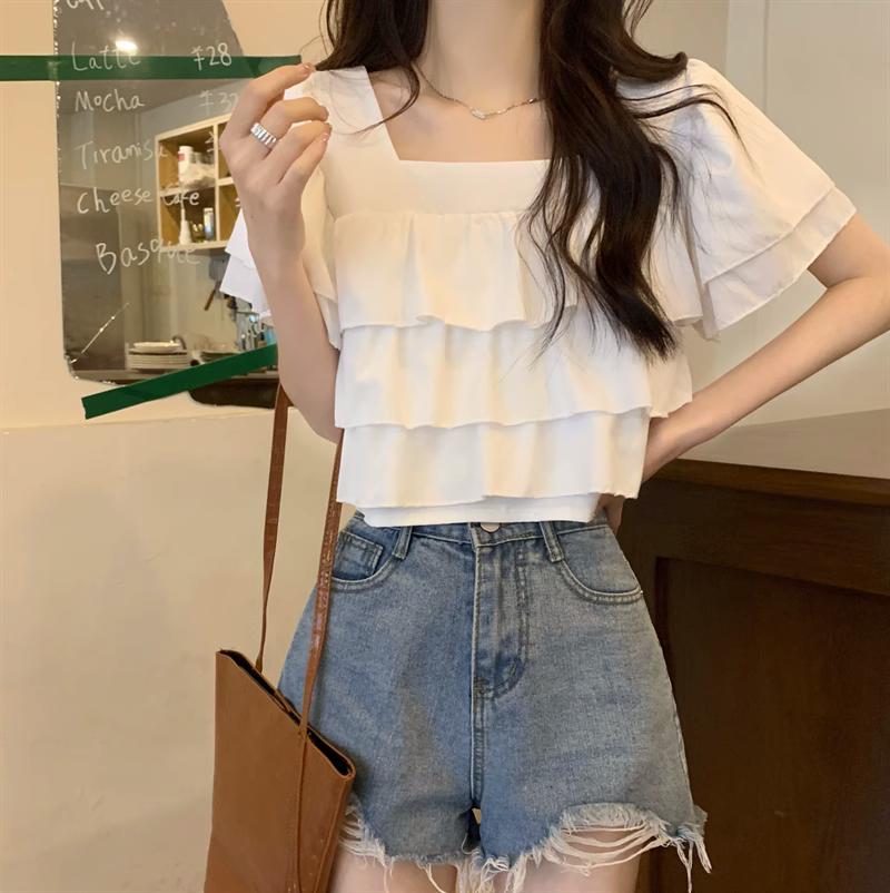 雪紡襯衫2024夏季新款韓版寬松顯瘦短袖方領百搭氣質荷葉邊上衣女