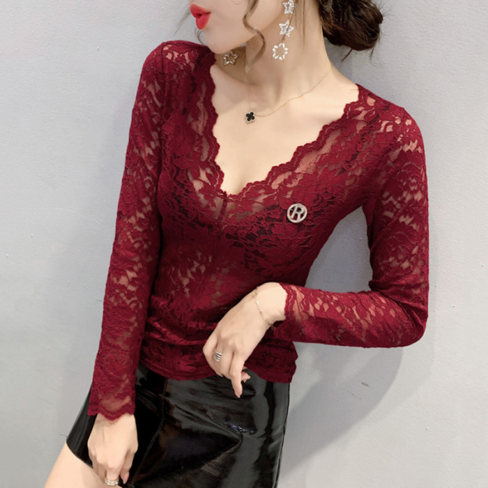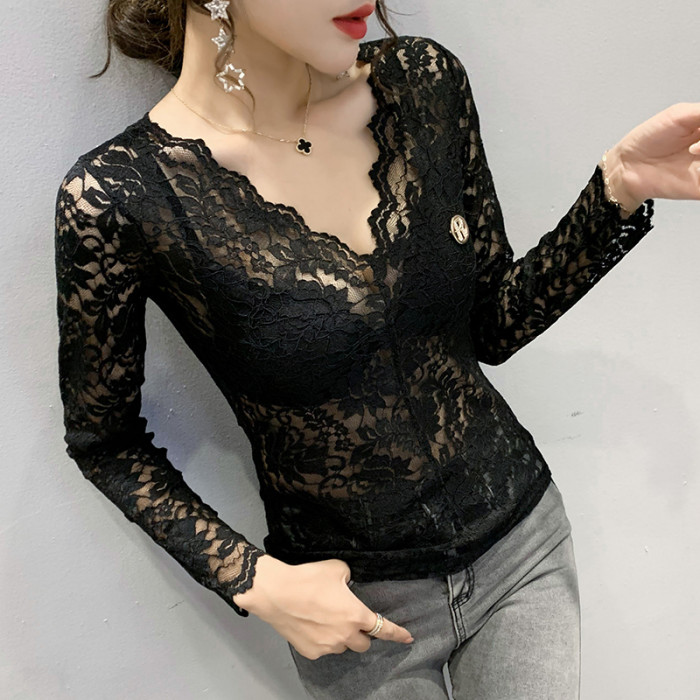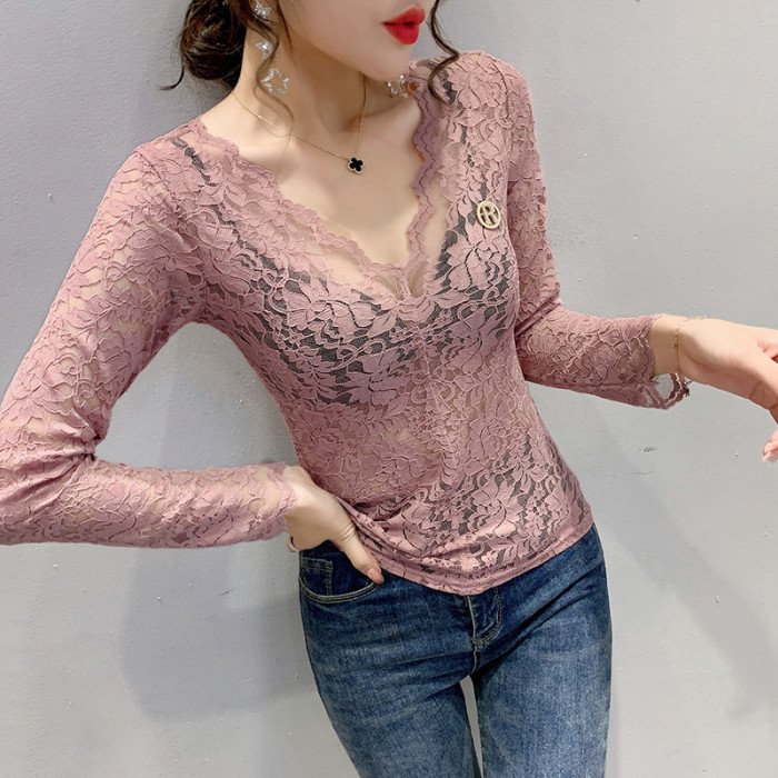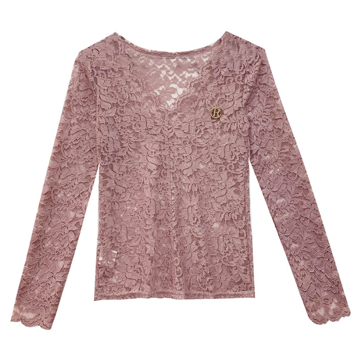 女裝2024秋季性感鏤空氣質V領蕾絲衫女長袖洋氣上衣緊身打底衫女
