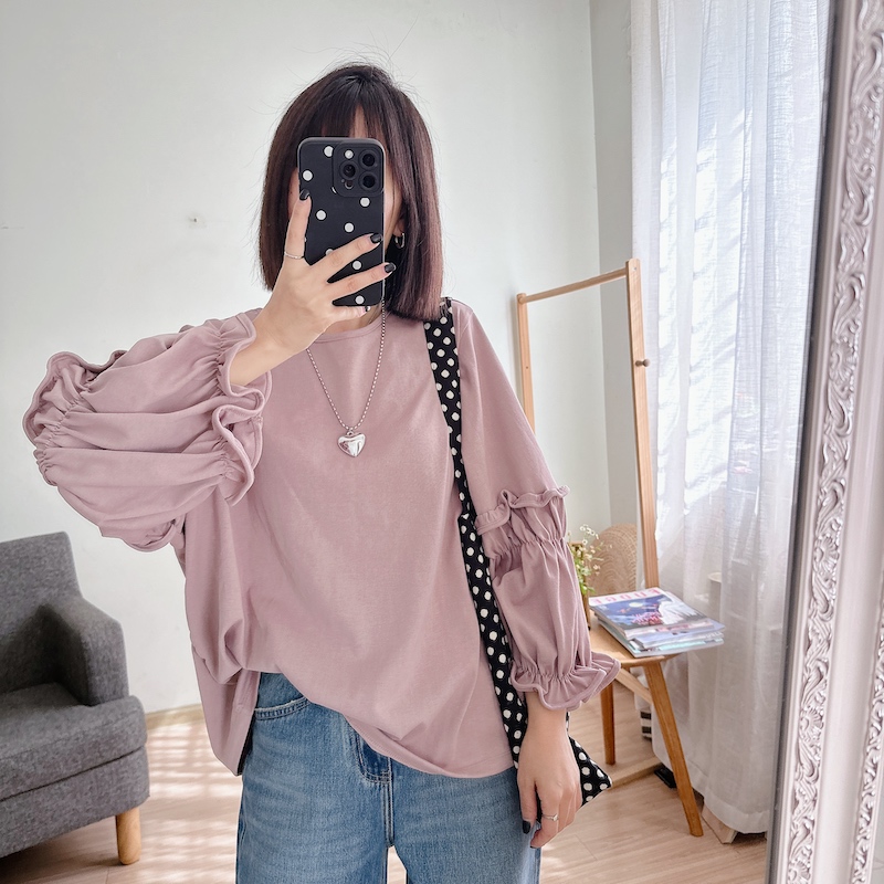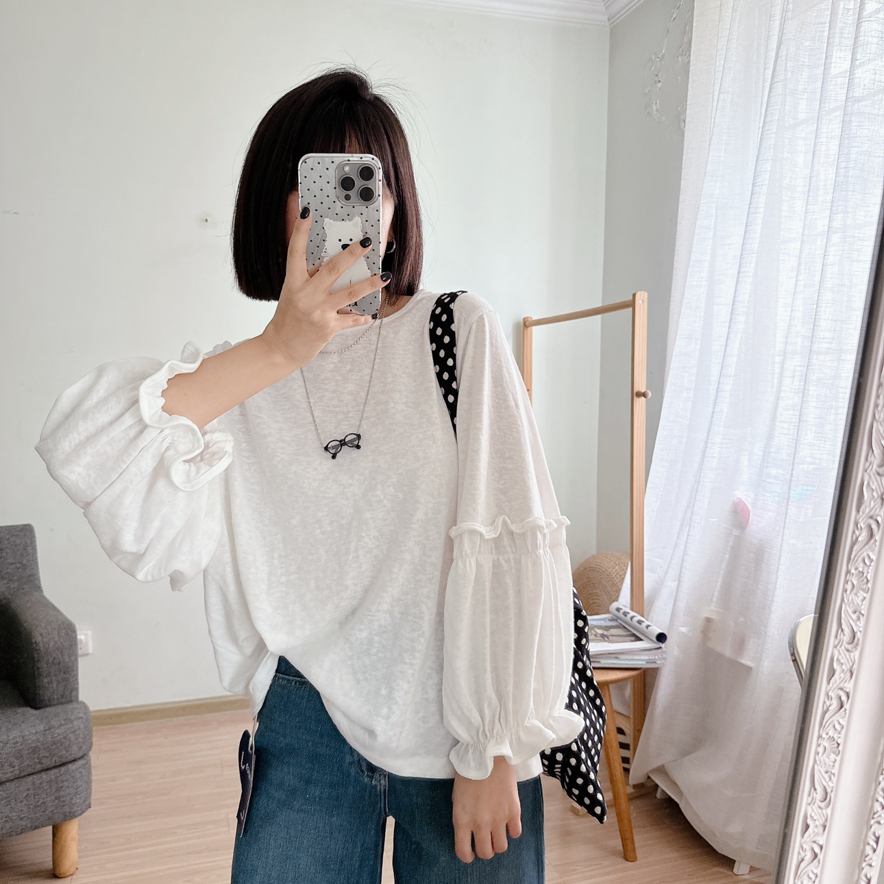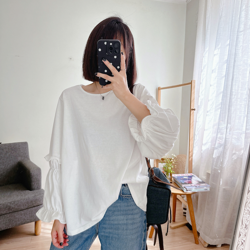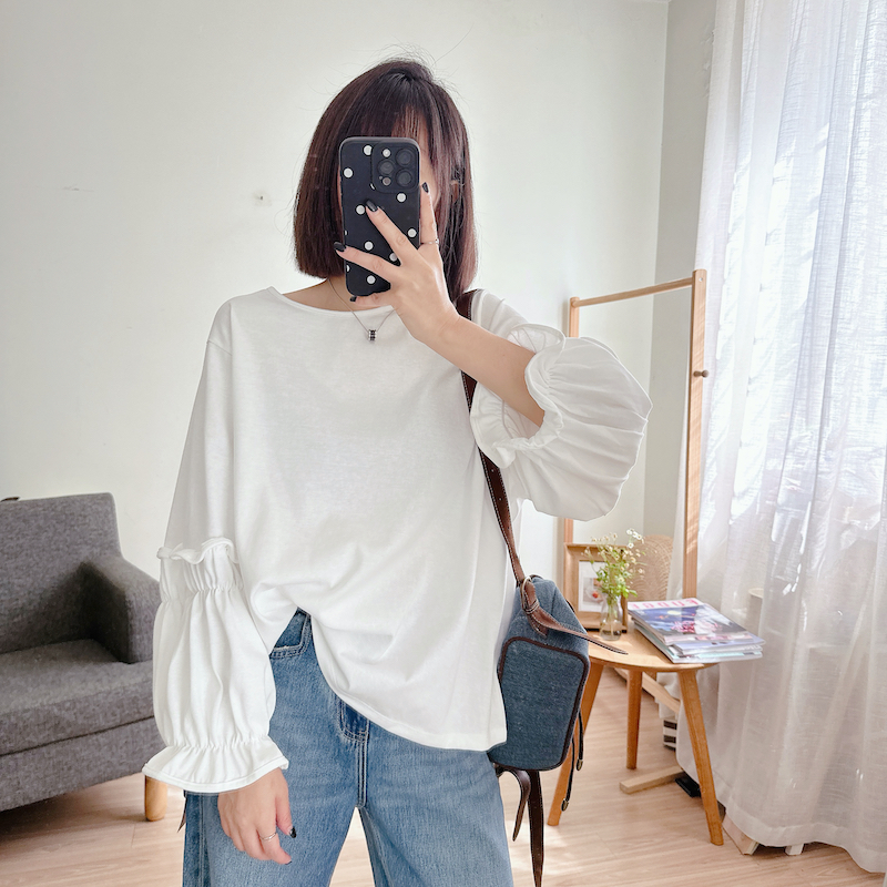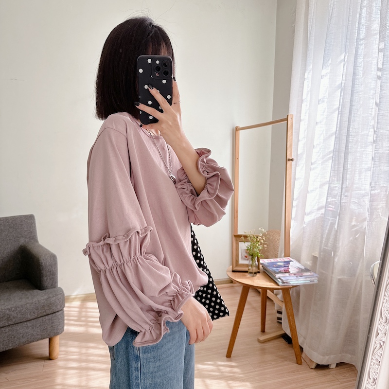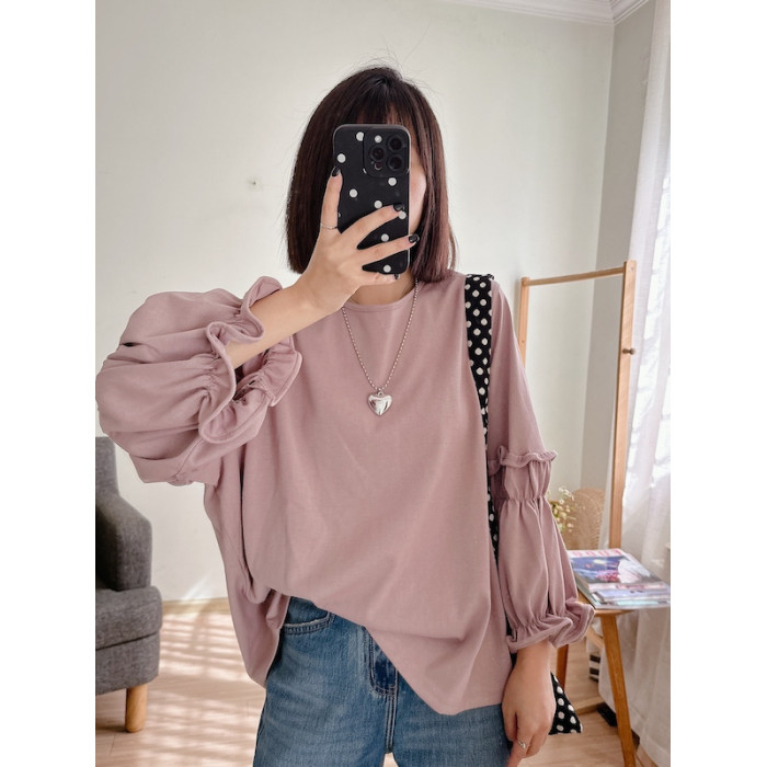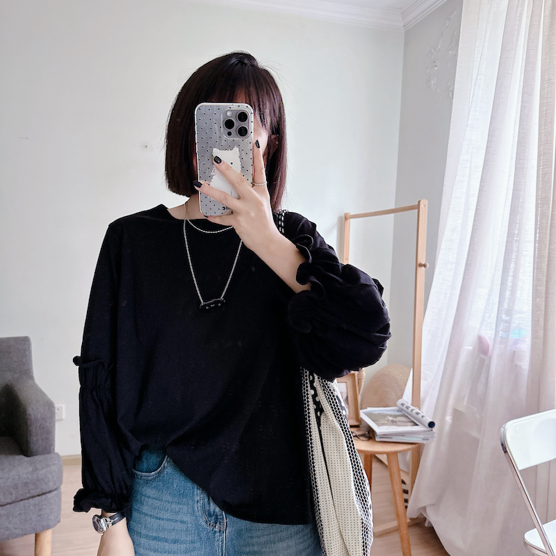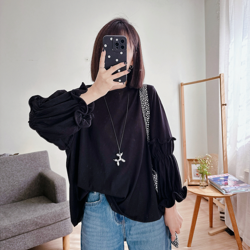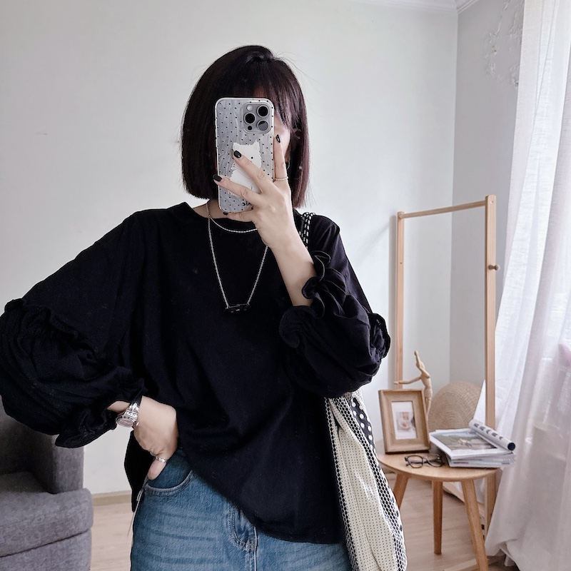 花的冰淇淋 百搭減齡純色寬松中長款圓領花苞袖長袖T恤女款秋款p