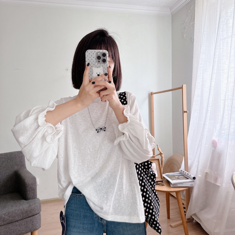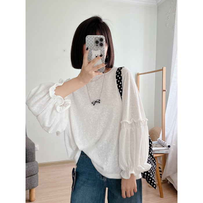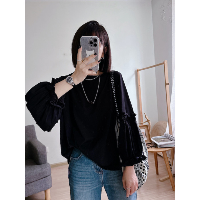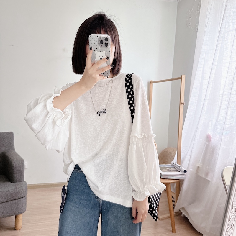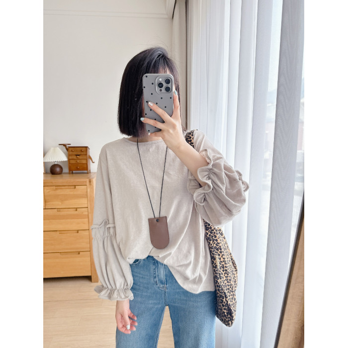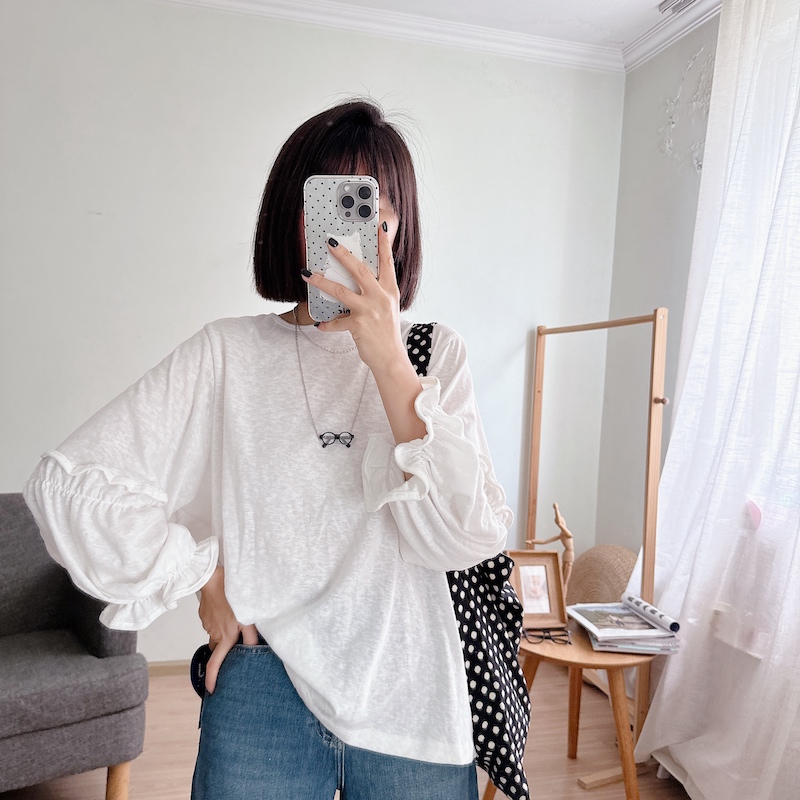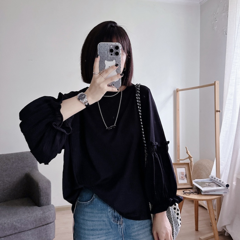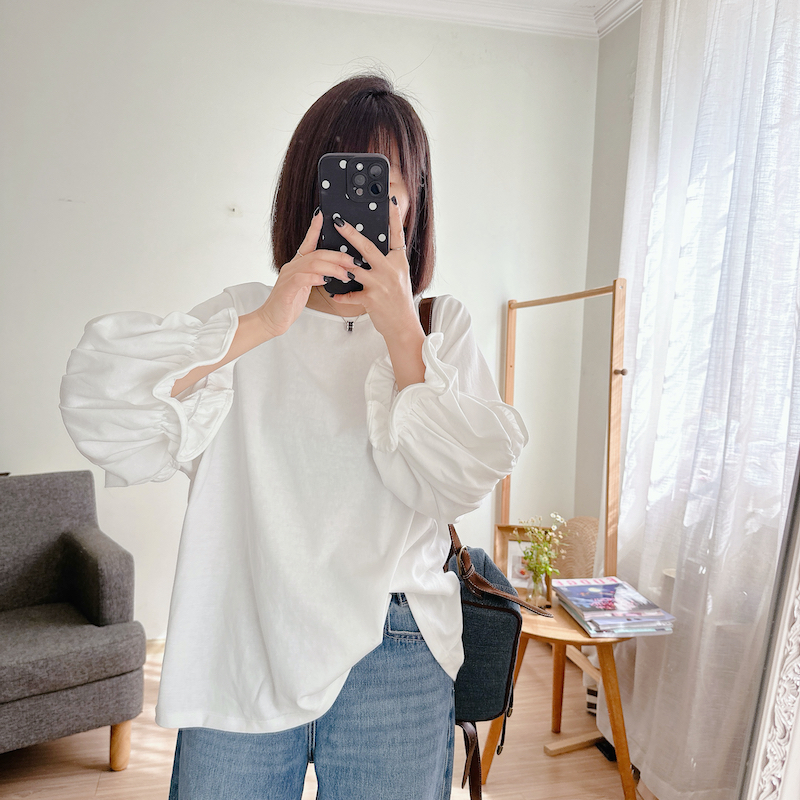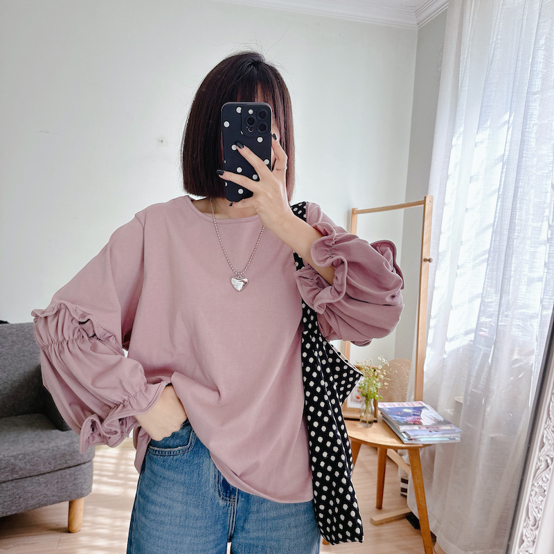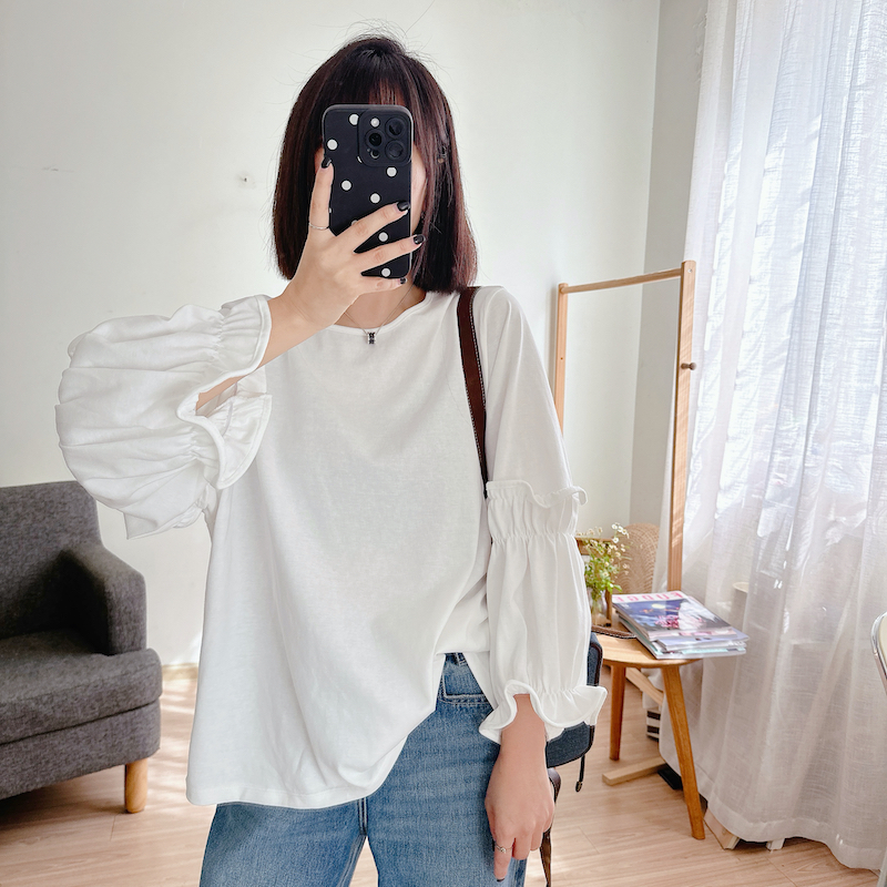 花的冰淇淋 百搭減齡純色寬松中長款圓領花苞袖長袖T恤女款秋款p