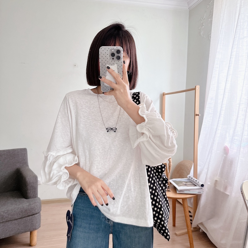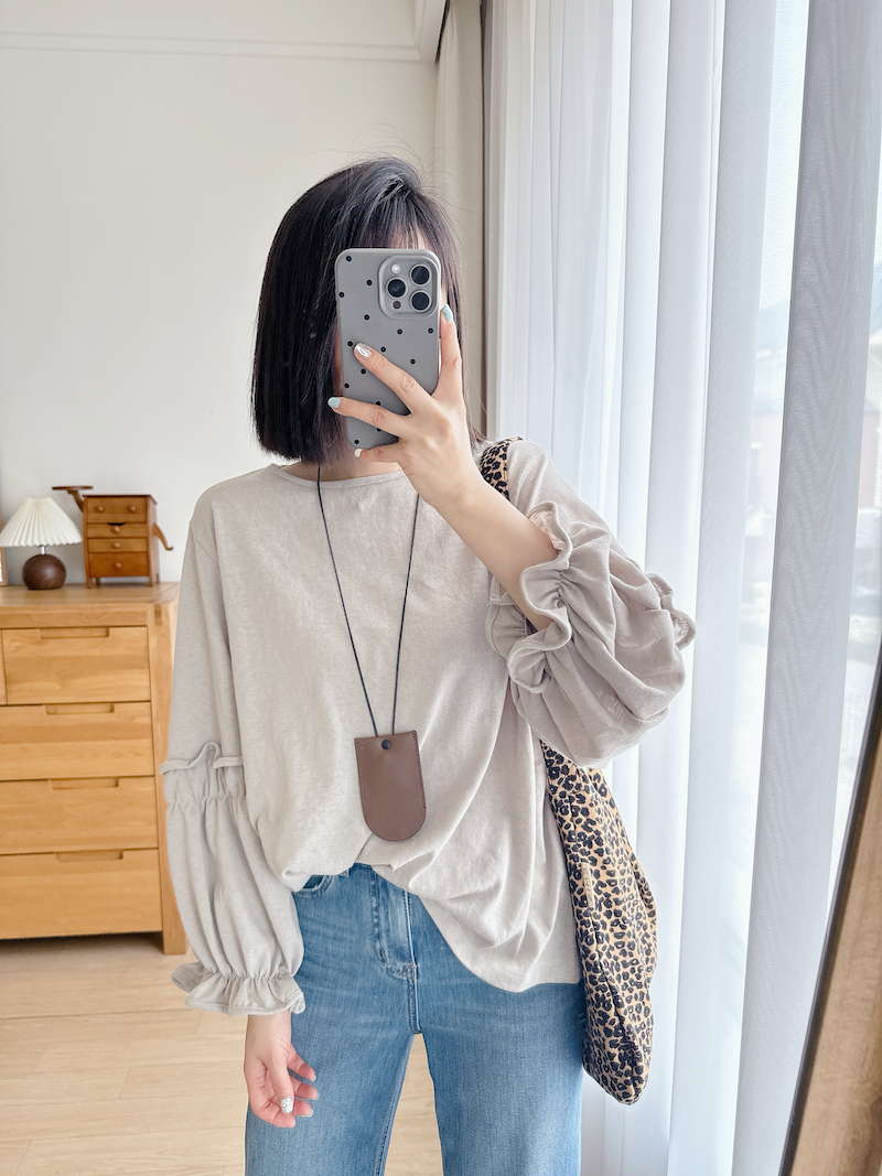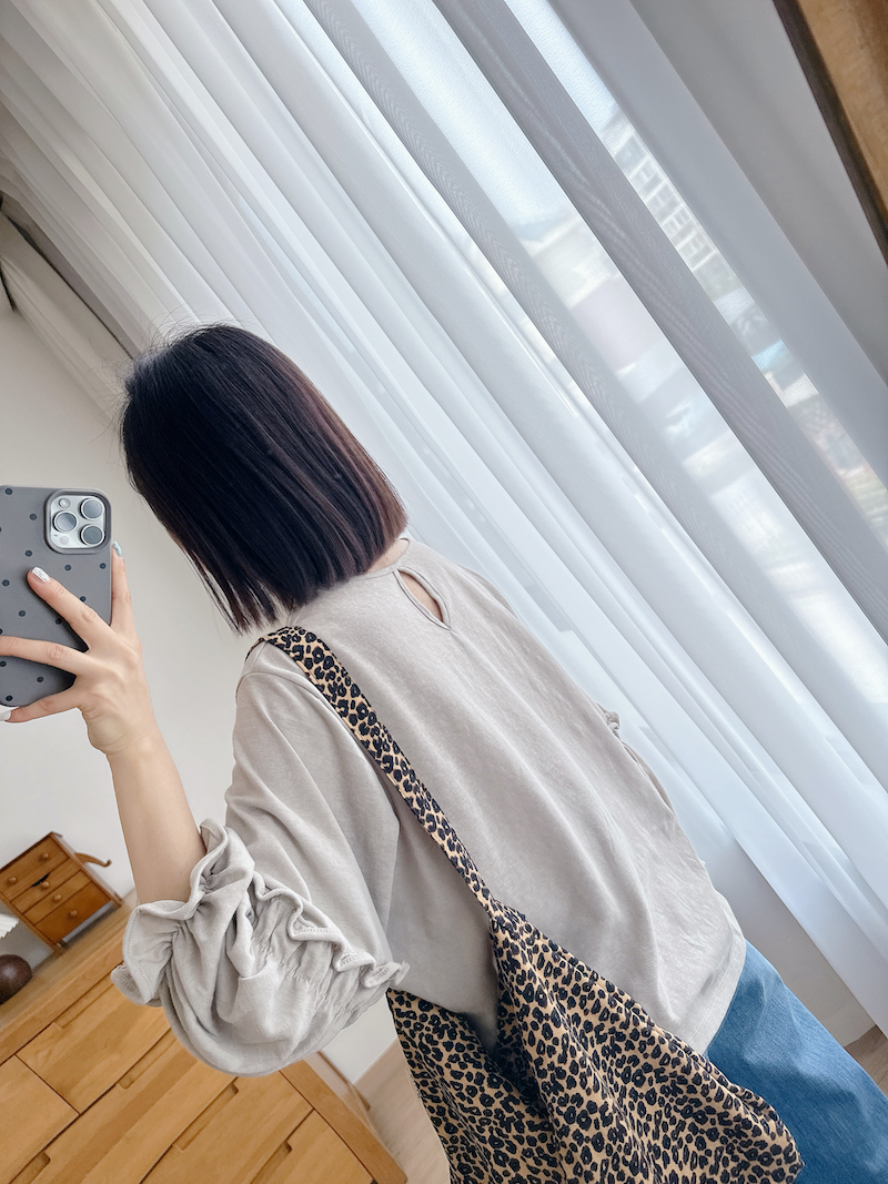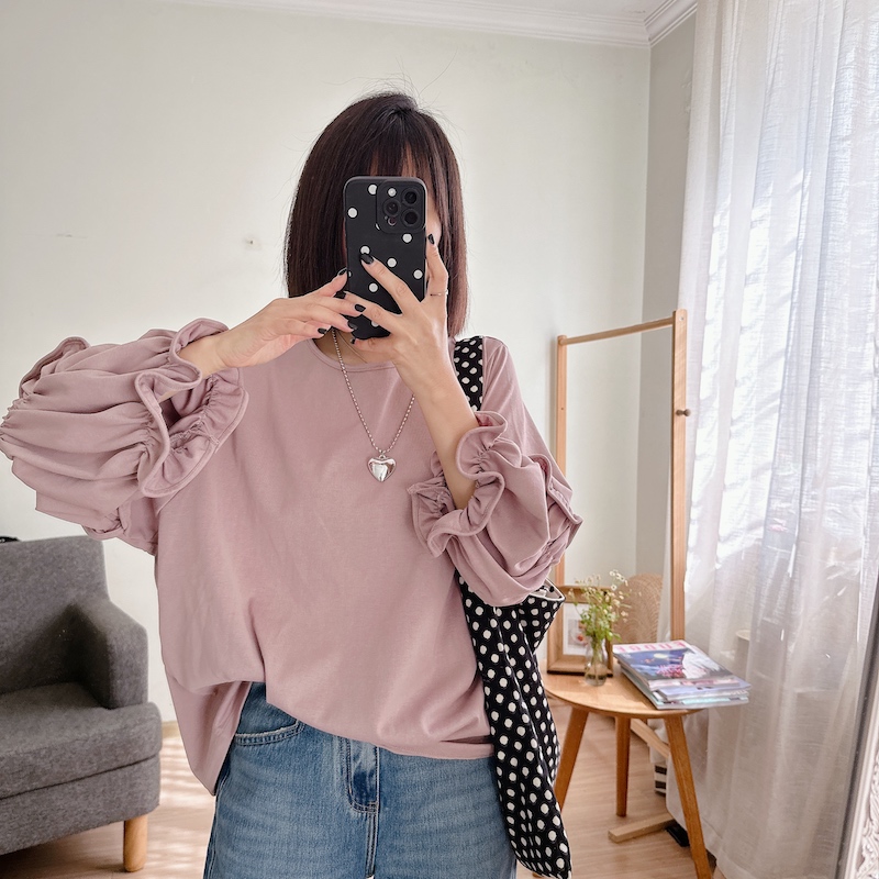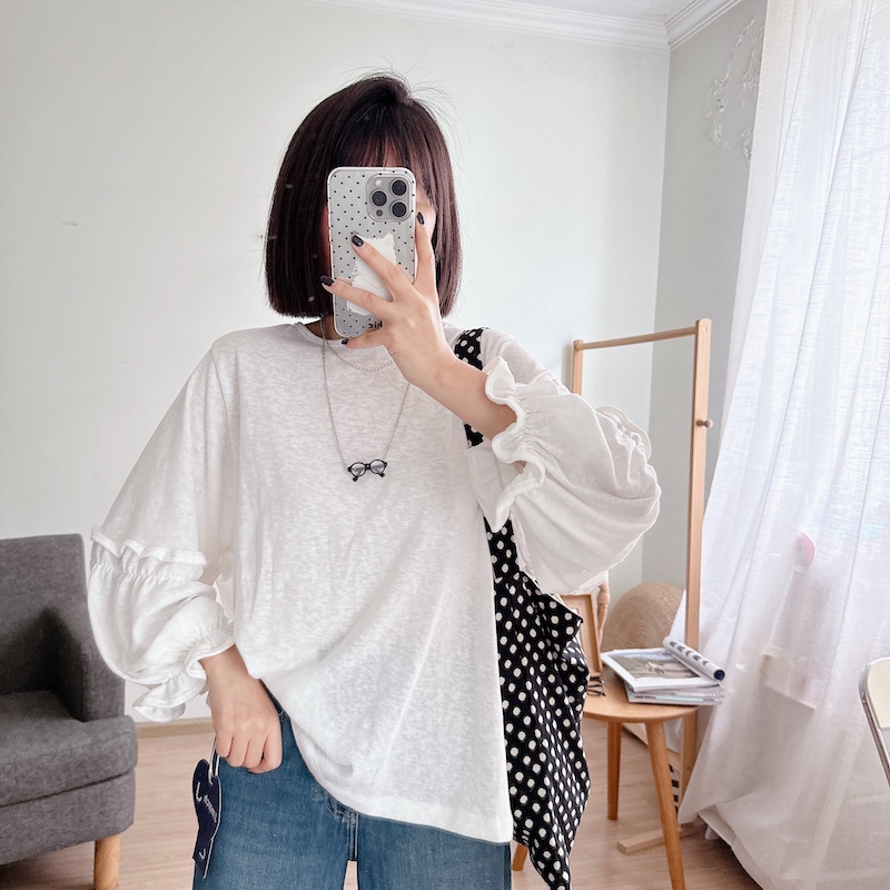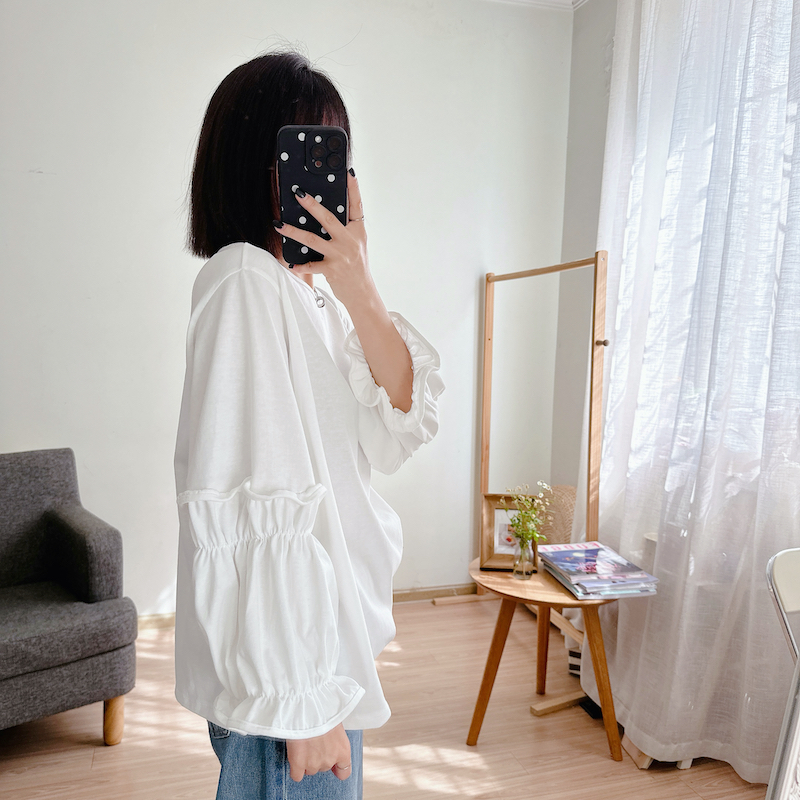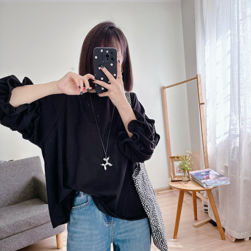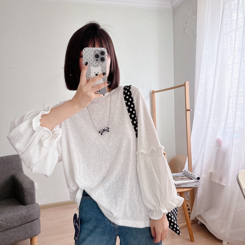 花的冰淇淋 百搭減齡純色寬松中長款圓領花苞袖長袖T恤女款秋款p
