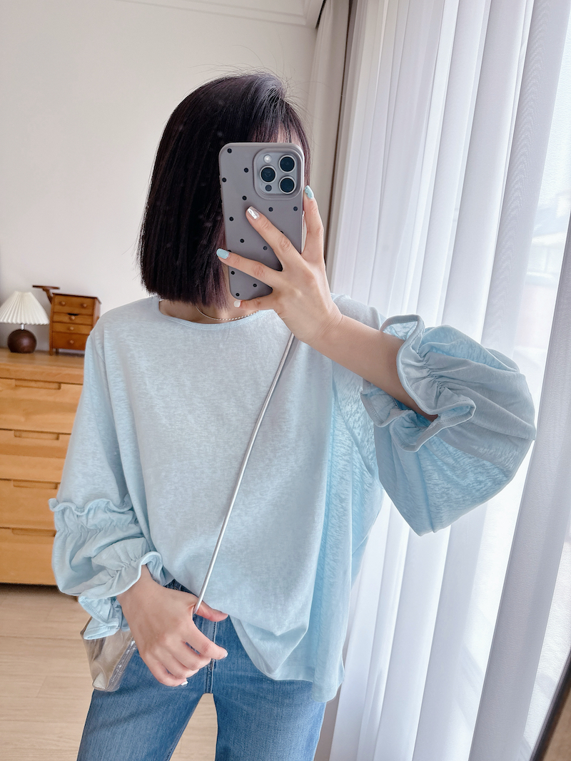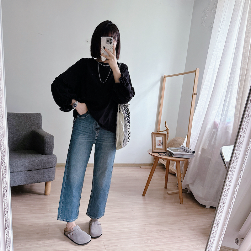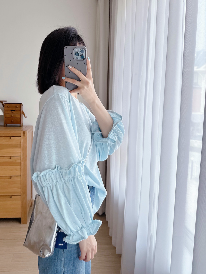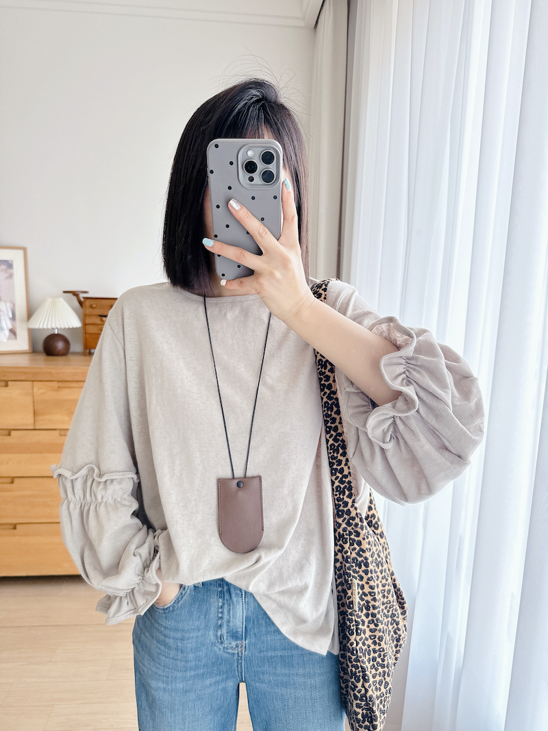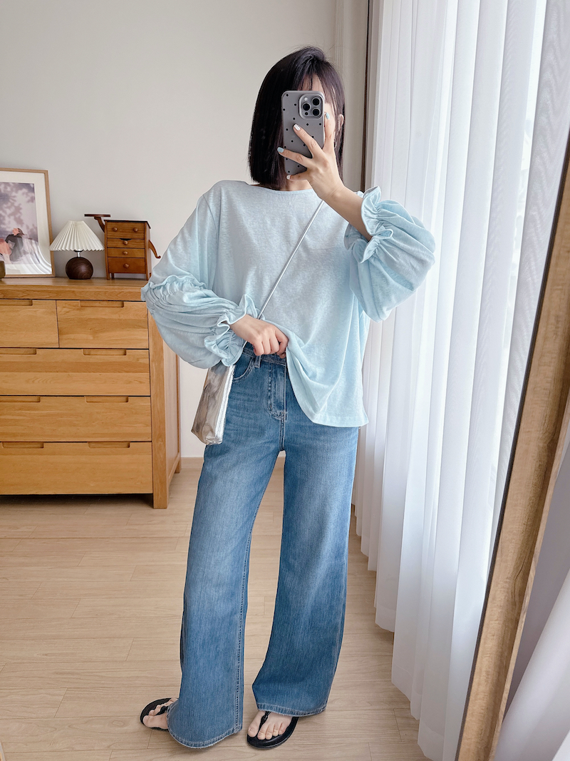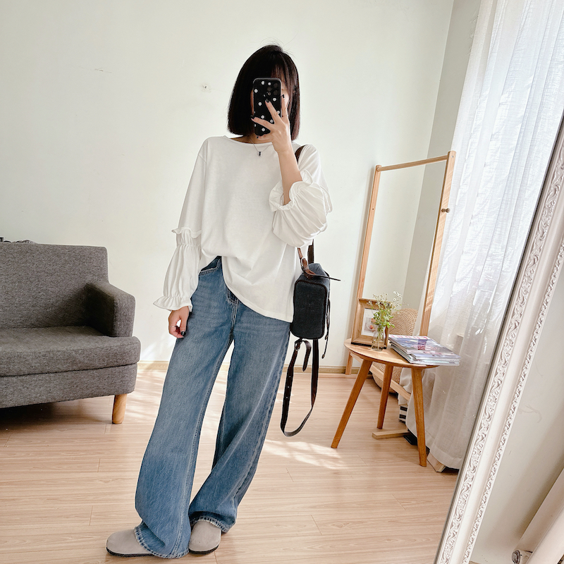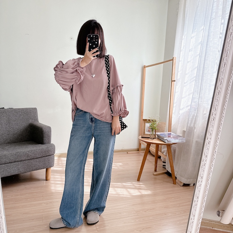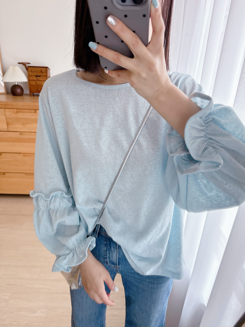 花的冰淇淋 百搭減齡純色寬松中長款圓領花苞袖長袖T恤女款秋款p