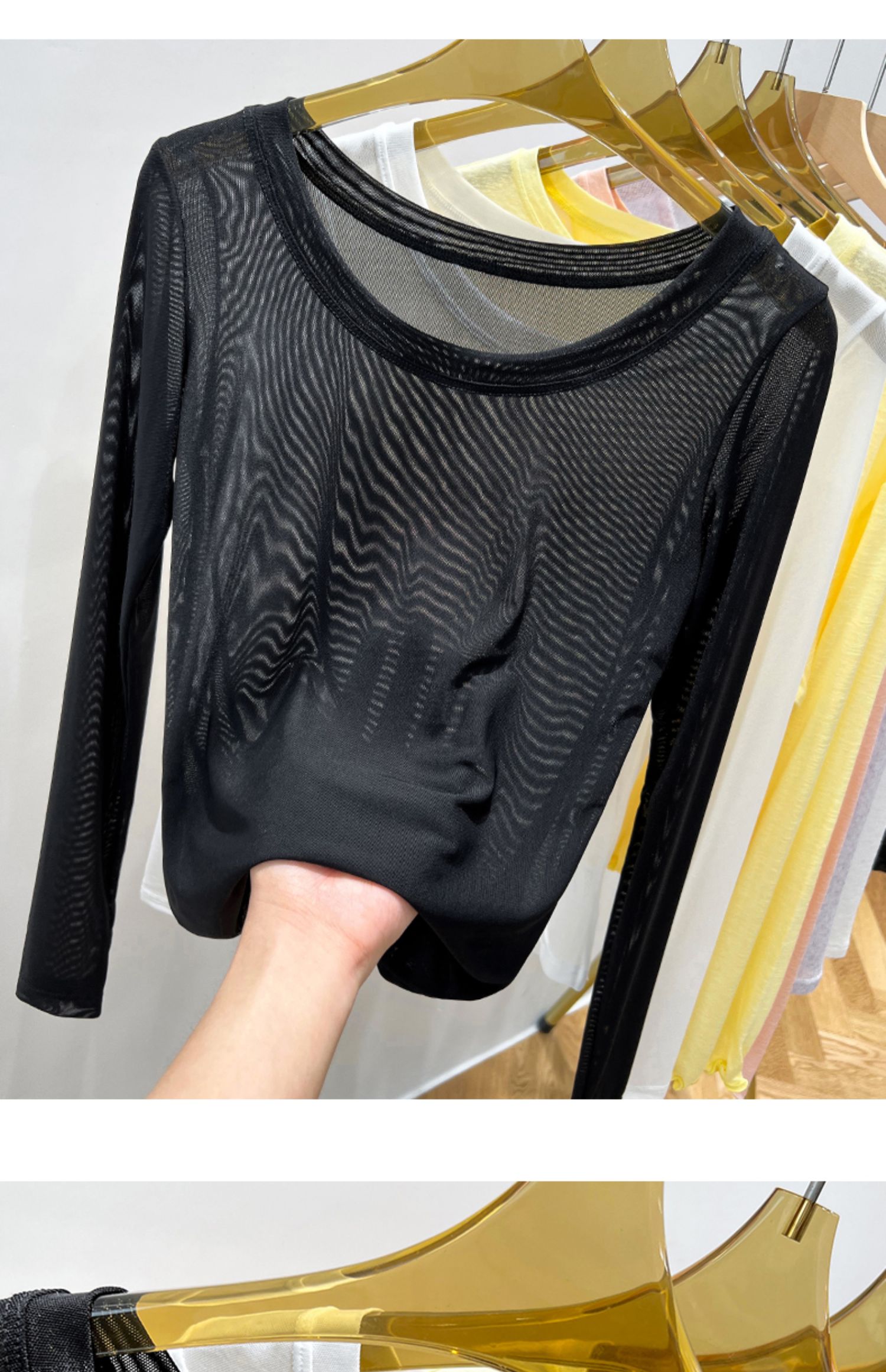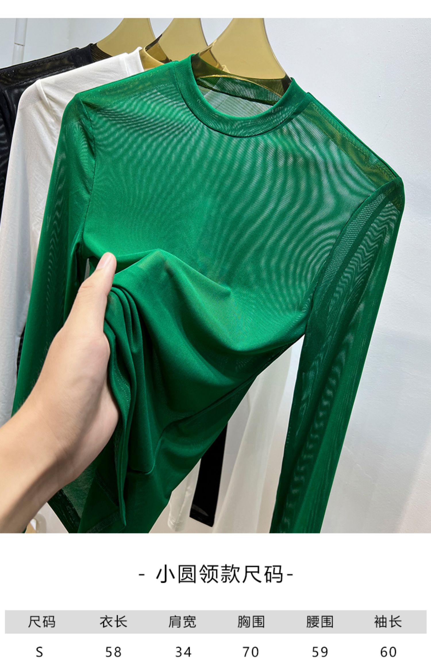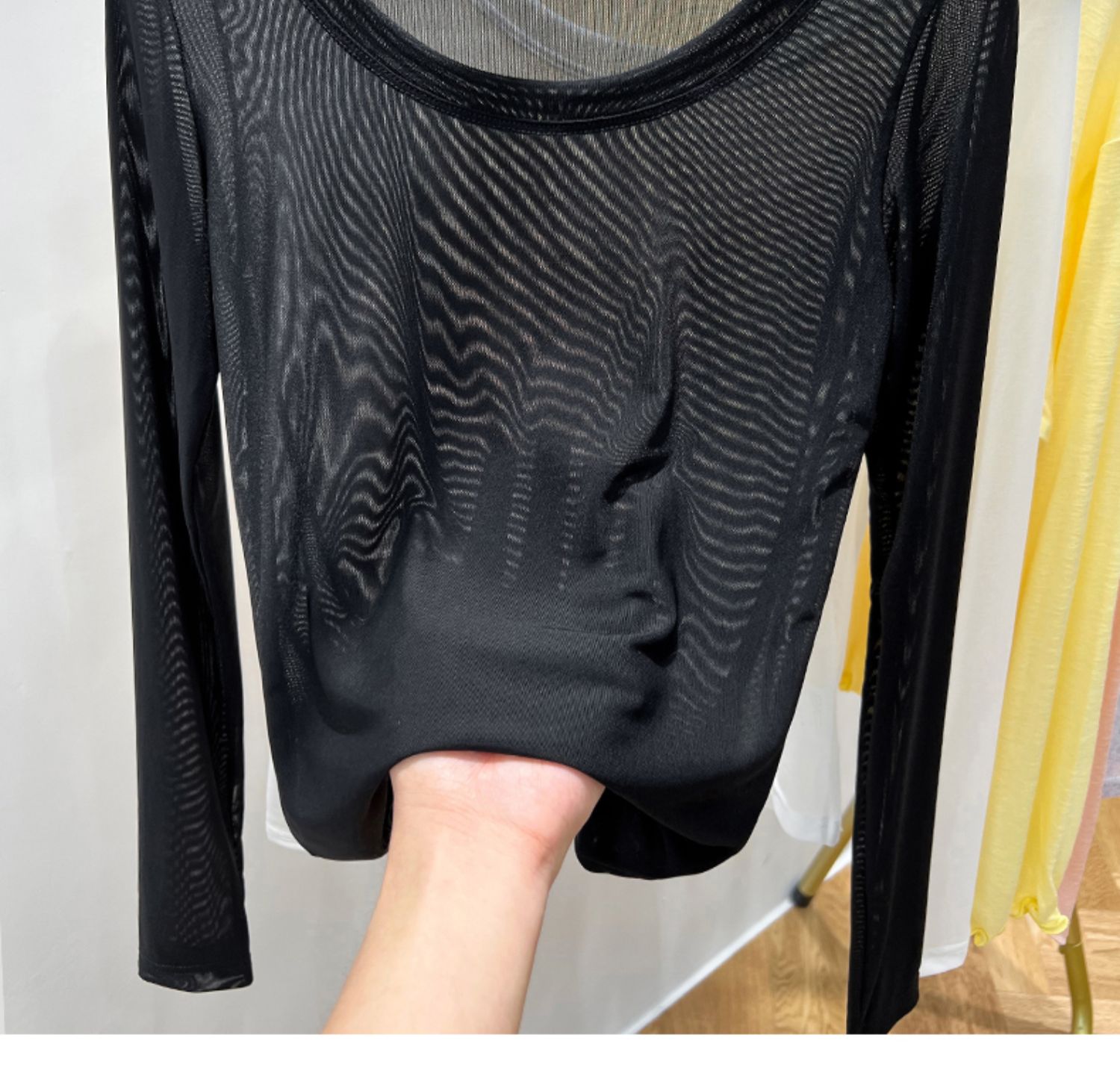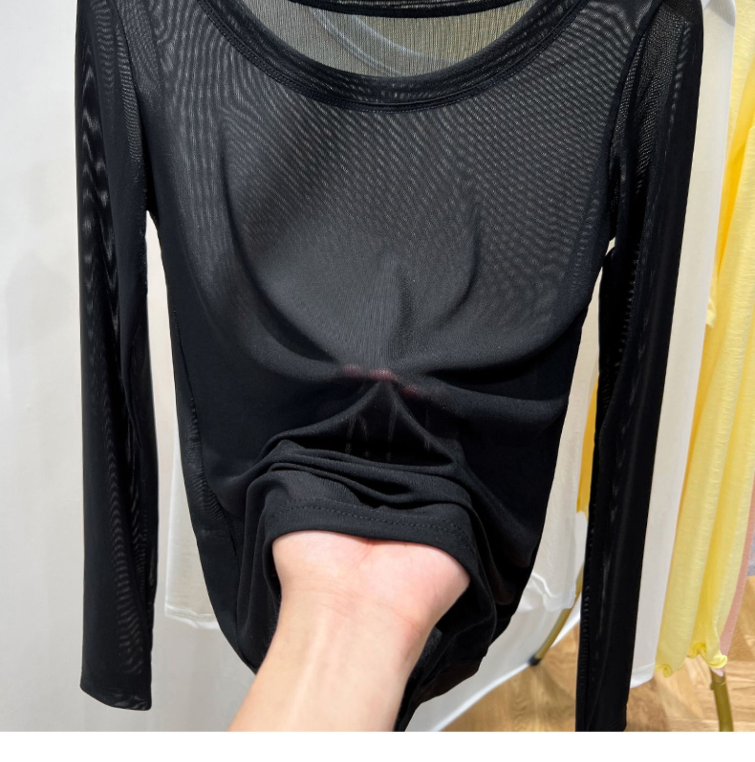 黑色網紗打底衫女春秋長袖t恤低領透明紗衣薄內搭蕾絲上衣高級感
