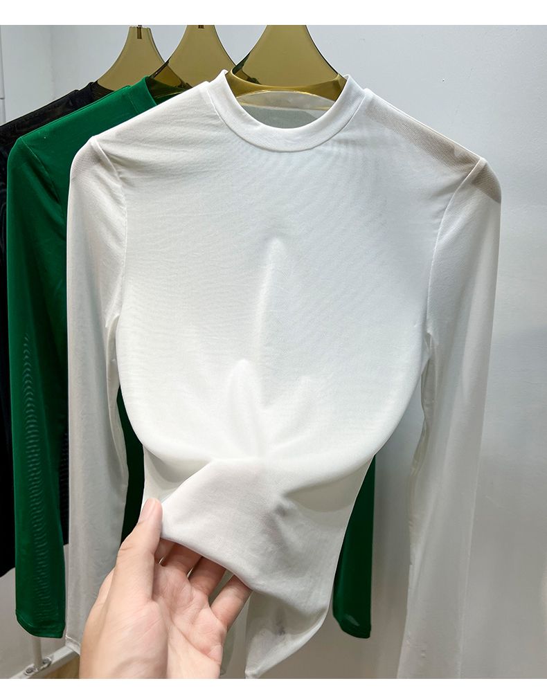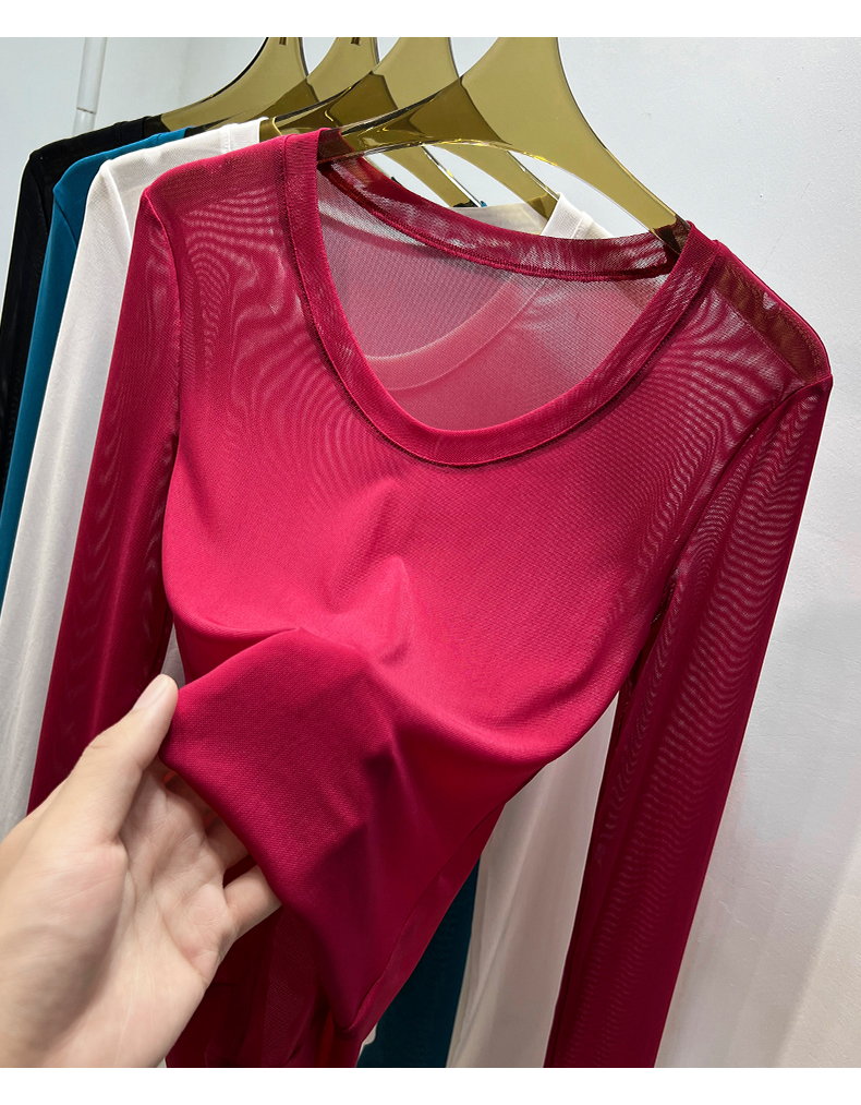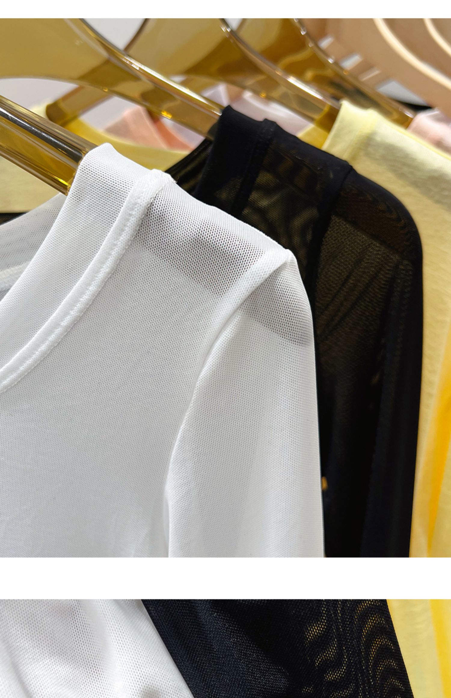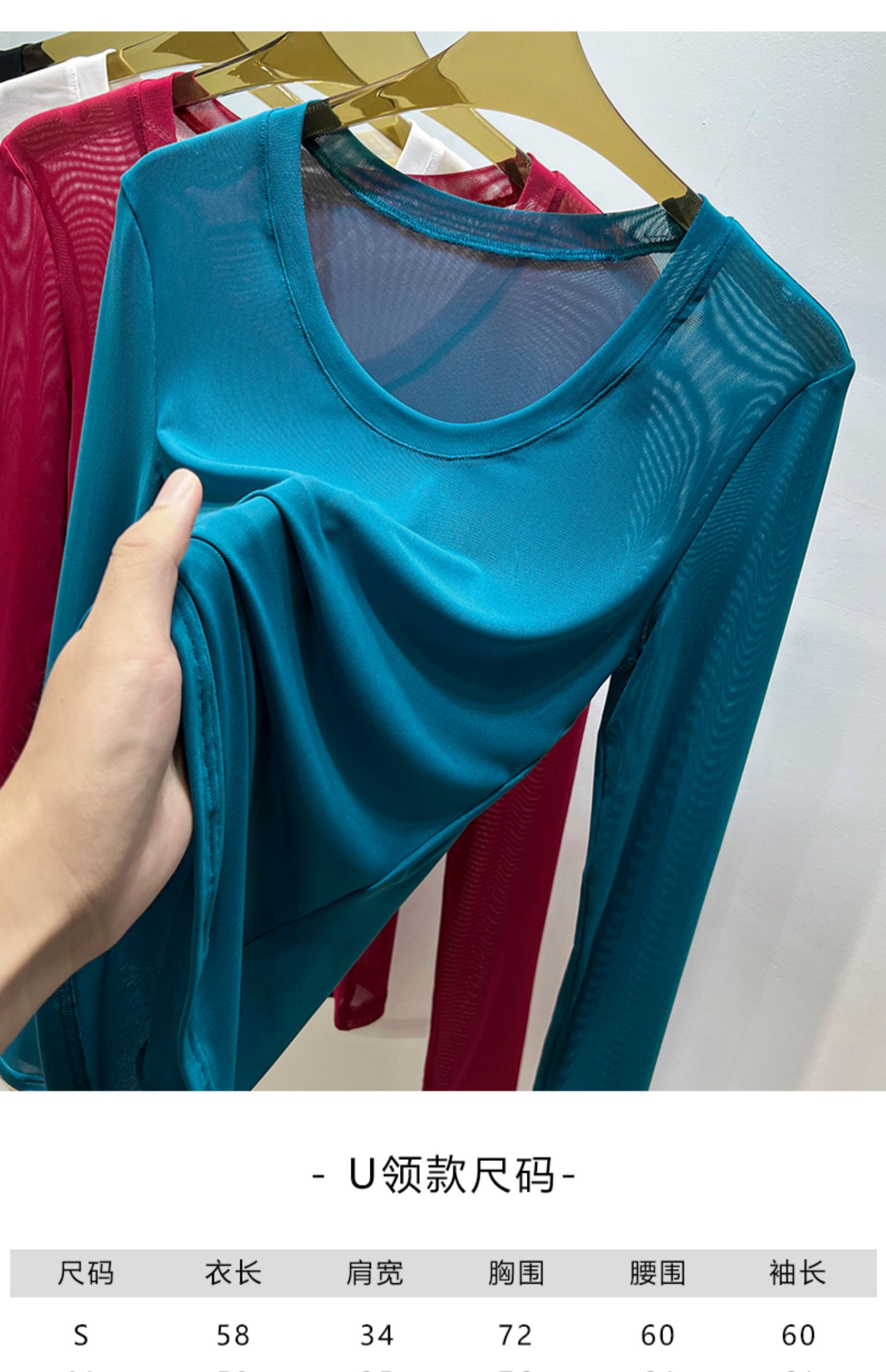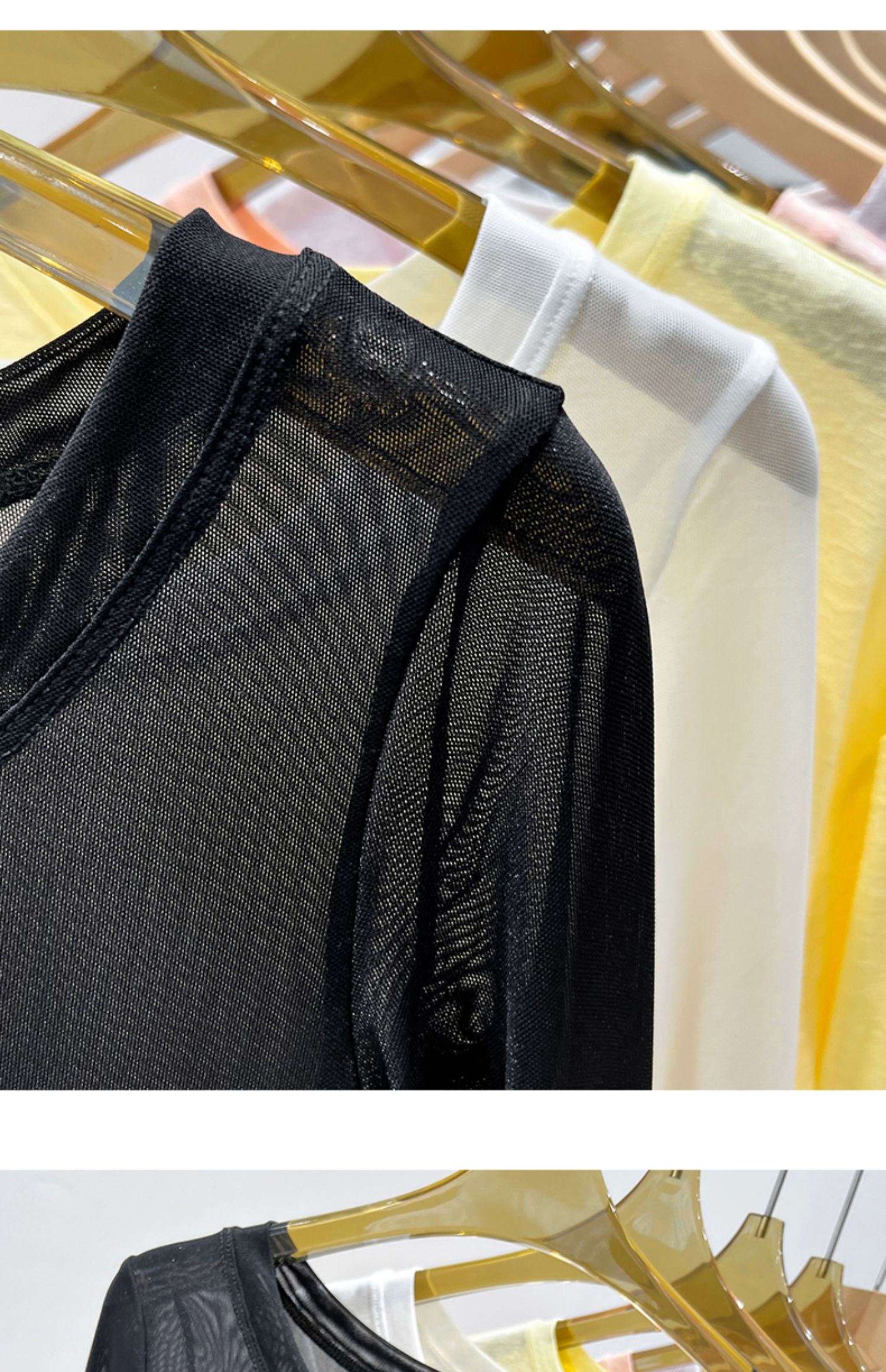 黑色網紗打底衫女春秋長袖t恤低領透明紗衣薄內搭蕾絲上衣高級感