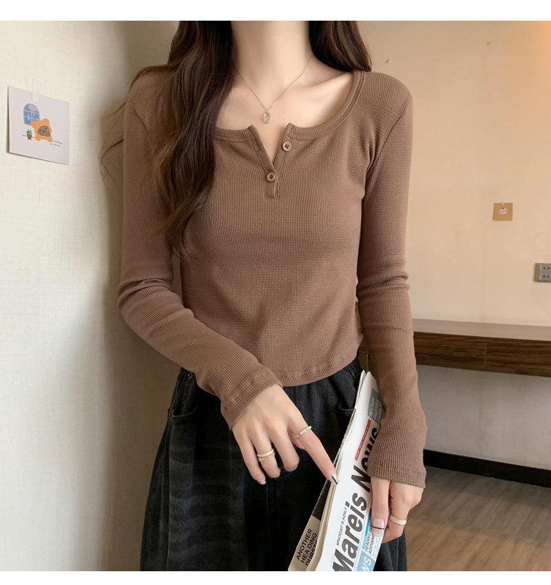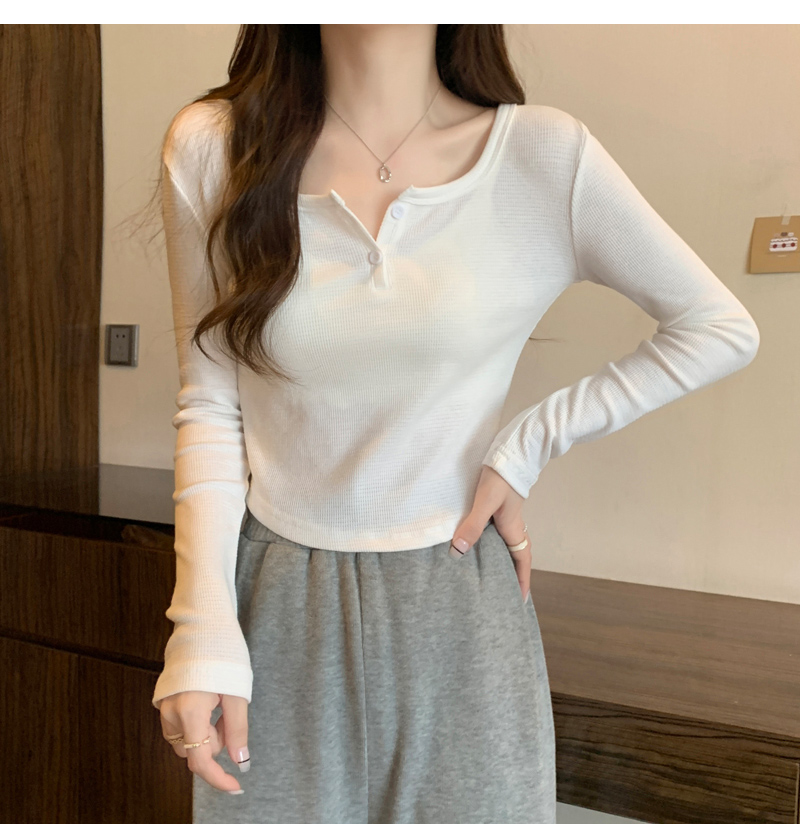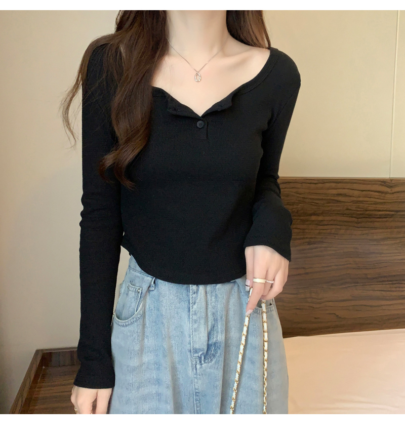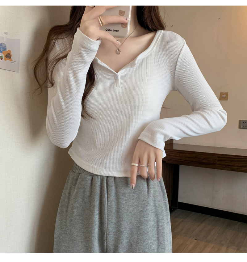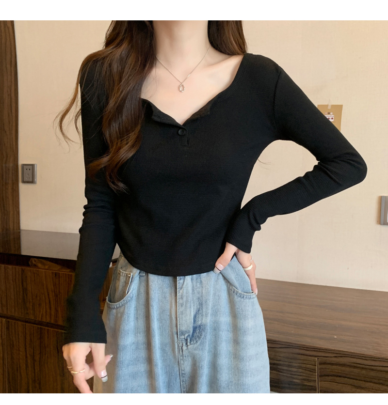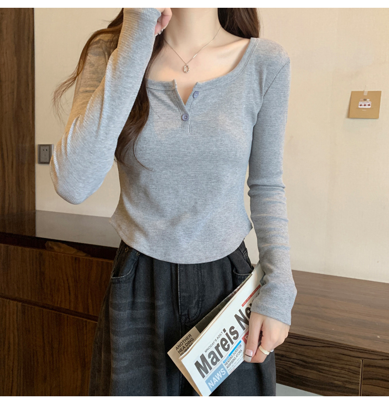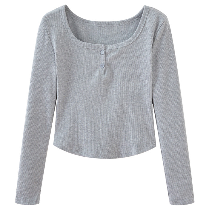 設計感弧形下擺v領長袖t恤女秋冬新款韓版灰色方領修身短款打底衫
