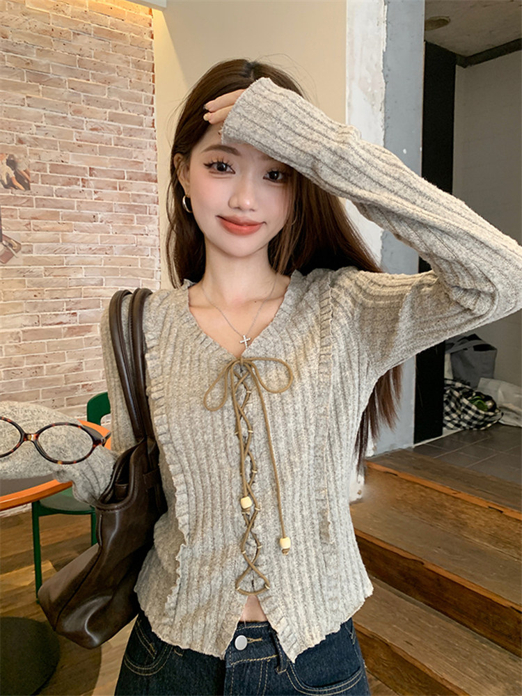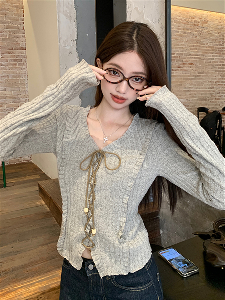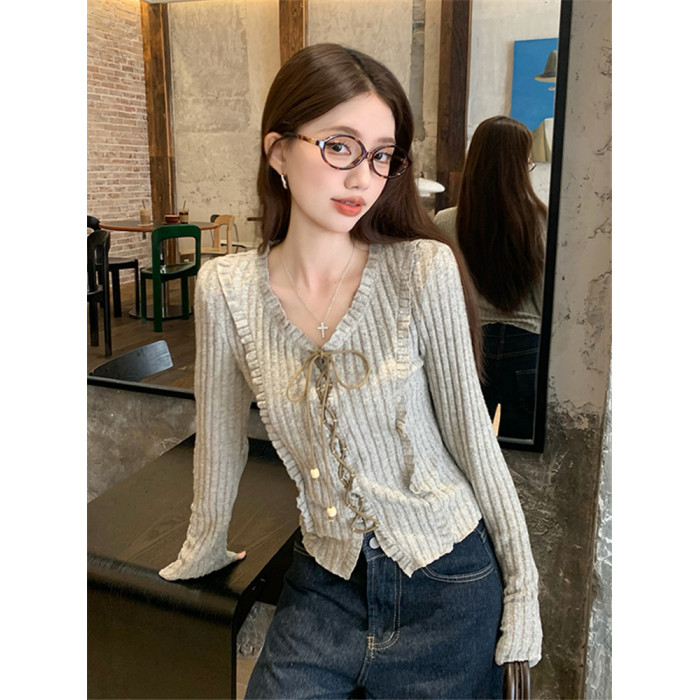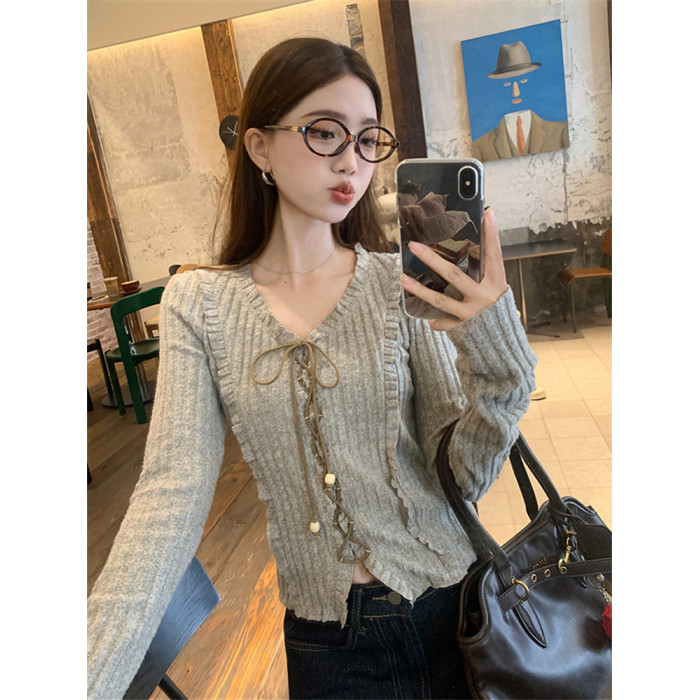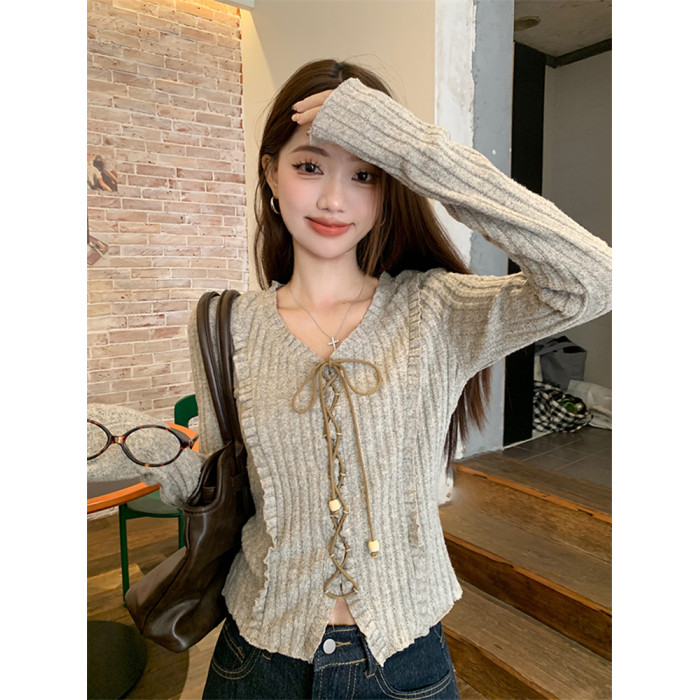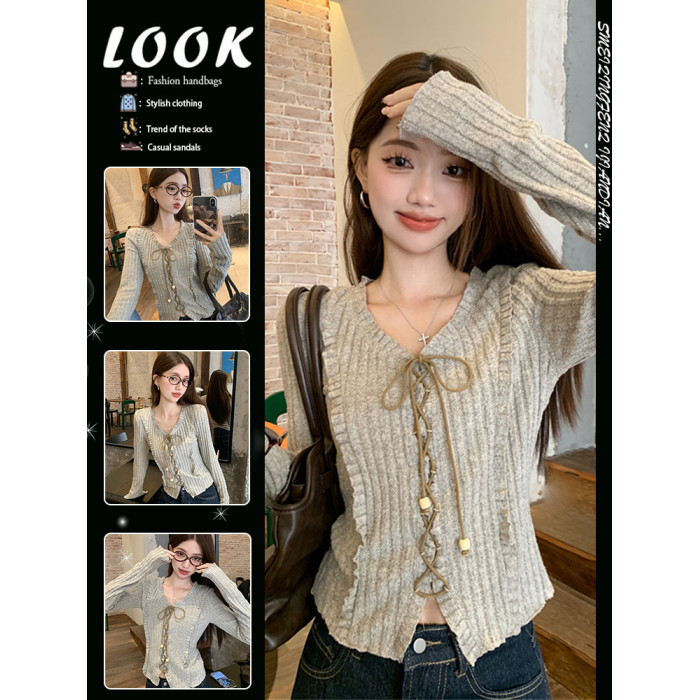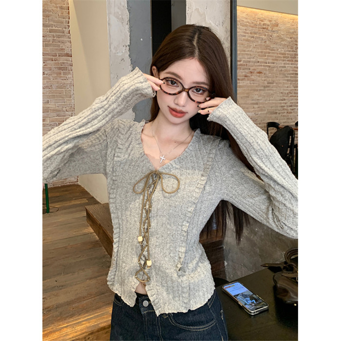 甜辣修身長袖針織開衫女早秋新款綁帶設計感顯瘦短款V領長袖上衣