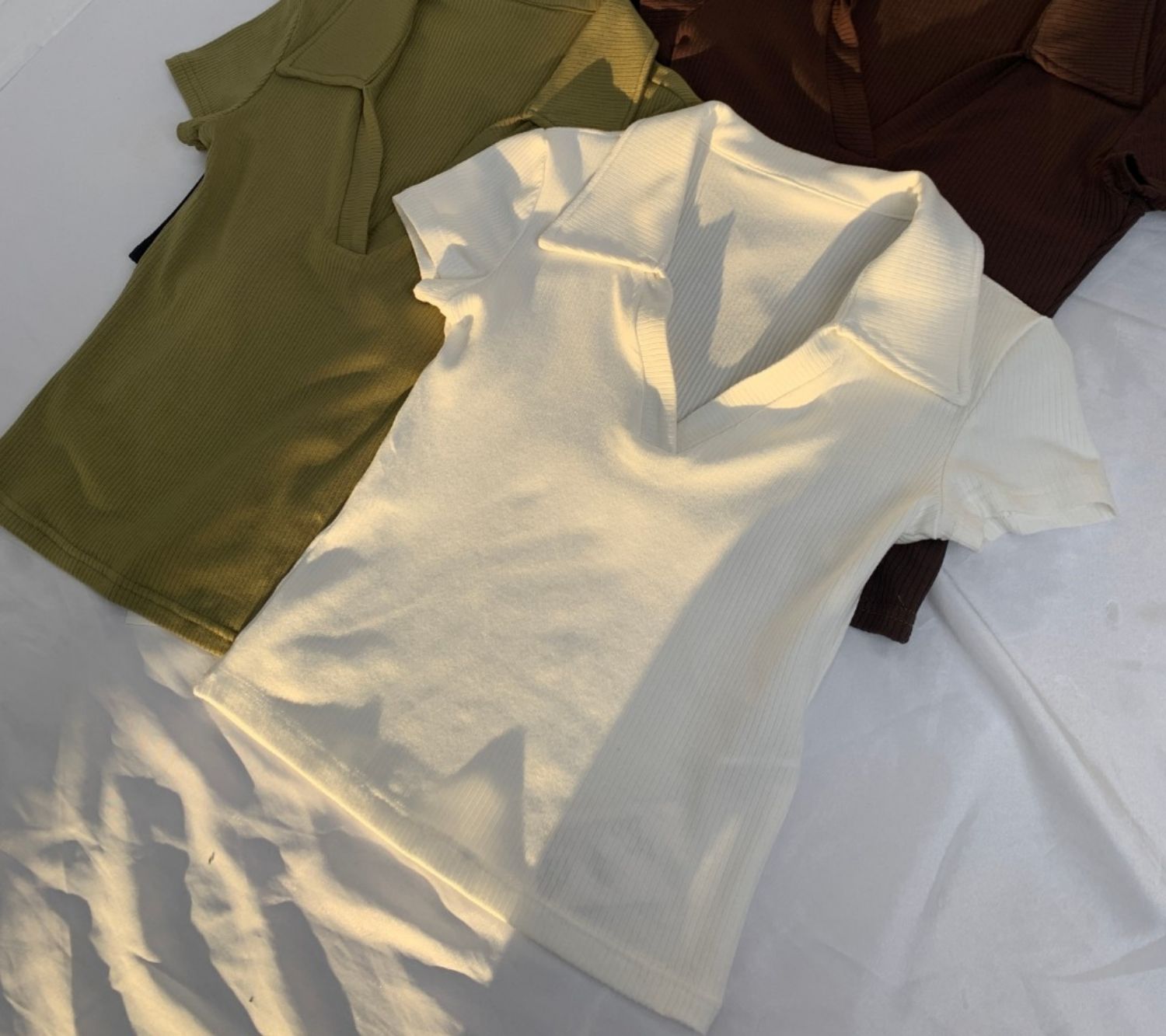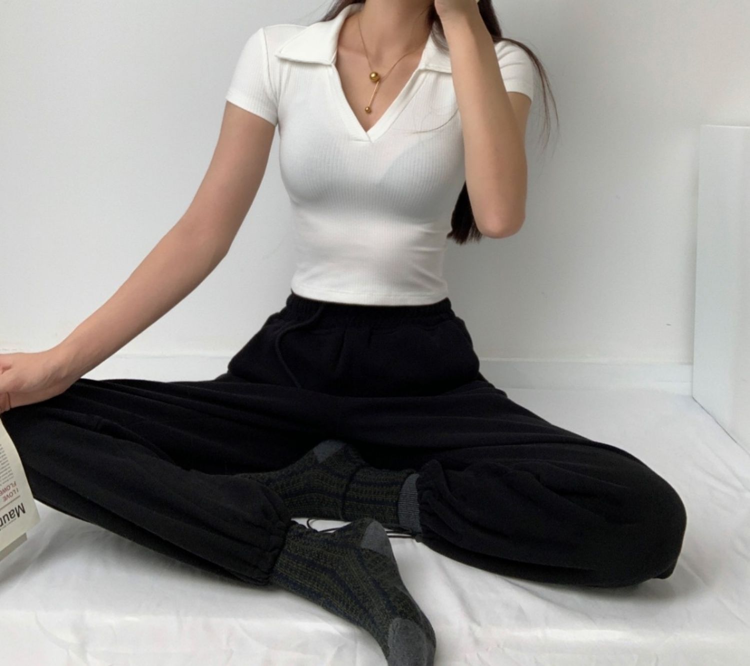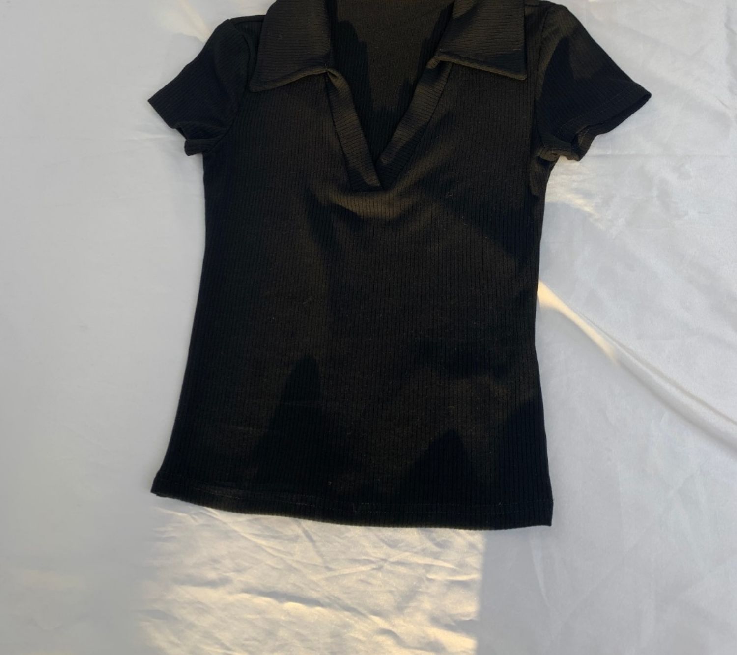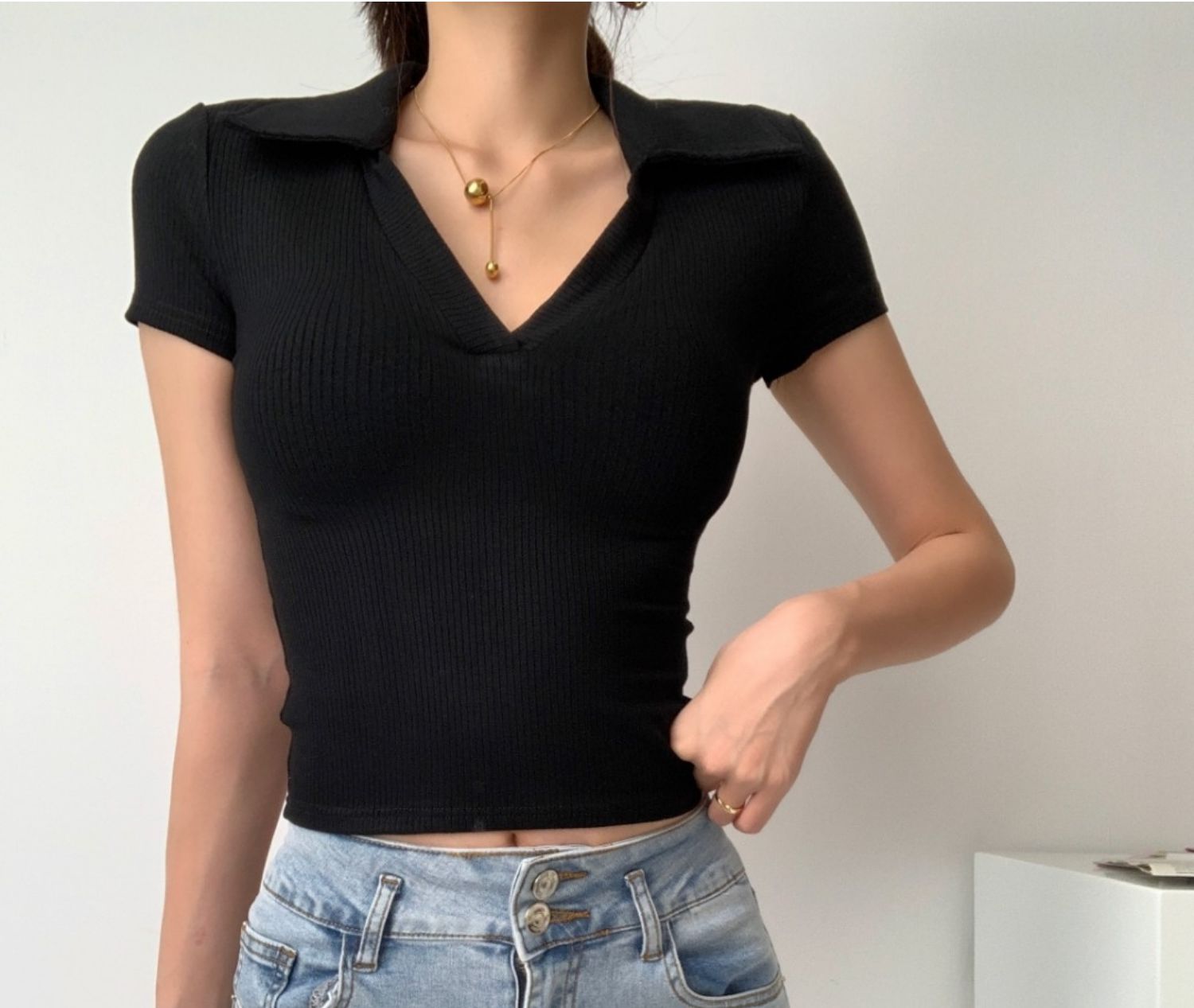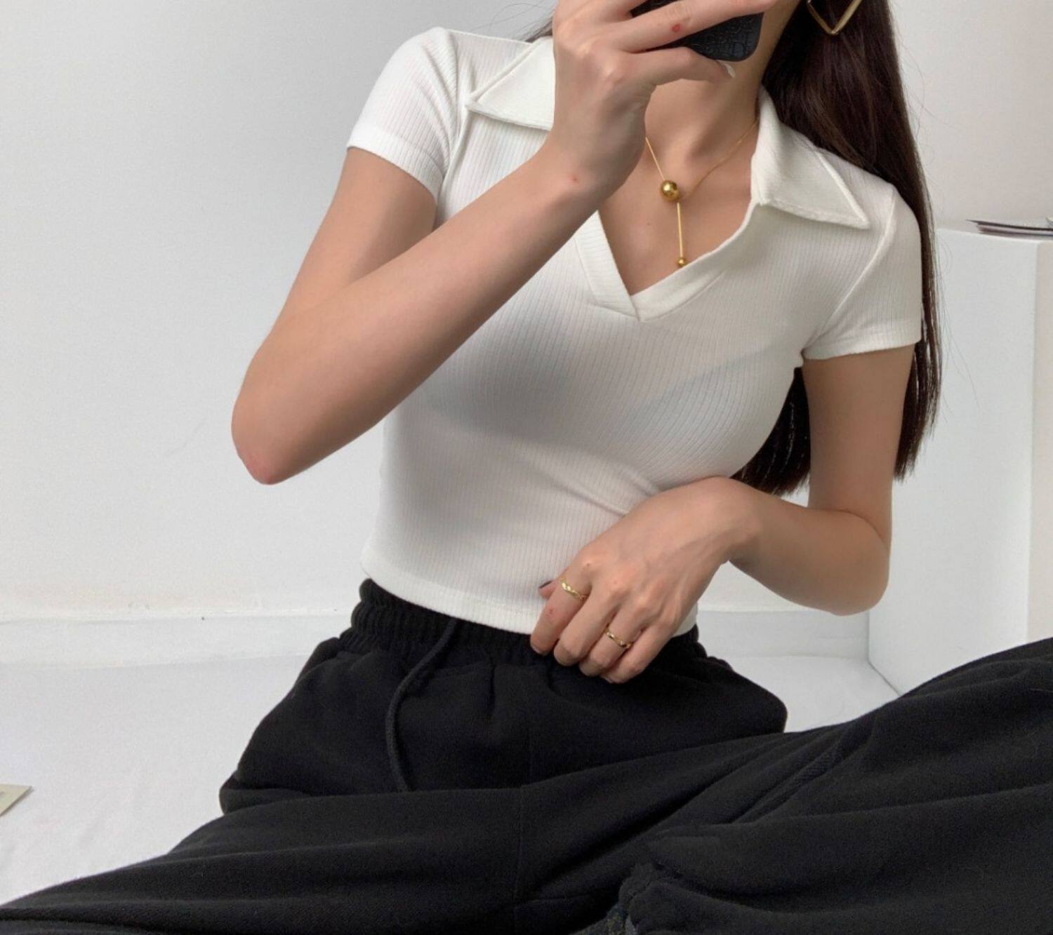 POLO領打底衫女夏季內搭緊身短袖t恤搭配高腰濶腿褲短款正肩上衣