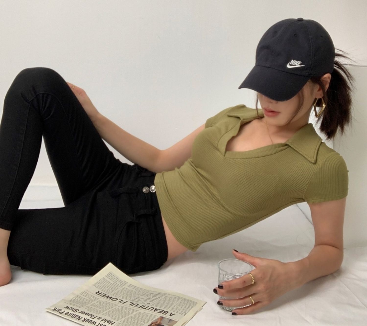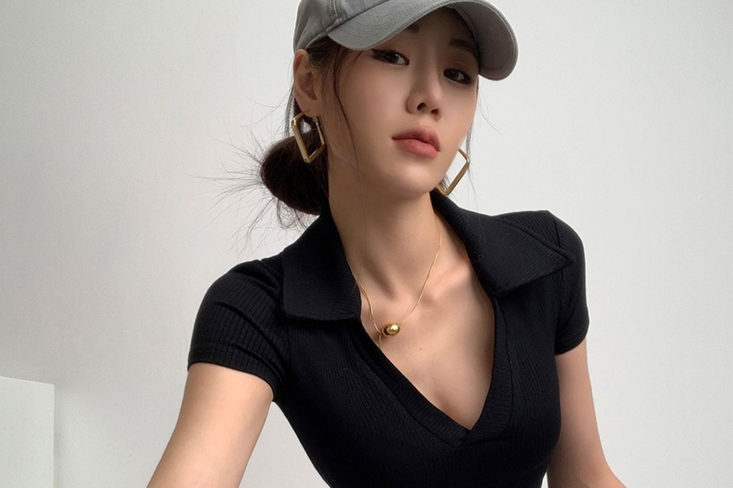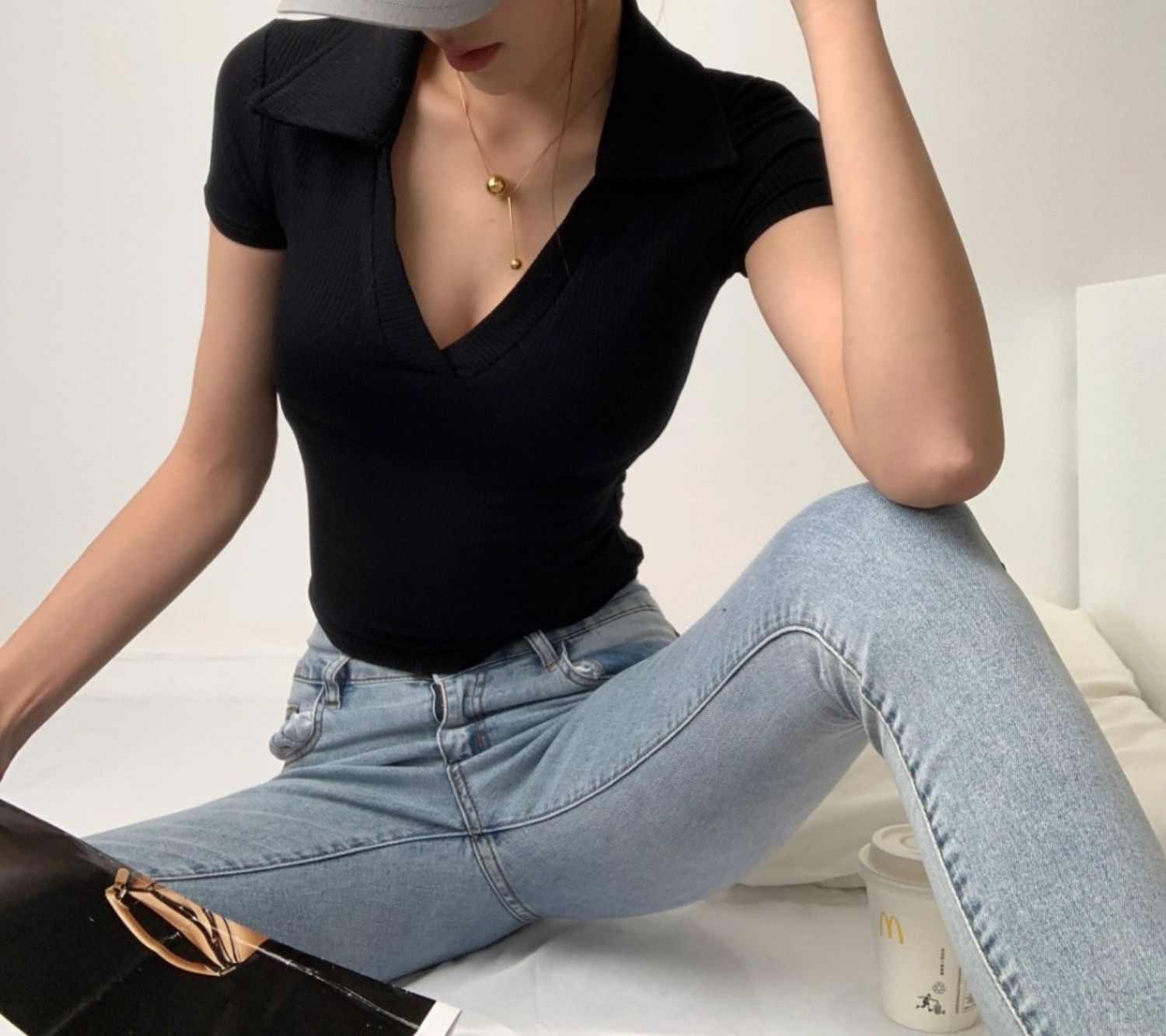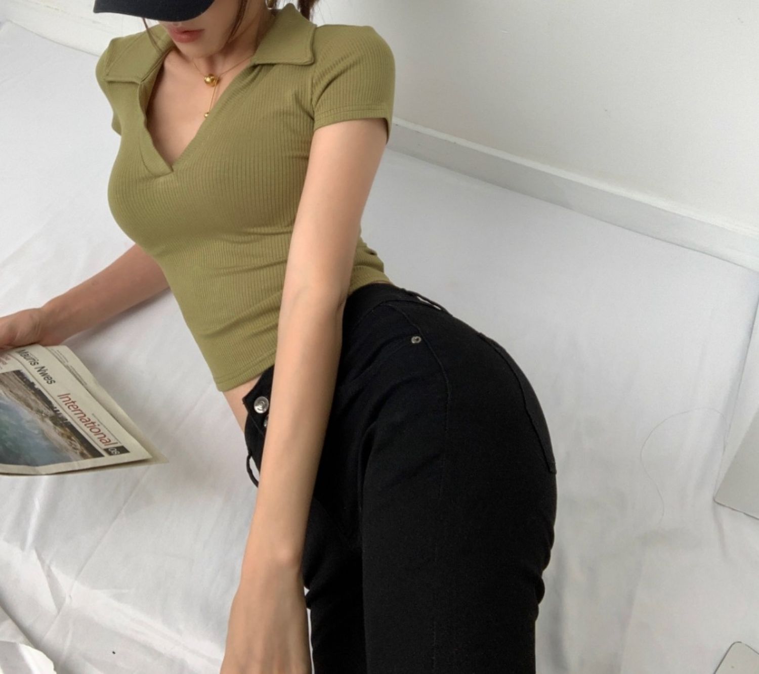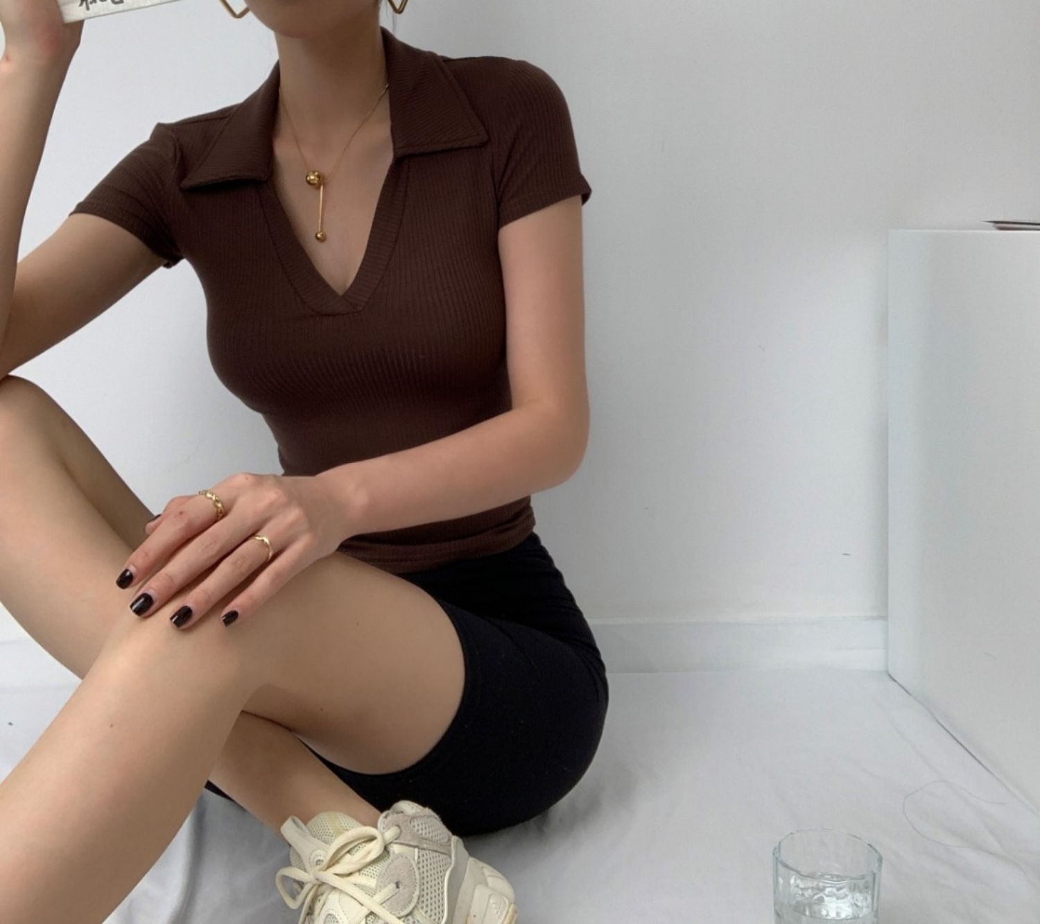 POLO領打底衫女夏季內搭緊身短袖t恤搭配高腰濶腿褲短款正肩上衣