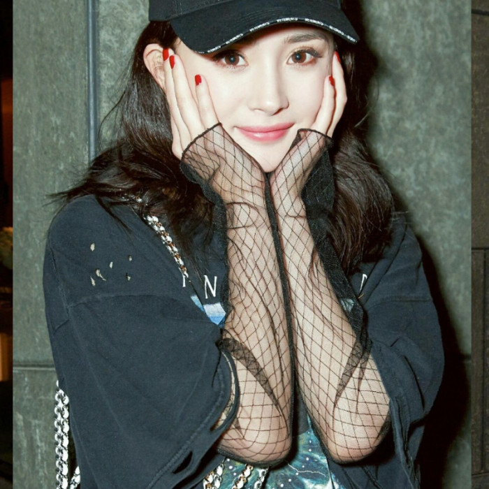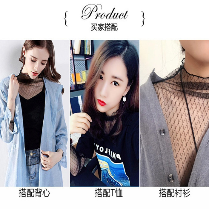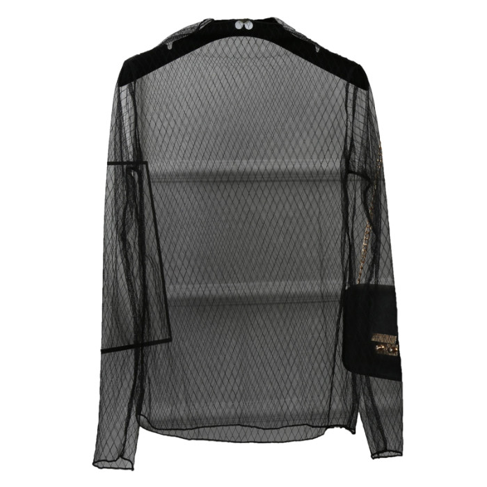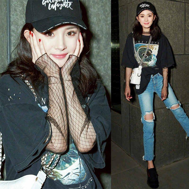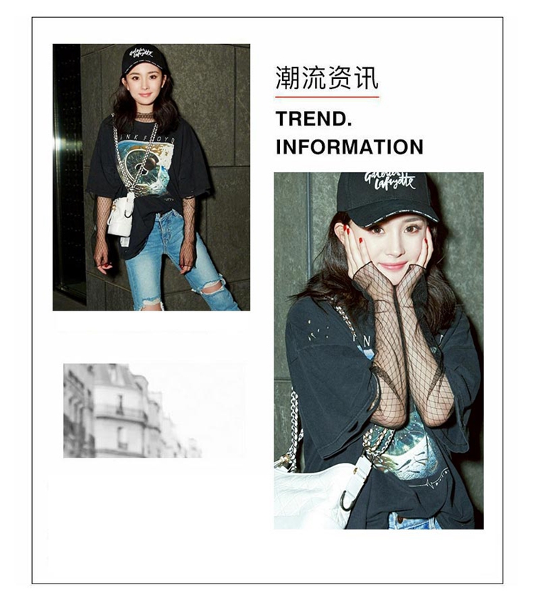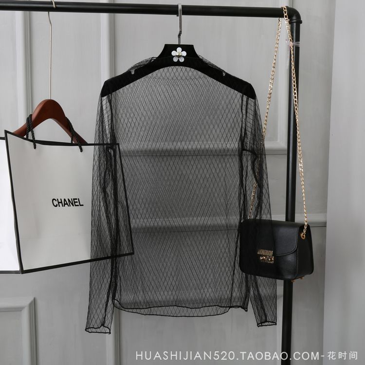 楊冪同款網紗打底衫女長袖鏤空透視漁網內搭黑色蕾絲透明上衣大碼