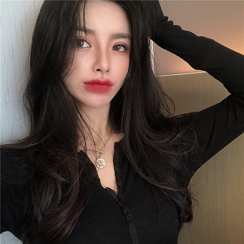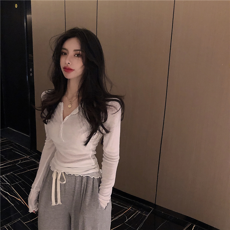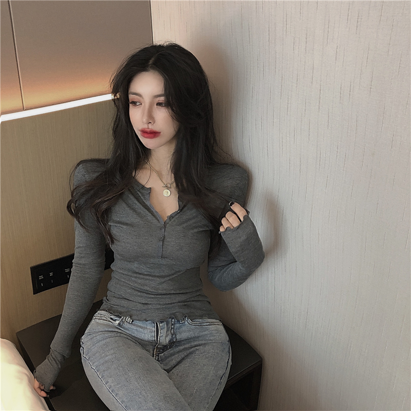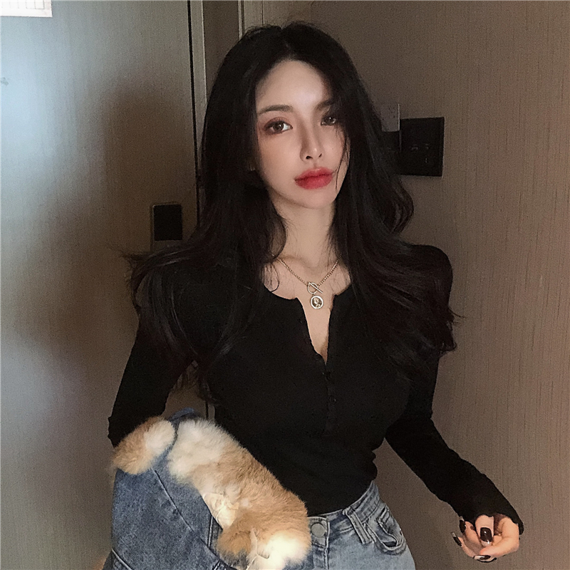 辣妹心機木耳邊半開領紐釦面膜t恤女長袖秋冬新款修身打底衫上衣